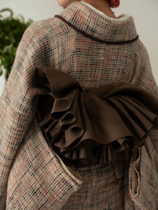 ラムウールを使用したホームスパンのきものと道中着。 糸一本一本をグラデーションで染め分けることで、チェック柄が溶け合うような繊細で奥行きのある表情を生み出しました。ラムウールならではのとろけるような柔らかさが身体を優しく包み込み、細やかに表現されたチェック柄と相まって、着る人の心まであたためてくれる一着です。 Homespun series ジャケットなどに用いられるツイード生地を使用したきものと、きものに合わせるコート「道中着」を製作。 ホームスパンとは、英国生まれの毛織物で、「home(家)」で「spun(紡ぐ)」ことに由来します。もともと羊毛農家が自家用に紡ぎ織ったのが始まりで、厳選した羊毛を手で染め、手で紡ぎ、手織りでゆっくりと仕上げた生地は、柔らかくあたたかみのある風合いが特徴です。 現在では、手しごとの風合いを大切にしたツイードの一種として発展し、日本でも岩手や山形など、羊の飼育が盛んな土地に根づいた産業として受け継がれています。ARCHが大切にする“その土地ならではの手しごと”の魅力に光を当て、世界を見渡す視点を一枚のきものに宿しています。 素材:ラムウール43%、綿28%、オーガニックコットン14%、ナイロン8%、ポリエステル4%、レーヨン3% 仕立:袷 寸法:ご注文確認後、弊店よりご連絡させていただきます。 納期:寸法確定後、約3週間 ※価格は仕立て代込みのお値段です。 ※クリーニングは実店舗でも承っております。お気軽にご相談ください。 ※店舗と在庫を共有しており、完売の場合もございます。 Homespun Kimono and Dochugi Coat in Lambswool This kimono and dochugi coat from the Homespun series are crafted using lambswool, known for its exceptional softness. Each yarn is gradient-dyed individually, allowing the check pattern to blend softly into itself, creating a delicate design with remarkable depth. The melting softness of lambswool gently wraps the body in warmth, while the finely expressed check pattern adds visual richness. Together, they create a garment that feels as comforting to wear as it is beautiful to look at. Homespun Series This series features kimono made from tweed fabric often used for jackets, along with a dochugi coat designed to be worn over kimono. Homespun is a wool textile that originated in Britain. The name comes from “home” and “spun,” referring to yarn that was spun at home. Originally, sheep farmers spun and wove wool for their own use. Carefully selected wool was dyed by hand, spun by hand, and slowly handwoven, resulting in a fabric known for its softness and warmth. Today, homespun has evolved as a type of tweed that preserves the character of handcraft. In Japan, it has also developed as a local industry in regions such as Iwate and Yamagata, where sheep farming is common. This piece reflects ARCH’s philosophy of celebrating craft traditions rooted in specific places, bringing a global perspective into a single kimono. Material: 43% Lambswool, 28% Cotton, 14% Organic Cotton, 8% Nylon, 4% Polyester, 3% Rayon Construction: Lined (Awase) Measurements: Our store will contact you after order confirmation. Delivery: Approximately 3 weeks after measurements are finalized. Price includes tailoring. Cleaning is available at our physical store. Please feel free to inquire. Inventory is shared with our store; items may sell out.