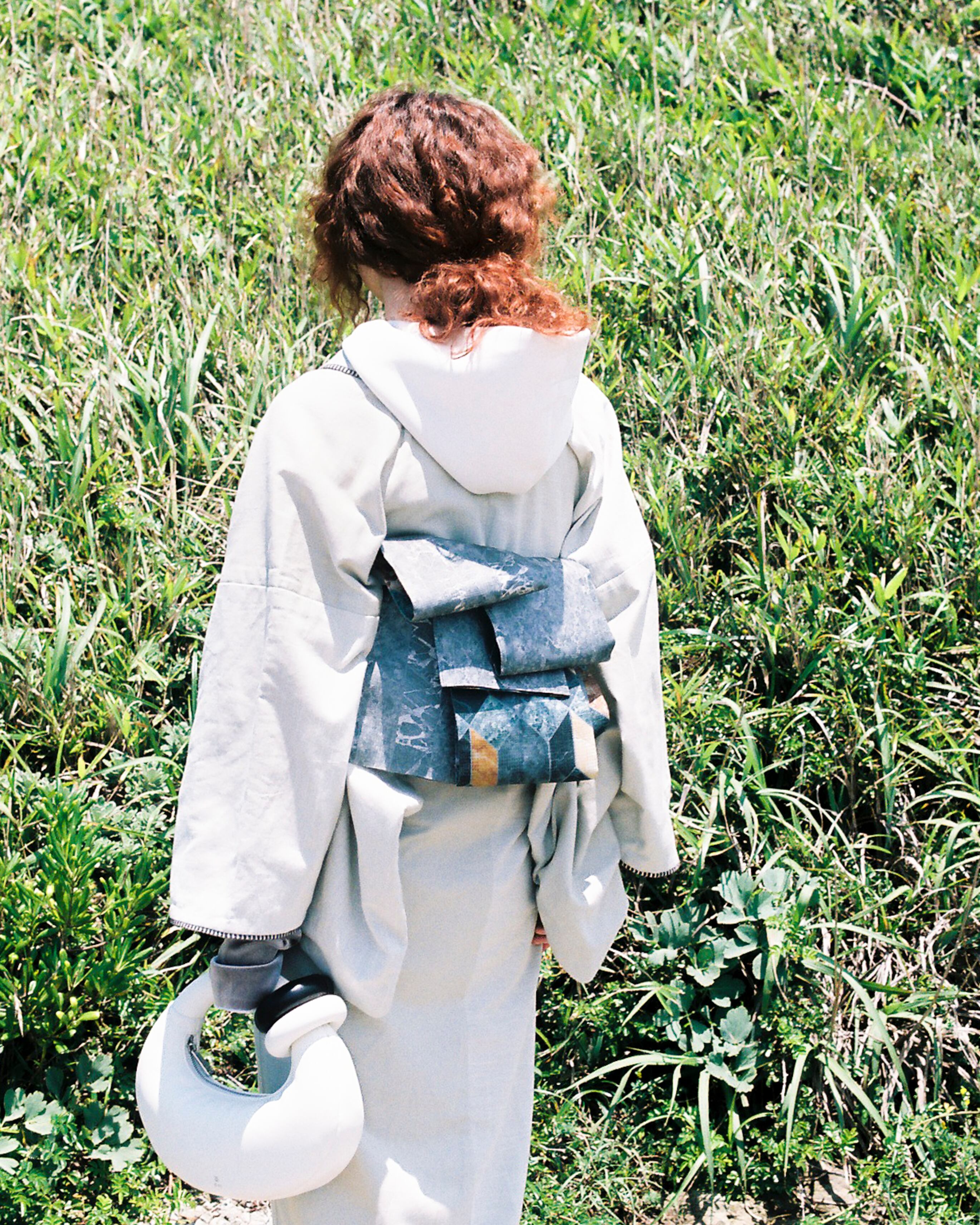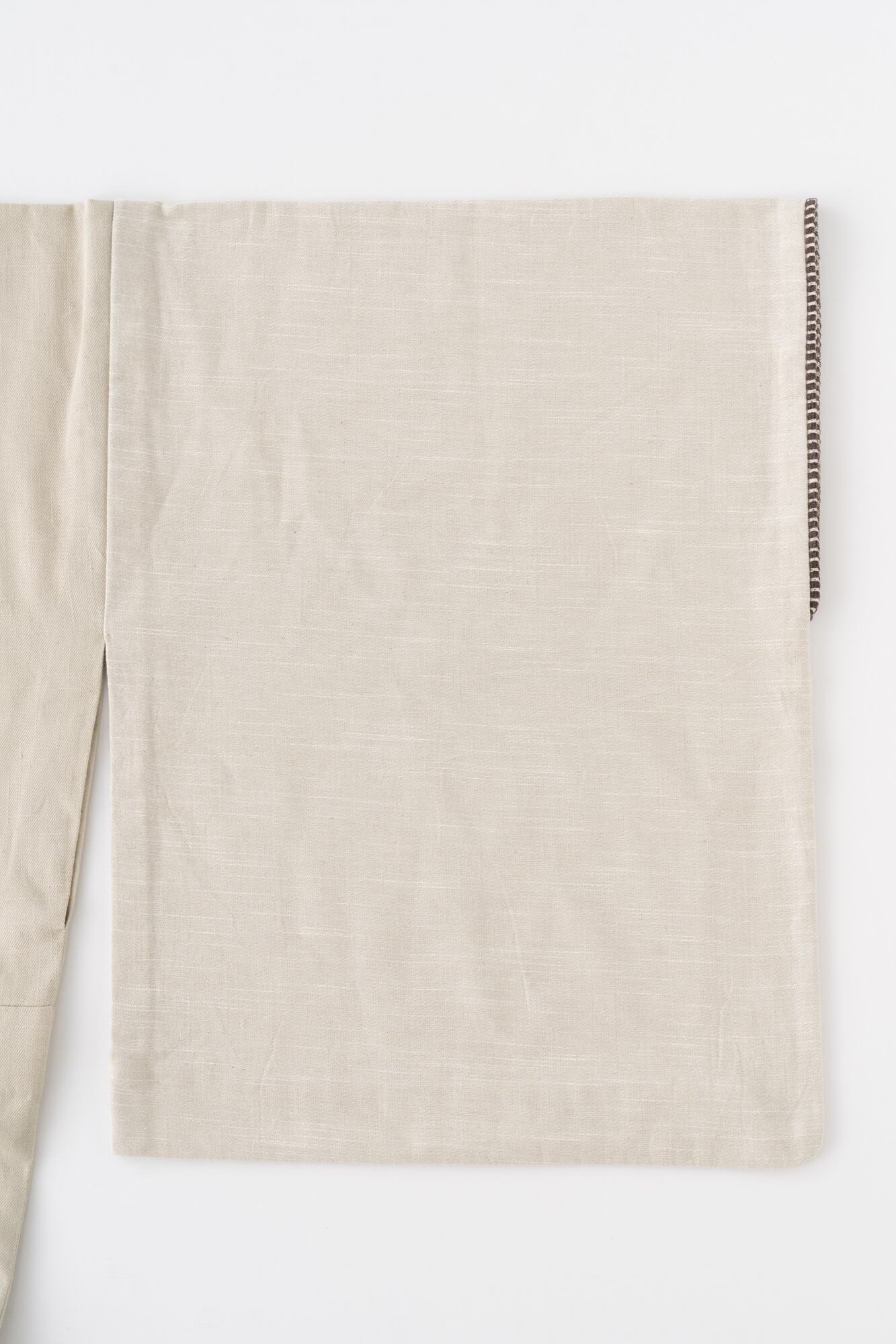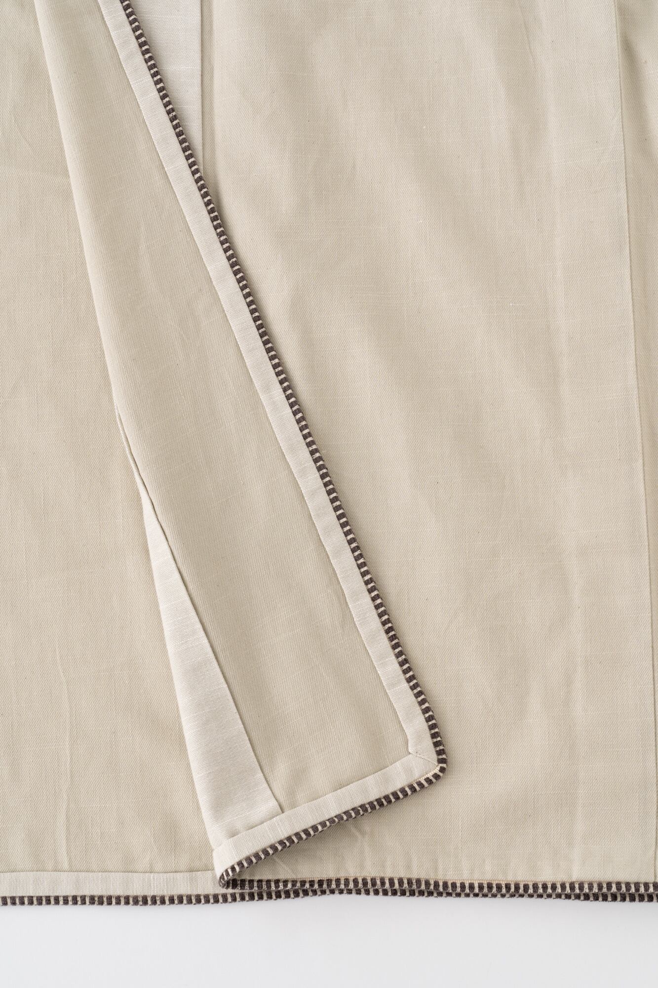 デニムの織り方「綾織」を用いた片貝木綿。生地の表裏で色味が異なるため、仕立ての際に衿や袖の色を反転させることで、オリジナリティあふれる一着に。さらに、衿・袖口・裾にあしらったフリンジのパイピングがアクセントとなり、秋冬らしい装いを演出します。