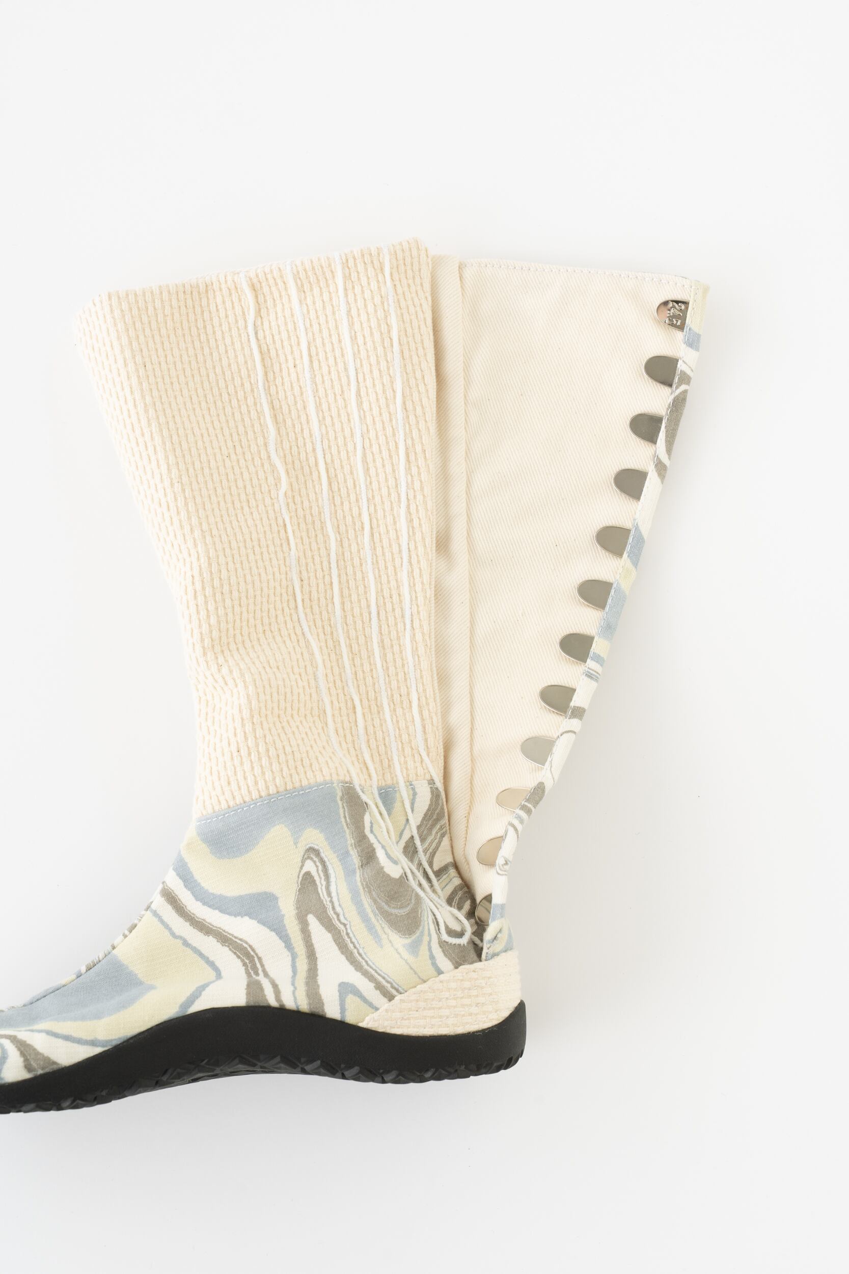 片貝木綿のタフな生地を活かし、ロングブーツのような地下足袋をつくりました。