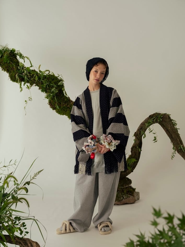 裾に絣糸のフリンジをあしらったきものと羽織。一本一本染め分けられた絣糸の魅力を視覚的に表現しました。冬に着たくなるふわふわの肌触りで、思わず触れたくなる愛らしい素材感に包まれます。モール糸ならではのリラックス感と、“さんち”のつくり手の個性を活かした、まるでトリックアートのようなストライプ柄をお楽しみください。