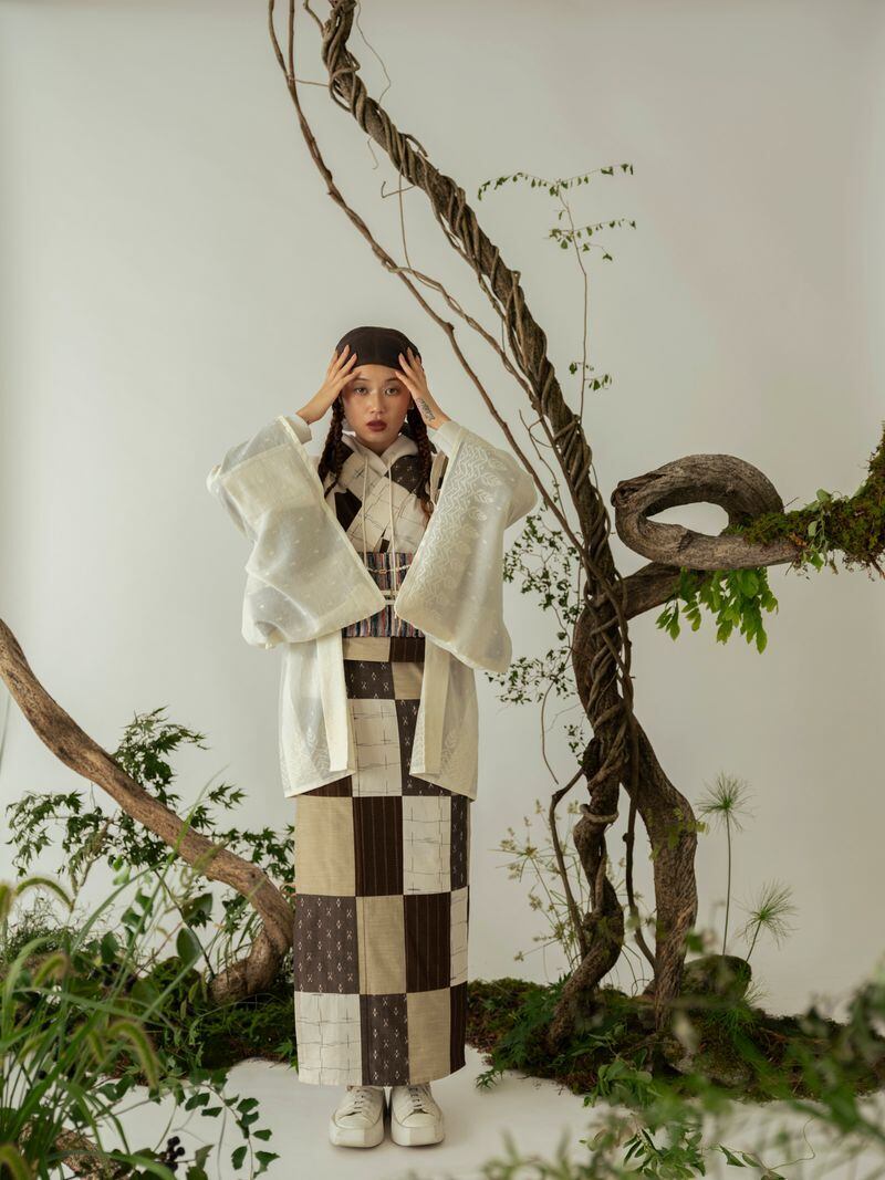 パッチワークによりさらにカジュアルな印象を加えているので、長襦袢はもちろん、タートルネックやスニーカーなど日常のアイテムとも馴染みやすく、組み合わせ次第で新鮮な着こなしをお楽しみいただけます。