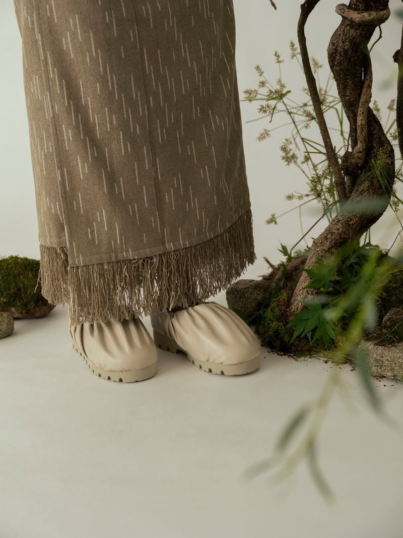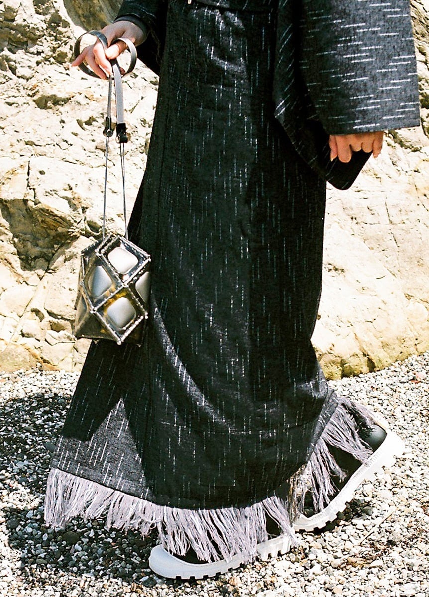 邪気を払う厄除けのお守りとしても使われるフリンジ。絣の魅力を最大限に伝えたいという想いから、裾に絣のフリンジをあしらい、目で見ても楽しめるように仕立てました。