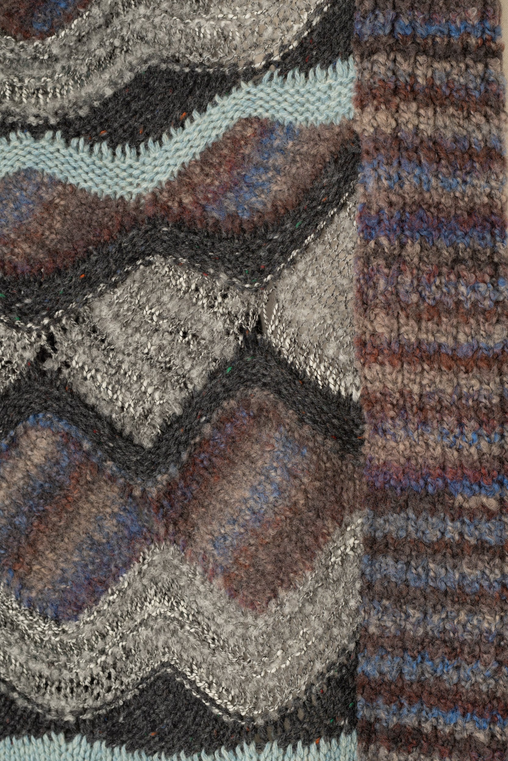 フェアアイルの特徴である多色使いを、一本の糸を多色に染め分けた糸を含む、5種類の糸で表現しました。糸の重なりや色の変化が生み出すカラフルな表情は、島の長く暗い冬を明るく彩るために生まれたとも言われています。