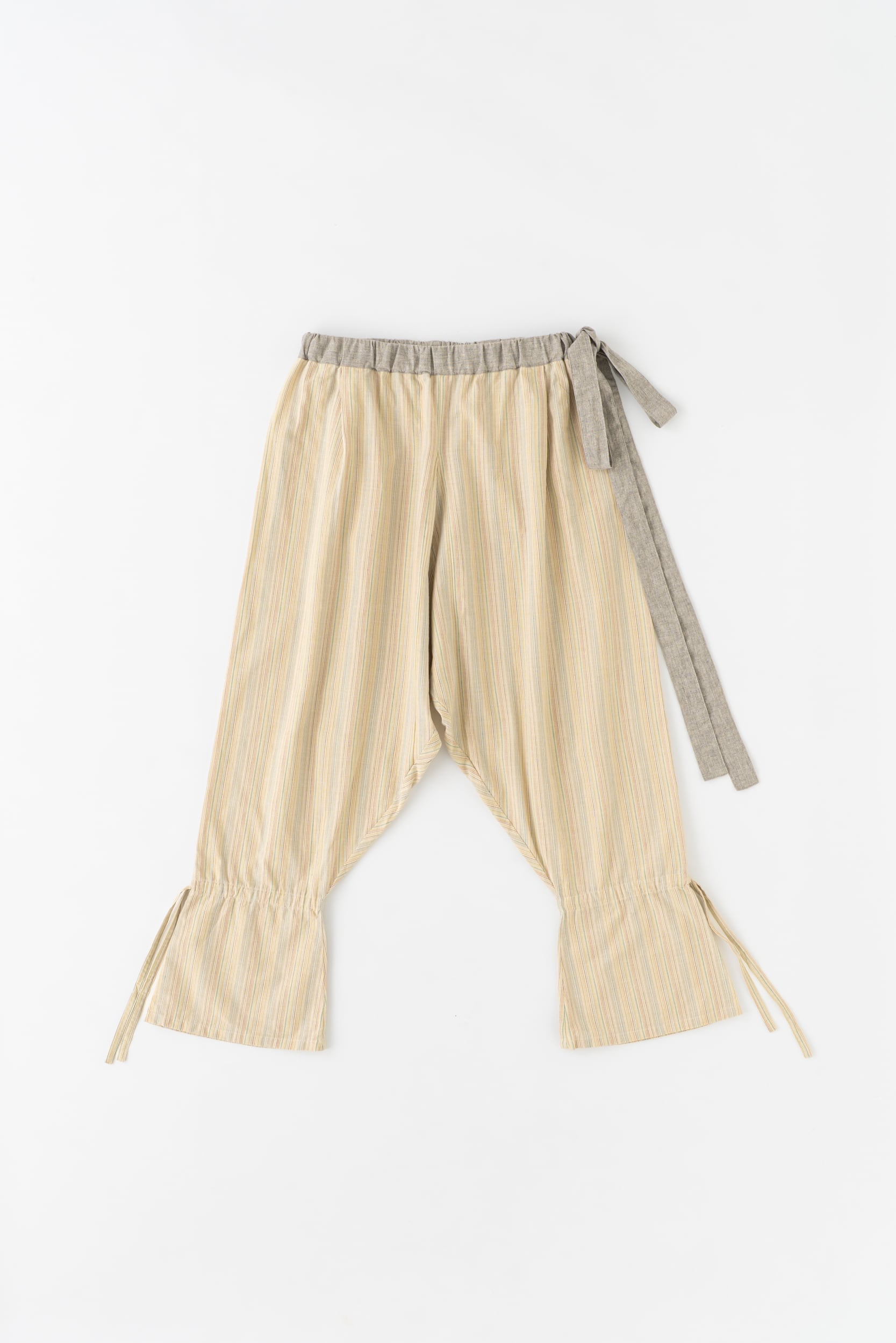 昔ながらのもんぺの形をベースにサイズ感を調節し、ウエストや裾にリボンをあしらい、飛び跳ねたくなるような遊び心を加えました。