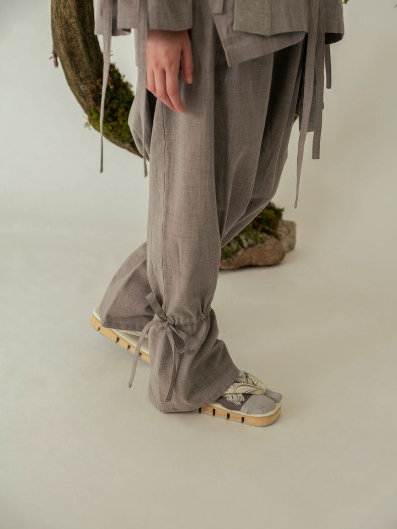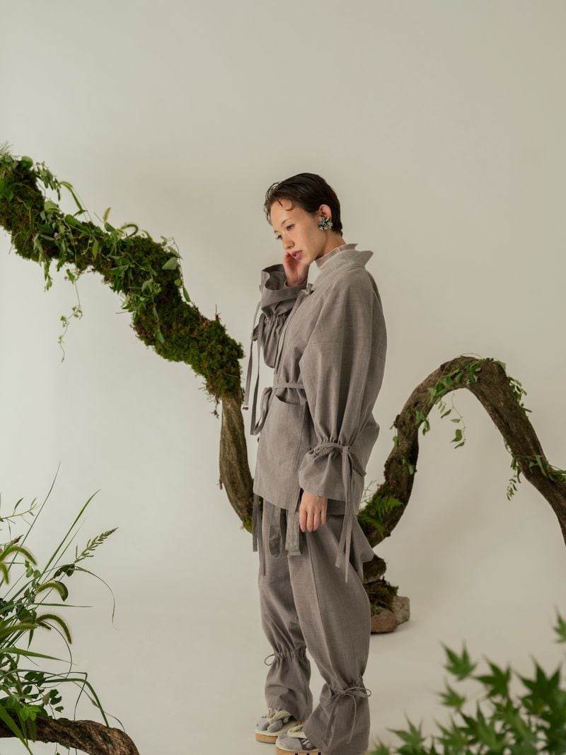 昔ながらのもんぺの形をベースにサイズ感を調節し、ウエストや裾にリボンをあしらい、飛び跳ねたくなるような遊び心を加えました。