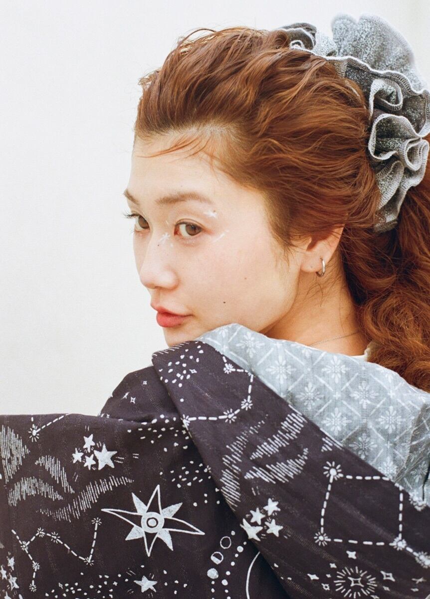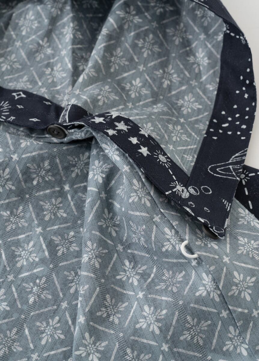 黒板に描いた天文図のような柄と、マジョリカタイルのような模様をゆかたらしいカラーで染めています。リバーシブルで両面染められた生地は、裏地をつけたかのように裏面にも柄があるため、風などでめくれた時や脱いだ時もおしゃれです。