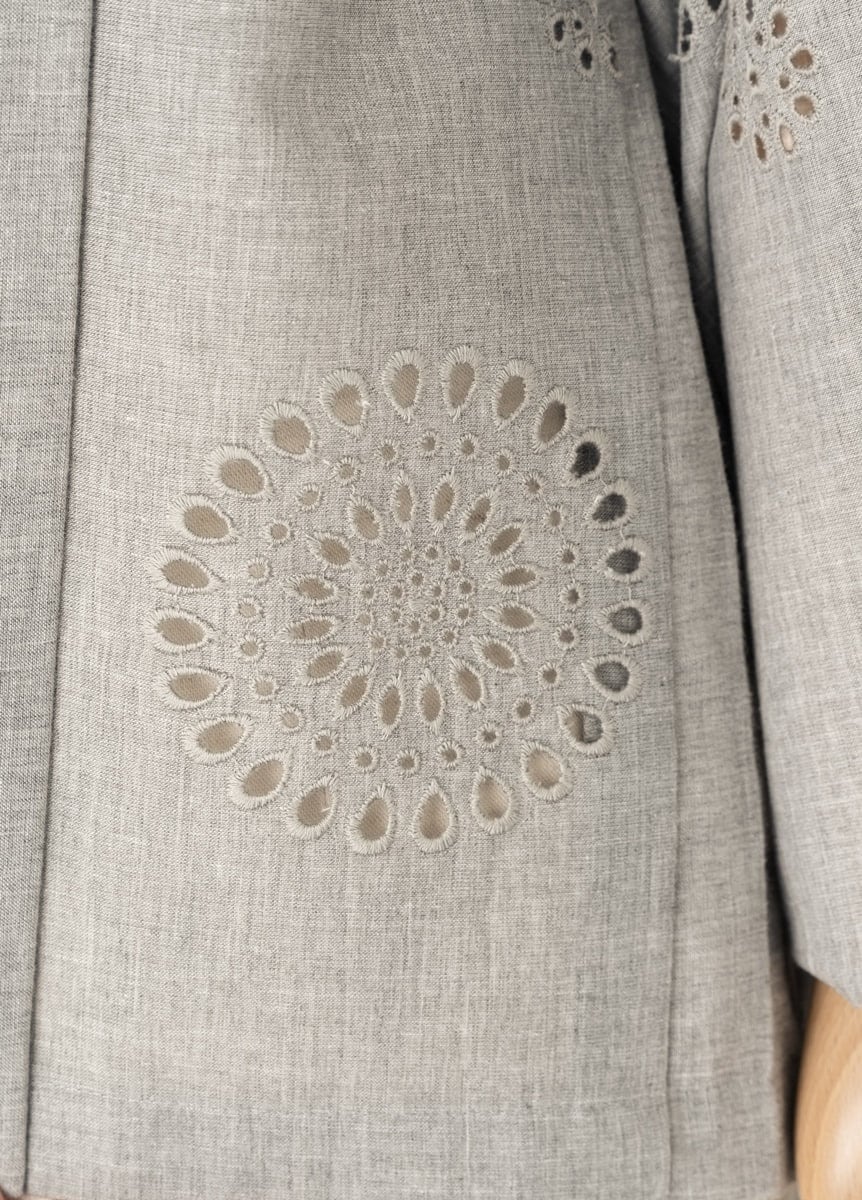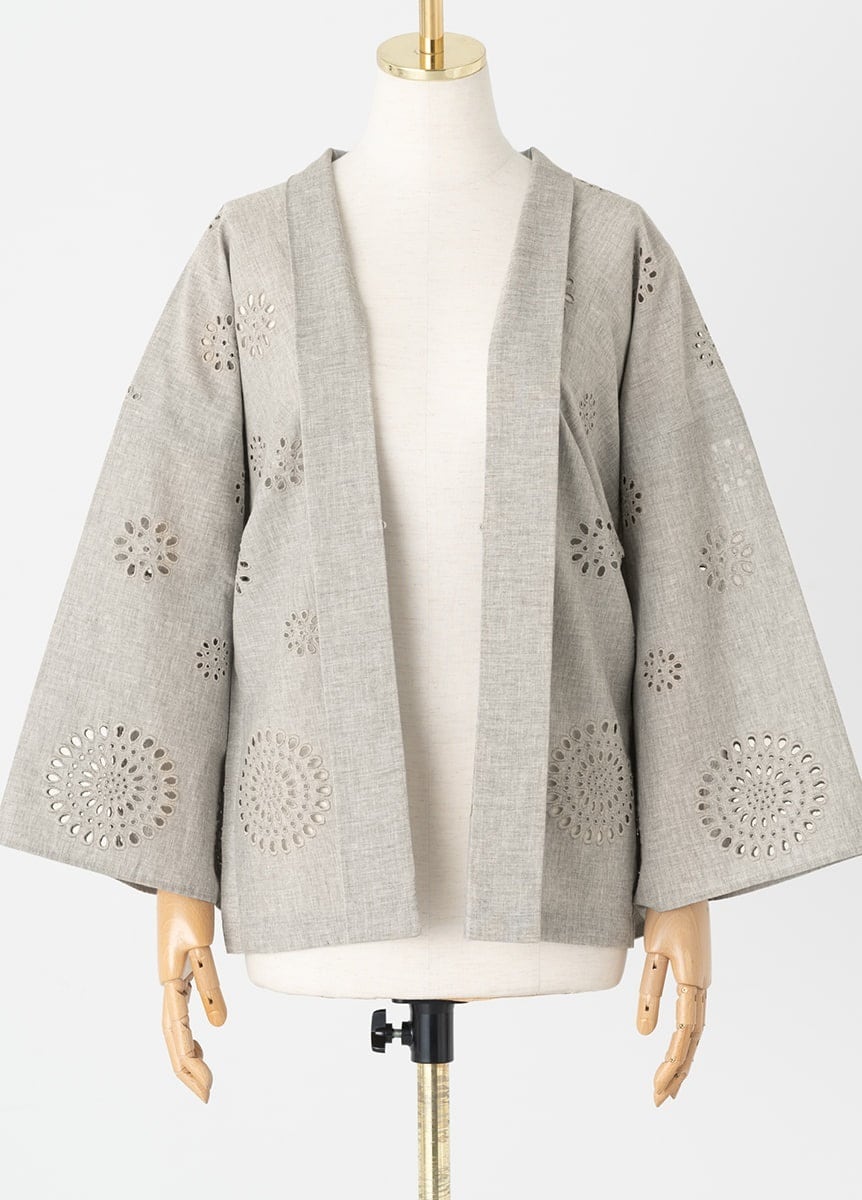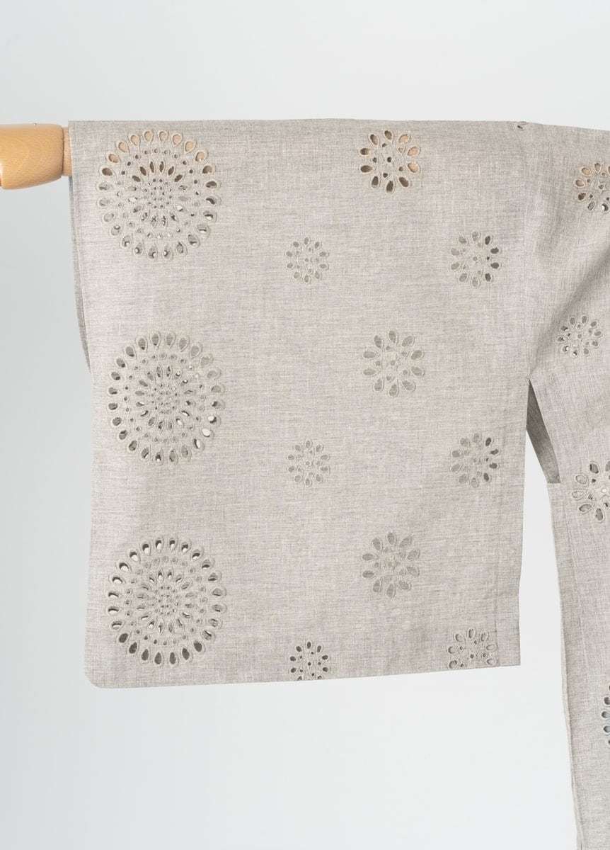 ナチュラルな風合いの麻の生地に刺繍を施し、綿レースのような軽やかな雰囲気に仕上げました。真夏に洋服を着た上でも心地よくお召いただけます。