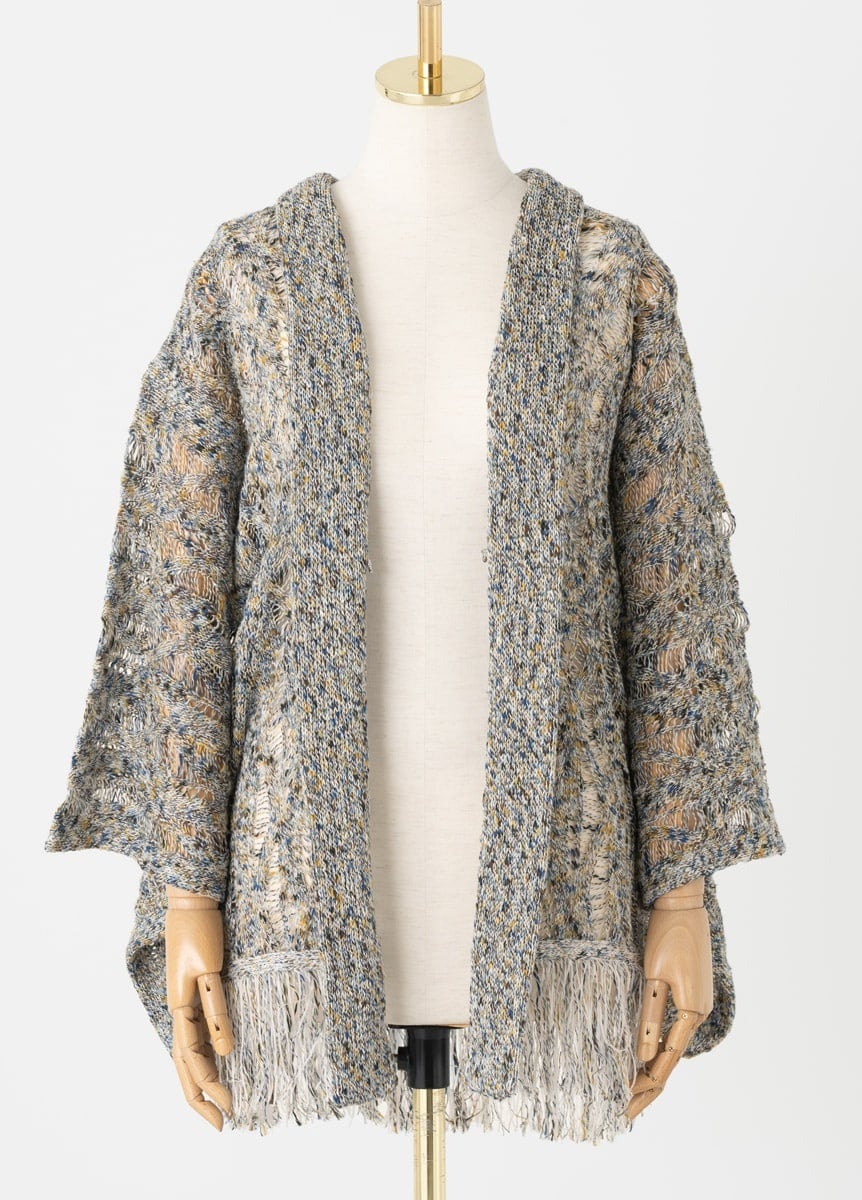 The fringe at the hem mixes two types of yarn to create volume, giving a delicate, fluttering movement with every step. Enjoy the soft, airy texture and silhouette that distinguishes it from lace haori.