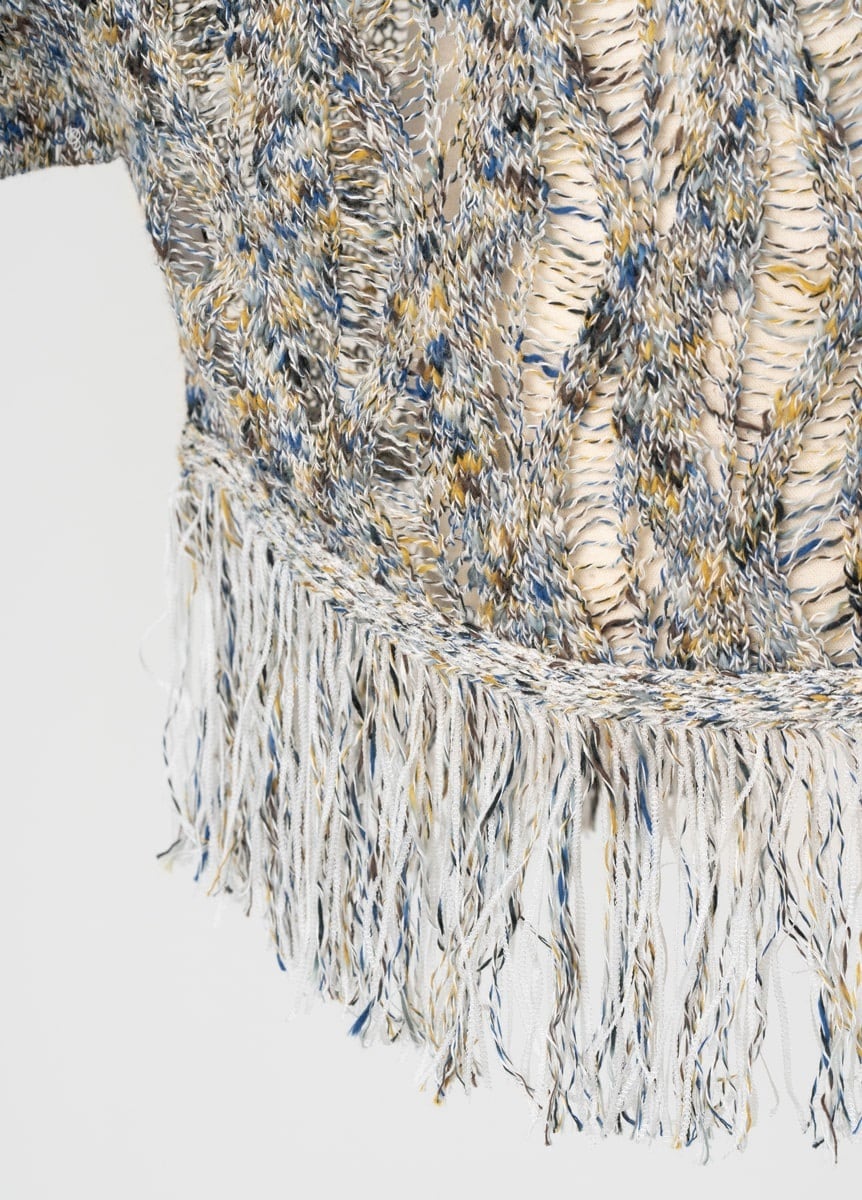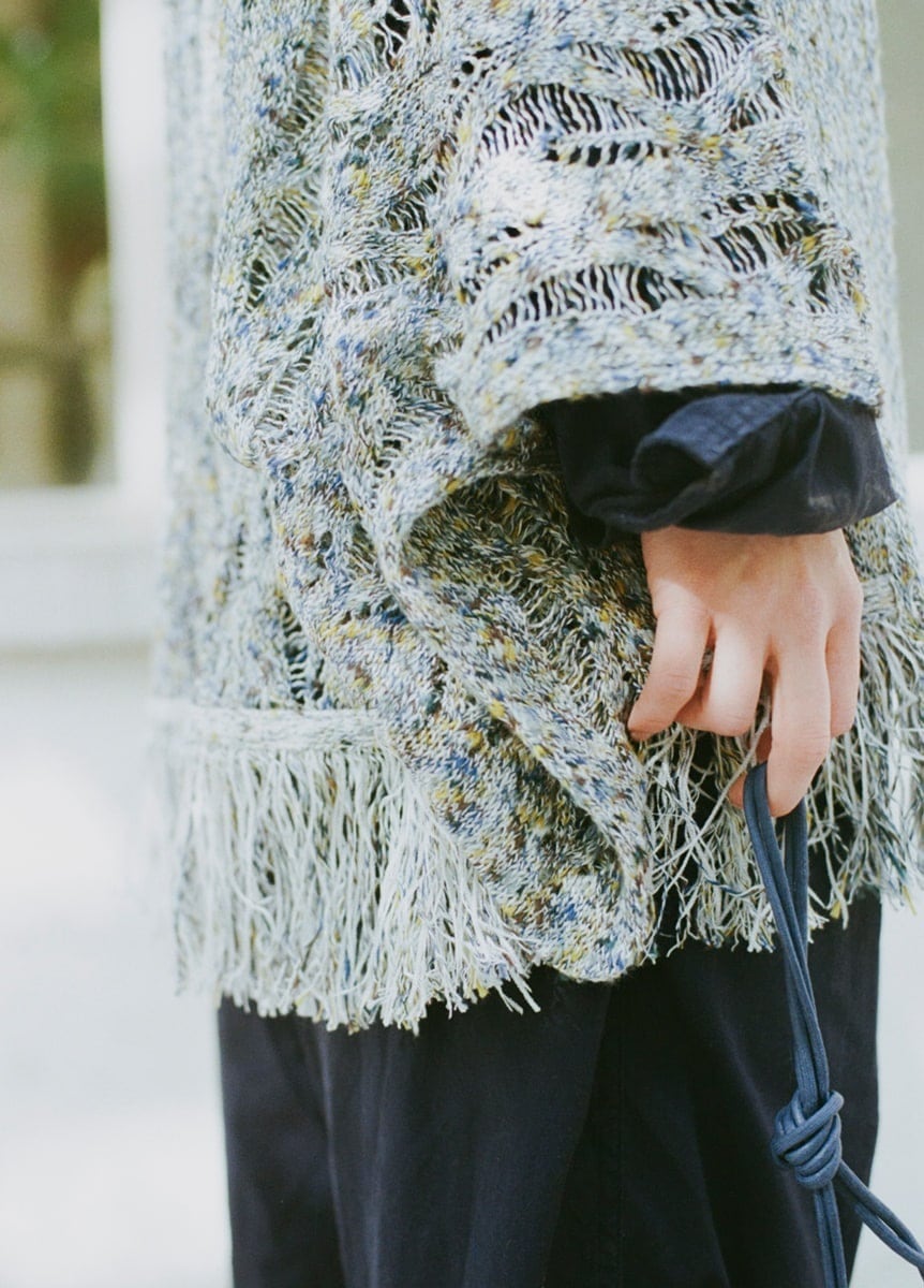 裾部分のフリンジには2種類の糸を混ぜてボリュームを出しているので、歩くたびにひらひらと動くのがポイント。