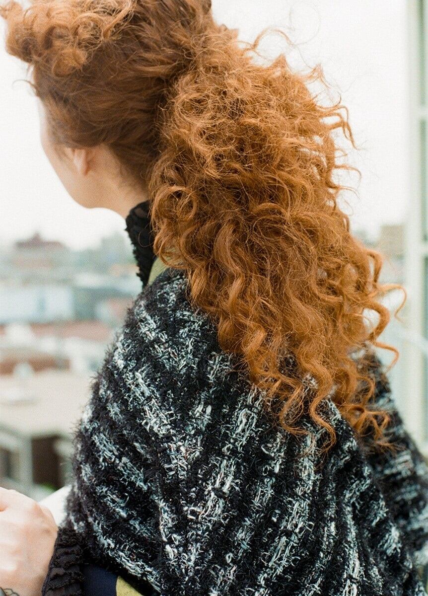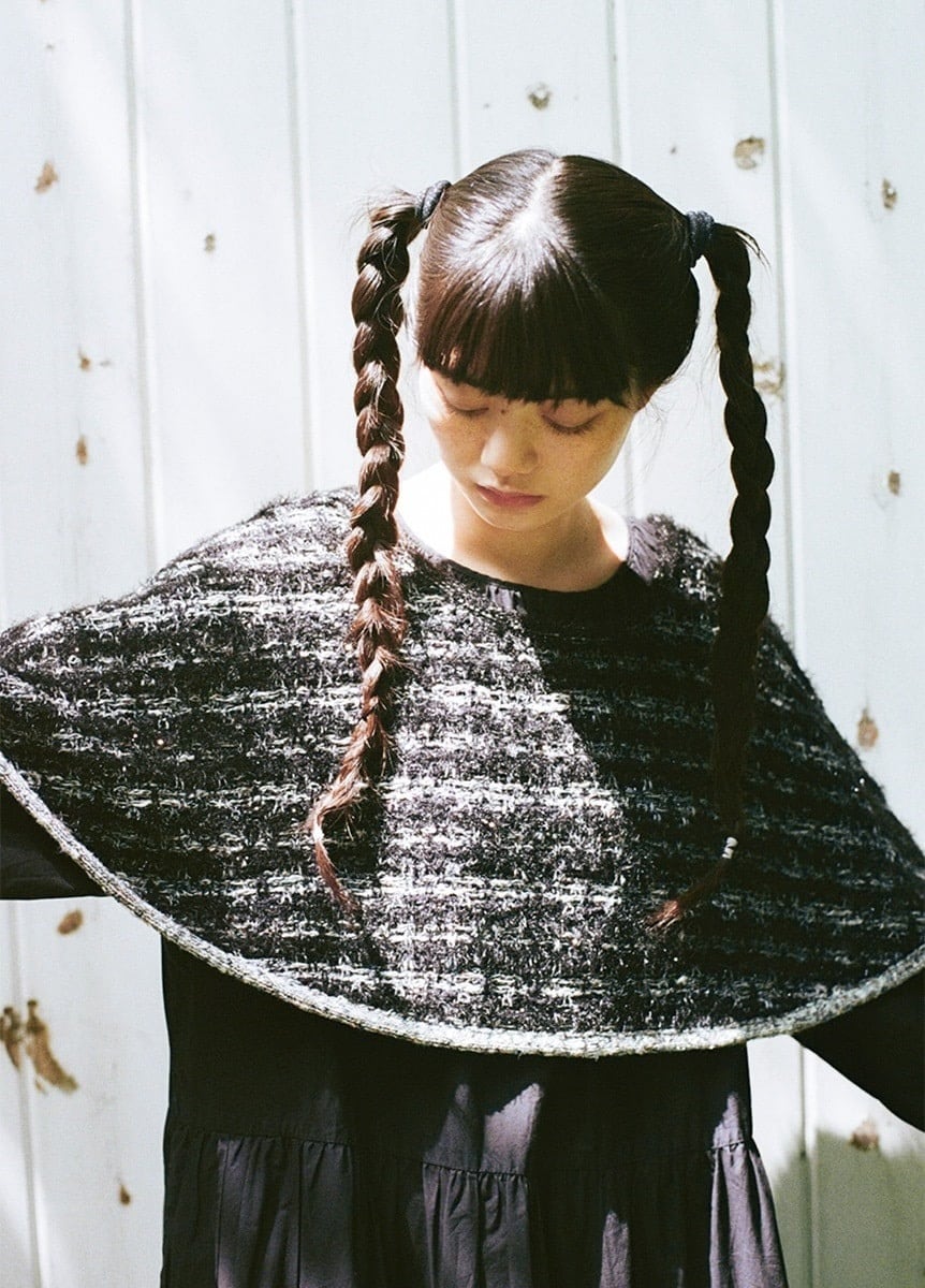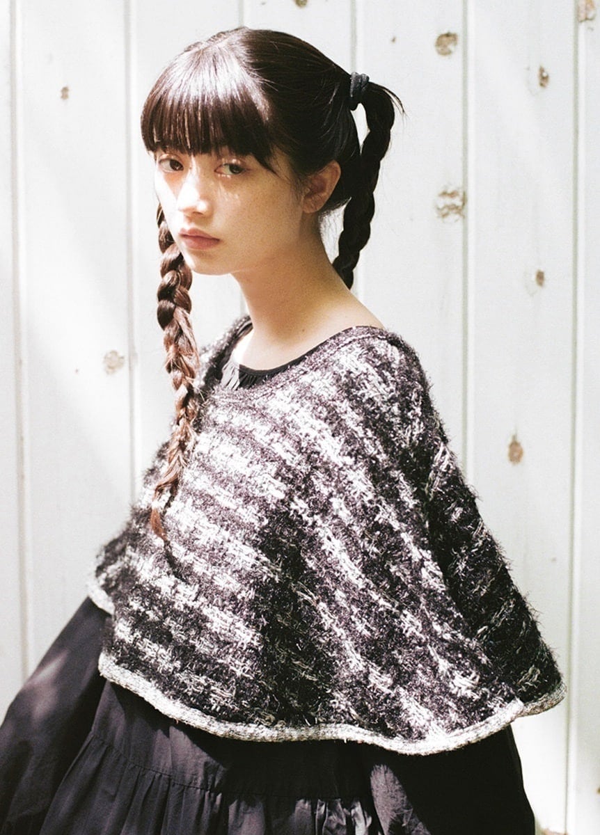 山形県の老舗ニットメーカー「米冨繊維」と、一瞬でコーディネートに特別感を与えてくれるポンチョをつくりました。「米富繊維」の看板と言えるニットツイードは、毛足の長い糸やラメが特徴の糸を編み込んでいるため、フォーマルな雰囲気にも合う生地感となっています。