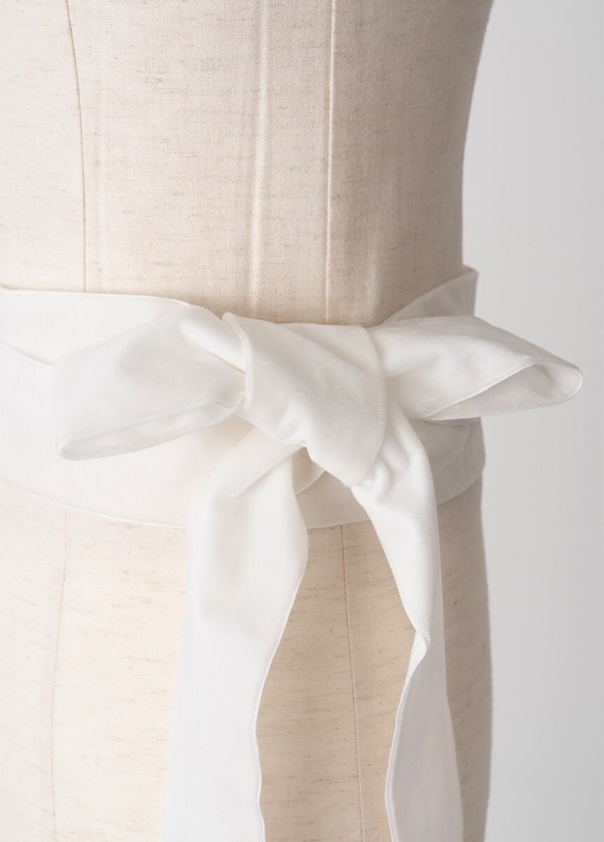 リボン部分は特別感を感じるベルベットを用いています。ティアードスカートのような広がりや、斜めに流れる裾のラインでスタイルアップができ、コーディネートのポイントになります。