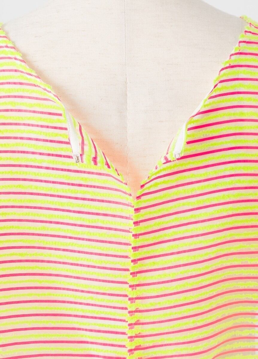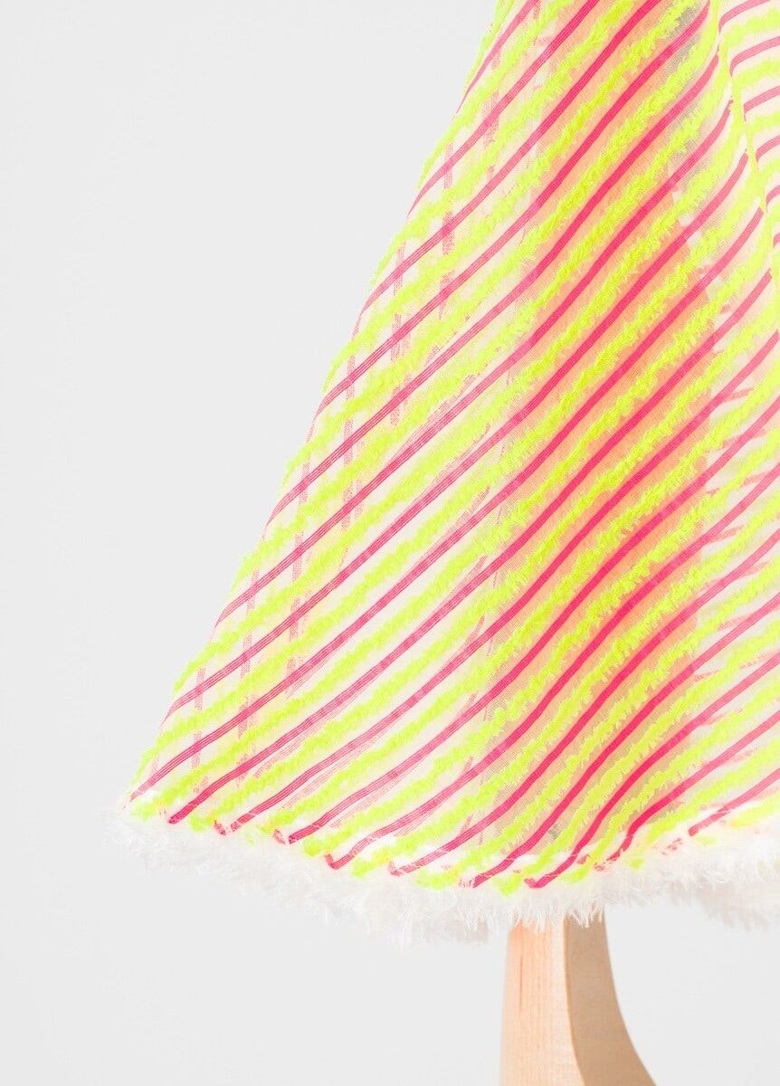 創業128年を迎え、世界的メゾンからも信頼される米沢織の織元の方と共に製作しました。イエローのファーが織り込まれた贅沢なシルクオーガンジーを用いることで、ポップな印象に対し、華やかさや上品さも兼ね備えています。オーガンジーの透け感×ファーの組み合わせは、季節を問わず、幅広い用途でお使いいただけます。