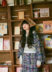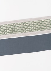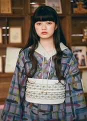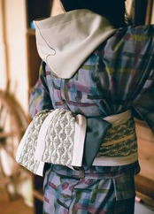 REシリーズ…元の素材を活かして生まれ変わらせたリメイクシリーズ。雪が降っているようなイメージを与えてくれるシンプルなあられ縞模様の着物生地に、毛羽感のあるレースを縫い付けて、冬空のコーディネートを叶える帯をつくりました。