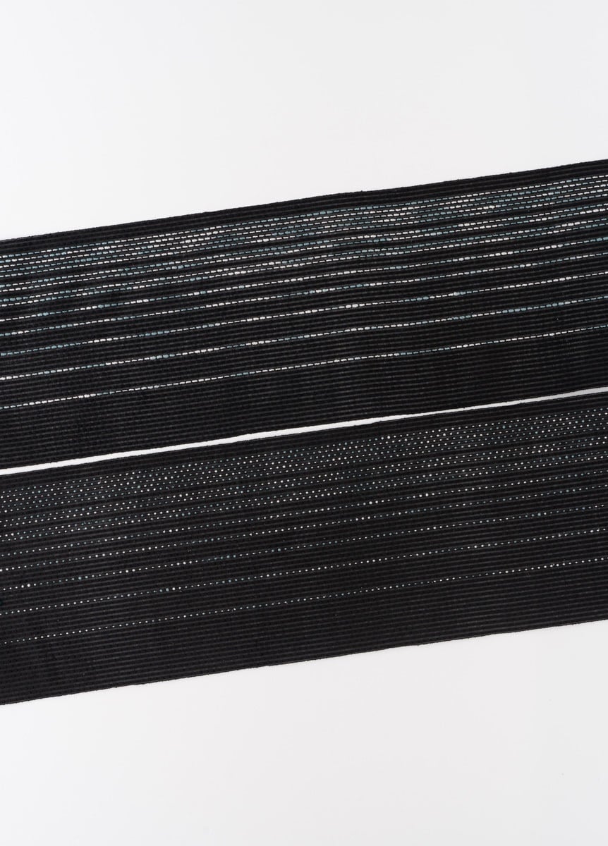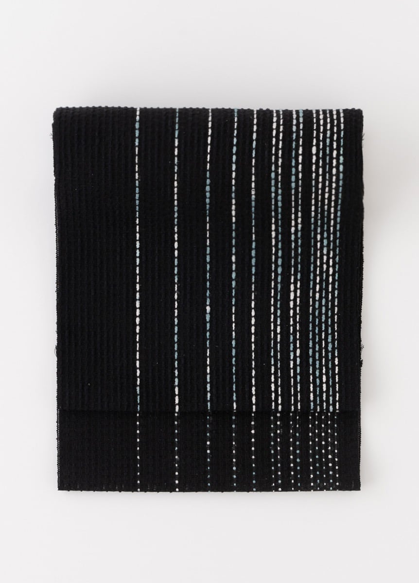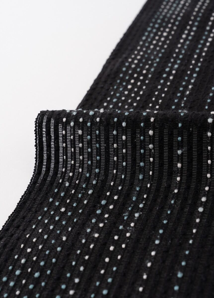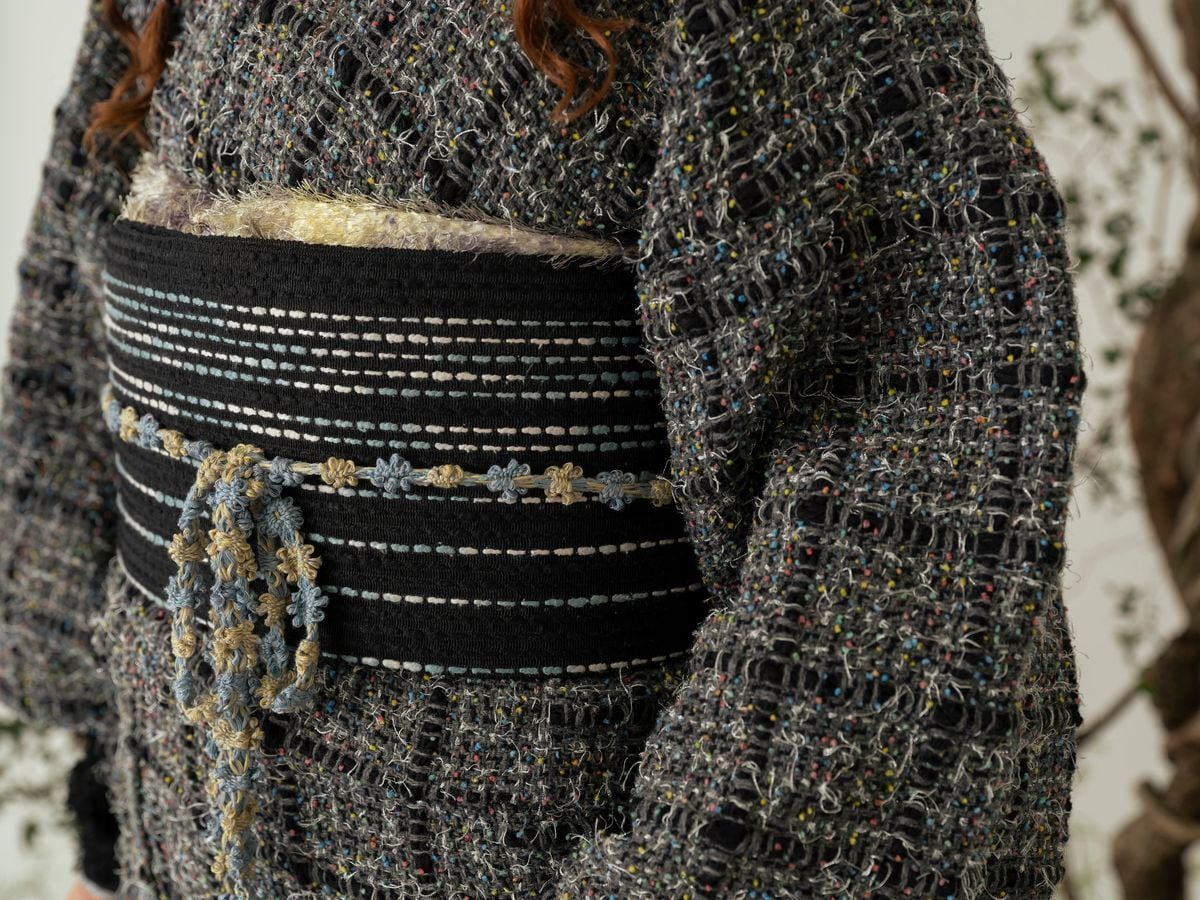 ー夜の星と明の星ーたくさんの方の願いを叶えてくれますように、と想いを込めました。ランダムな太さの絹糸と和紙を使用し、ざっくりとした風合いの織帯です。ランダムに絣(かすり)染めした糸を合わせることで、ぷっくりとした可愛い糸の表情を強調しました。