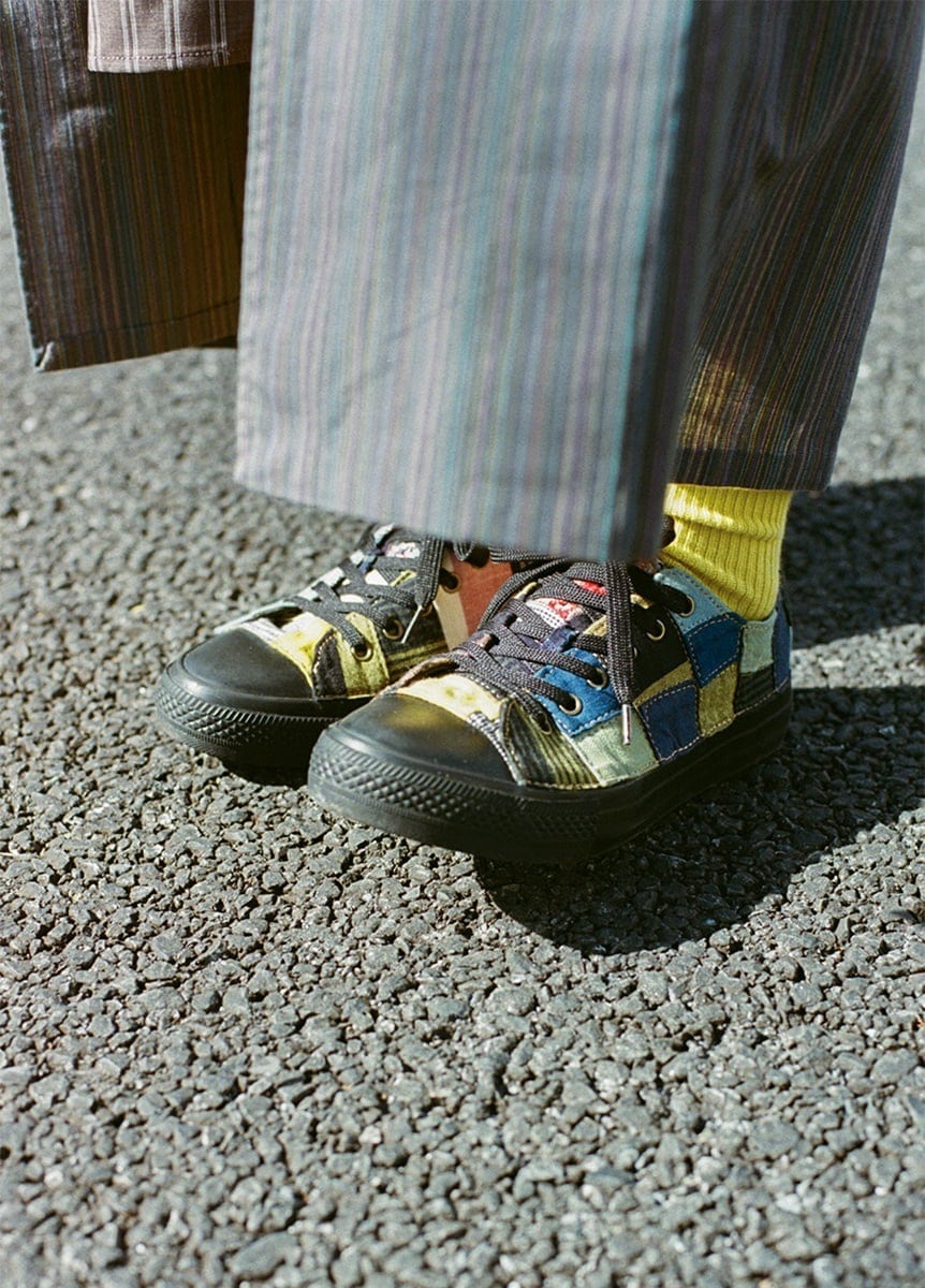 カラフルな残糸とは対照的に、地色は合わせやすい色を組み合わせました。ランダムに配置された残糸が引き立つ、一見シンプルながらこだわりの詰まった一着です。