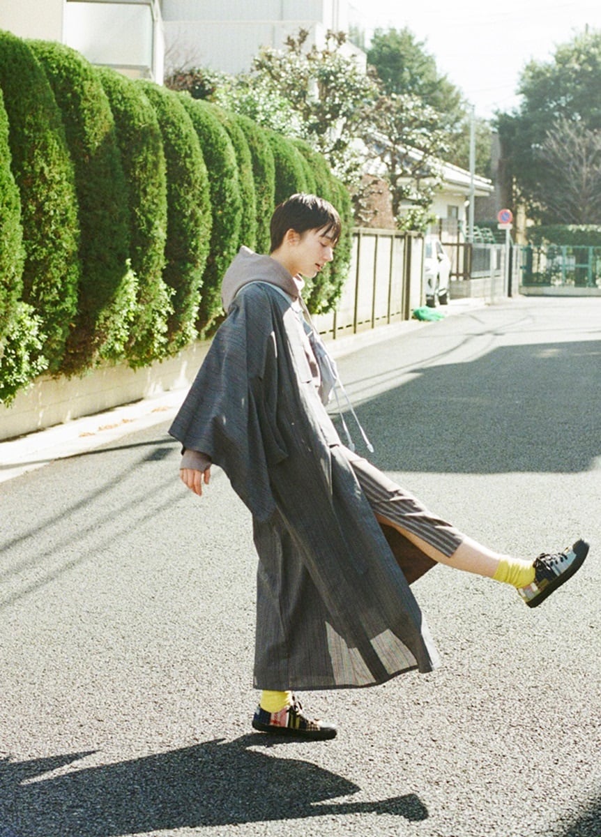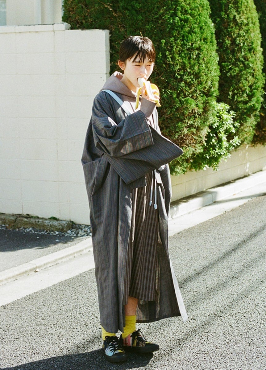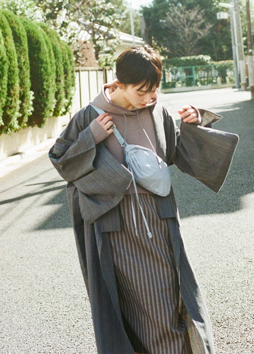 今回初の試みとして麻の糸を使用しており、サラッとした肌触りが特徴です。片貝木綿の凹凸感に加え、光に当てると透け感がよく分かります。真夏はゆかたとして、それ以外のシーズンはアウターやインナー次第で通年ご着用いただけます。