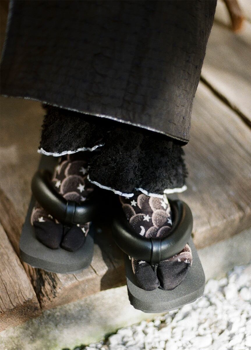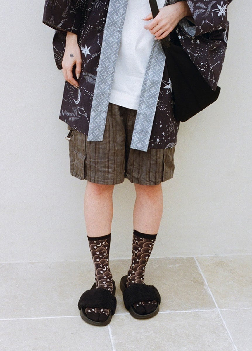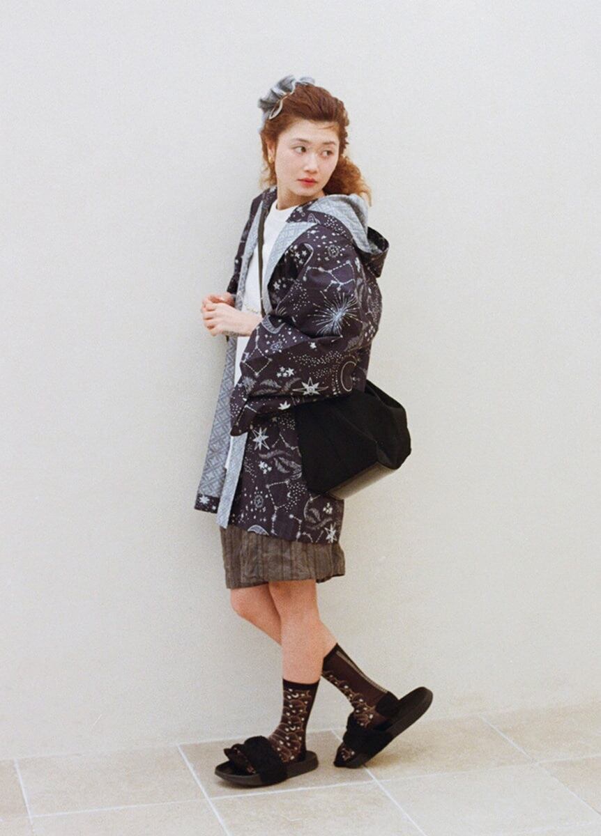 一般的にシンプルなデザインが多い足袋ソックスですが、今回のコラボレーションでは、「Kiwanda」のユニークで唯一無二のテキスタイルデザインと、「KIMONO ARCH」が提案する自由でカジュアルな着こなしが融合し、足先まで見せたくなるようなデザインが完成しました。「Kiwanda」の「古き良きものを愛する」という思想から感じられる懐かしさと、圧倒的にここにしかないと思わせるデザインが、「KIMONO ARCH」のきものと出会い融合することで、新たな世界を創り出します。