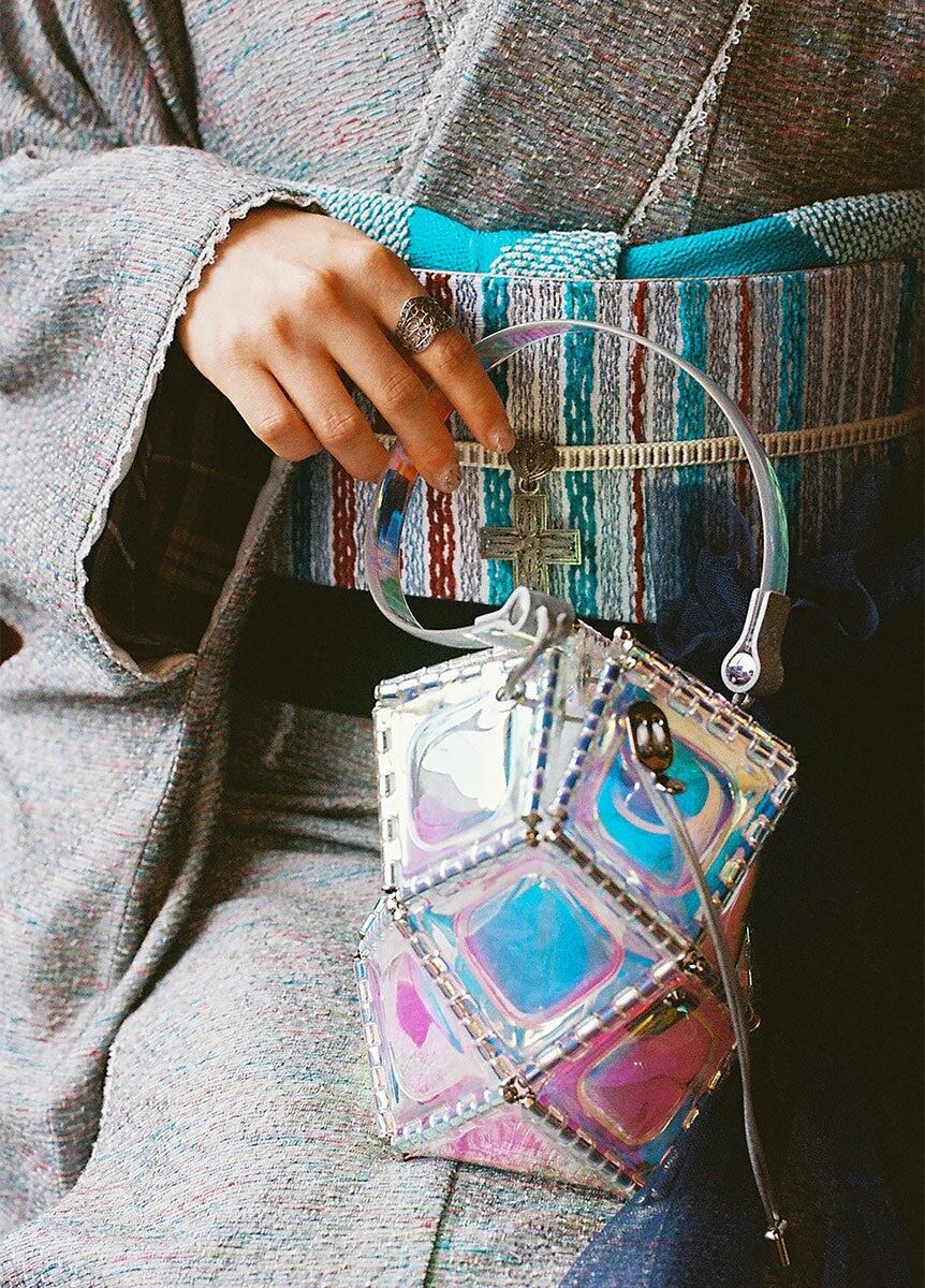 portionーポーションー 魔法の薬を混ぜたとき、色が混ざり合い弾ける瞬間をイメージしました。カラフルで不均一な太さの糸を、細やかに織り込んだふりそでです。怪しげな煙の線のように曖昧でカラフルな色や、不均一な太さの糸から生まれる生地の凹凸感など、見れば見るほどに魅了されていく一着です。