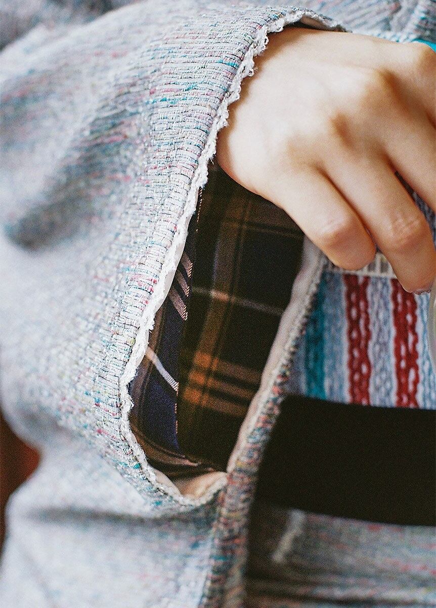ファーテープを衿元や袖口、裾に縫い付けており、より一層特別感を感じさせてくれます。創業128年、世界メゾンからも信頼される「米沢織」のつくり手の方と共に製作いたしました。