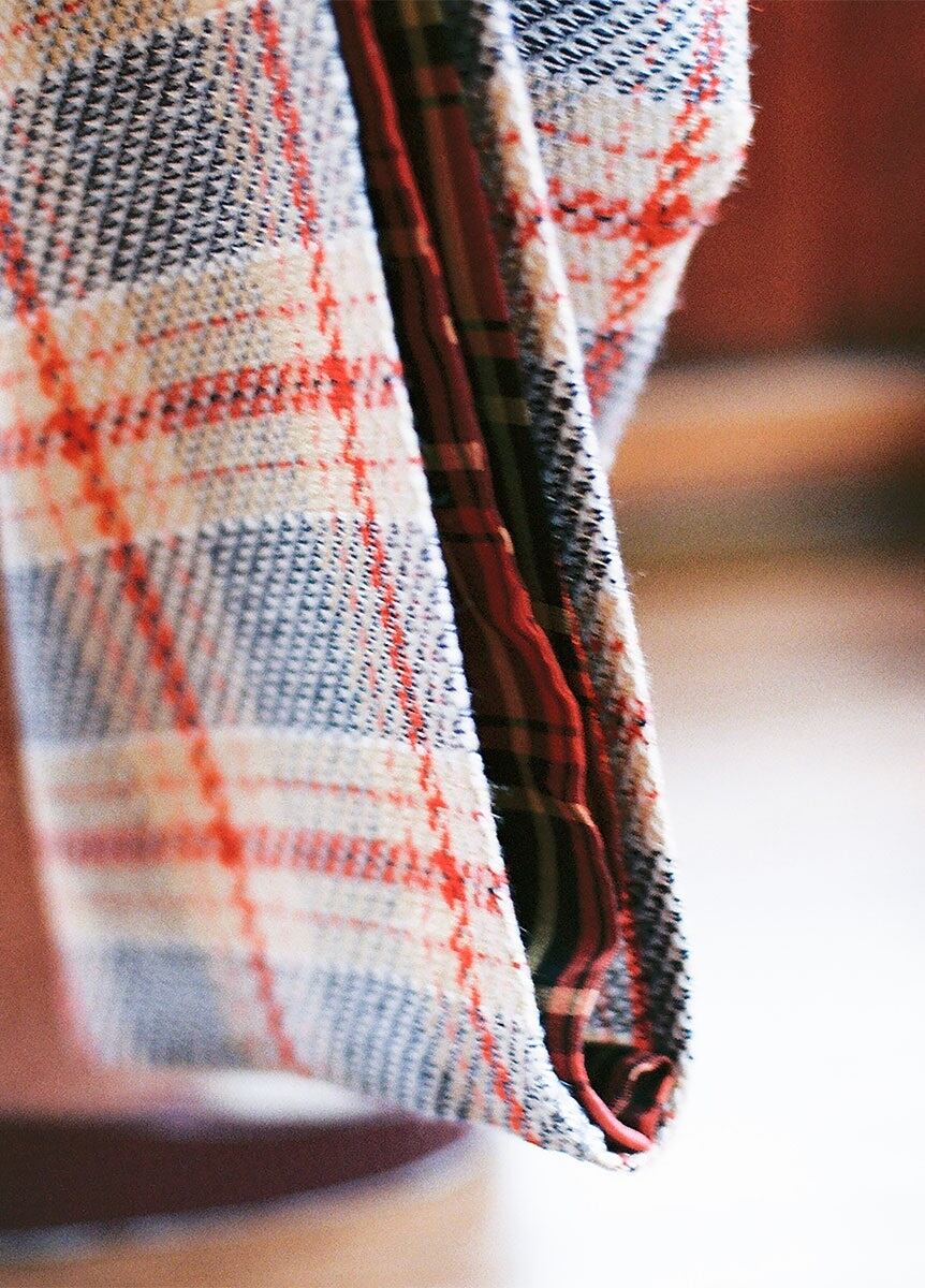 スーツなどにも使用され、きちんとした印象を与えるチェック柄も、大きなサイズ感と配色で華やかな印象を与えてくれます。チェック生地の方は、1887年より高品質なウール生地を作り続けた「三星ウール」の生地を使用しており、トラディショナルな印象を与えます。