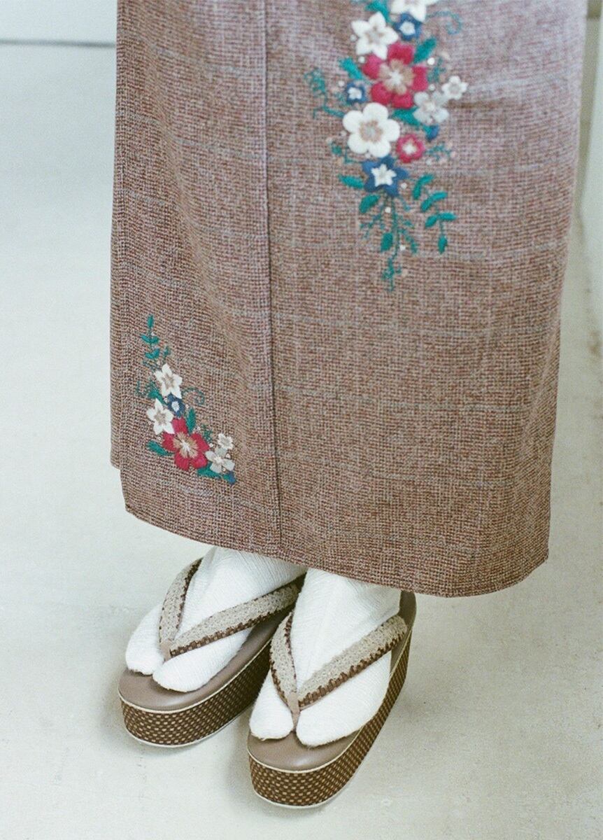 知らなかった世界を知れた時、そんな瞬間は思い出深い記憶として刻まれていく。そんな学びに溢れた記憶を表現しました。きちんとした印象を与えてくれるグレンチェックをベースに、ほんのりお茶目なアクセントカラーと、花束を作ったような刺繍を施しました。何年経ってもその思い出は色褪せずに、今に繋がっているような感覚をイメージしました。