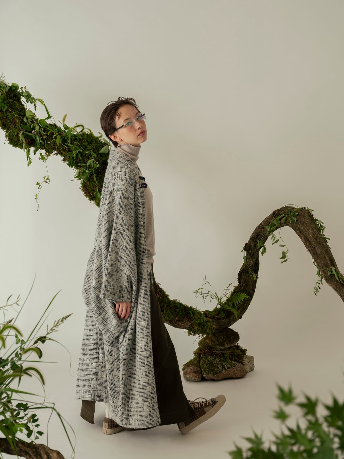 ジャケットなどに用いられるツイード生地を使用したきものと、きものに合わせるコート「道中着」を製作。