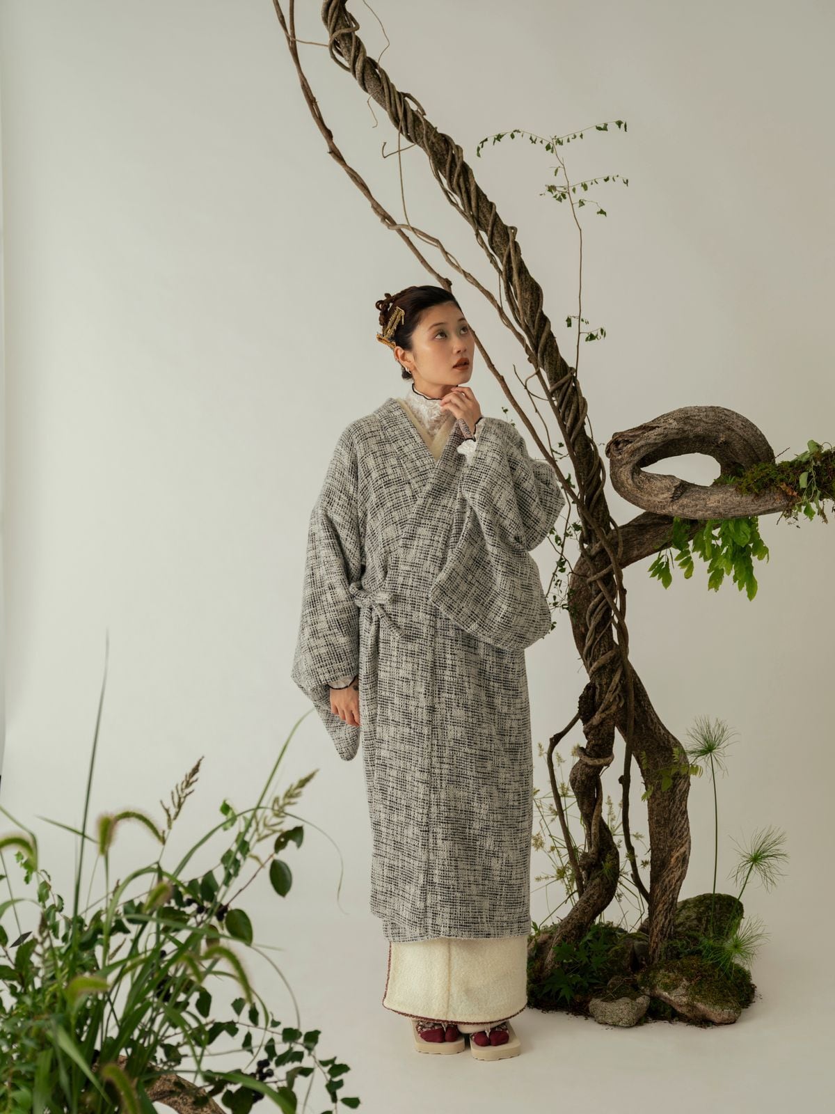 Today, homespun has evolved as a type of tweed that preserves the character of handcraft. In Japan, it has also developed as a local industry in regions such as Iwate and Yamagata, where sheep farming is common. This piece reflects ARCH’s philosophy of celebrating craft traditions rooted in specific places, bringing a global perspective into a single kimono.