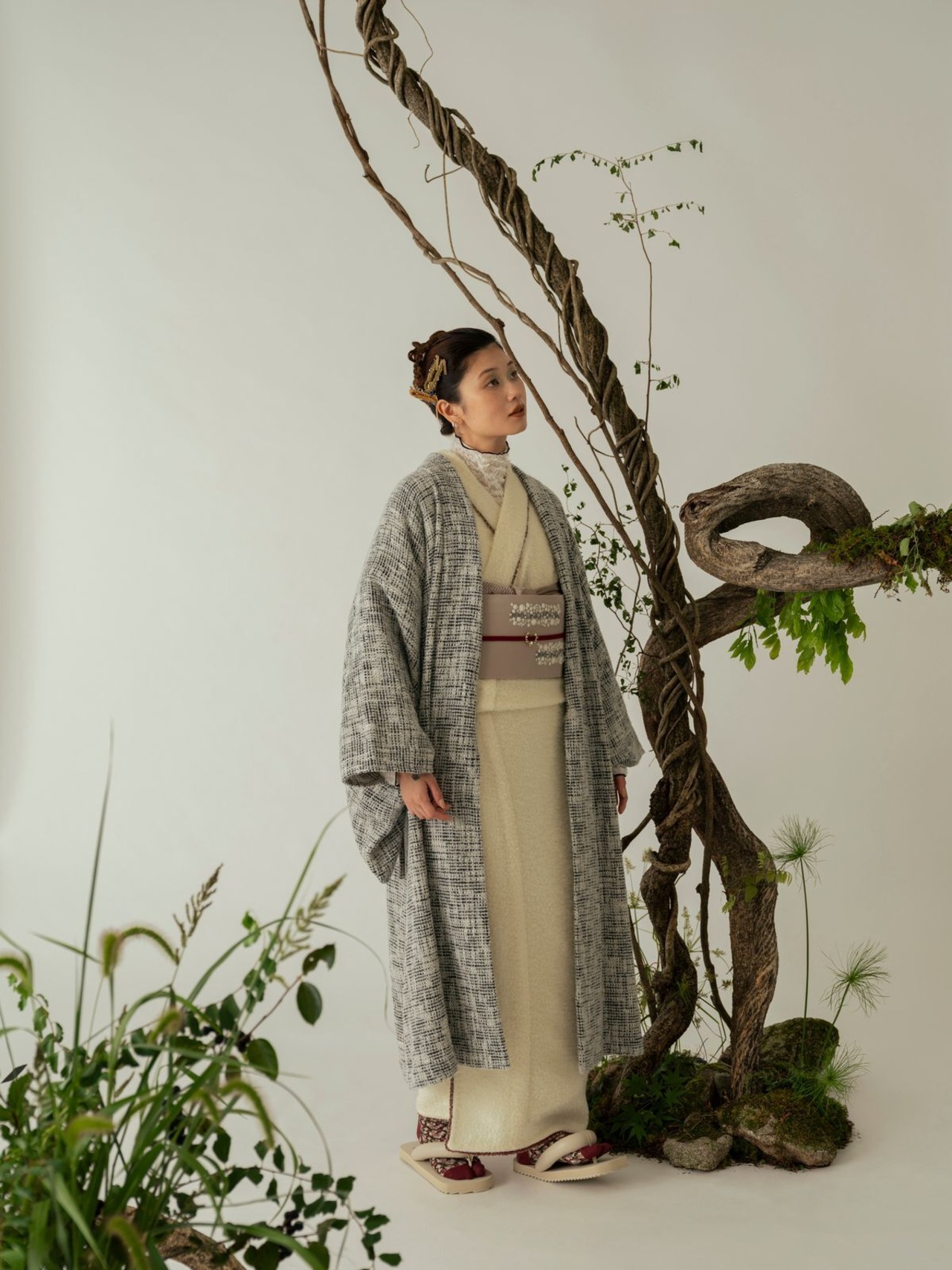 This series features kimono made from tweed fabric often used for jackets, along with a dochugi coat designed to be worn over kimono.