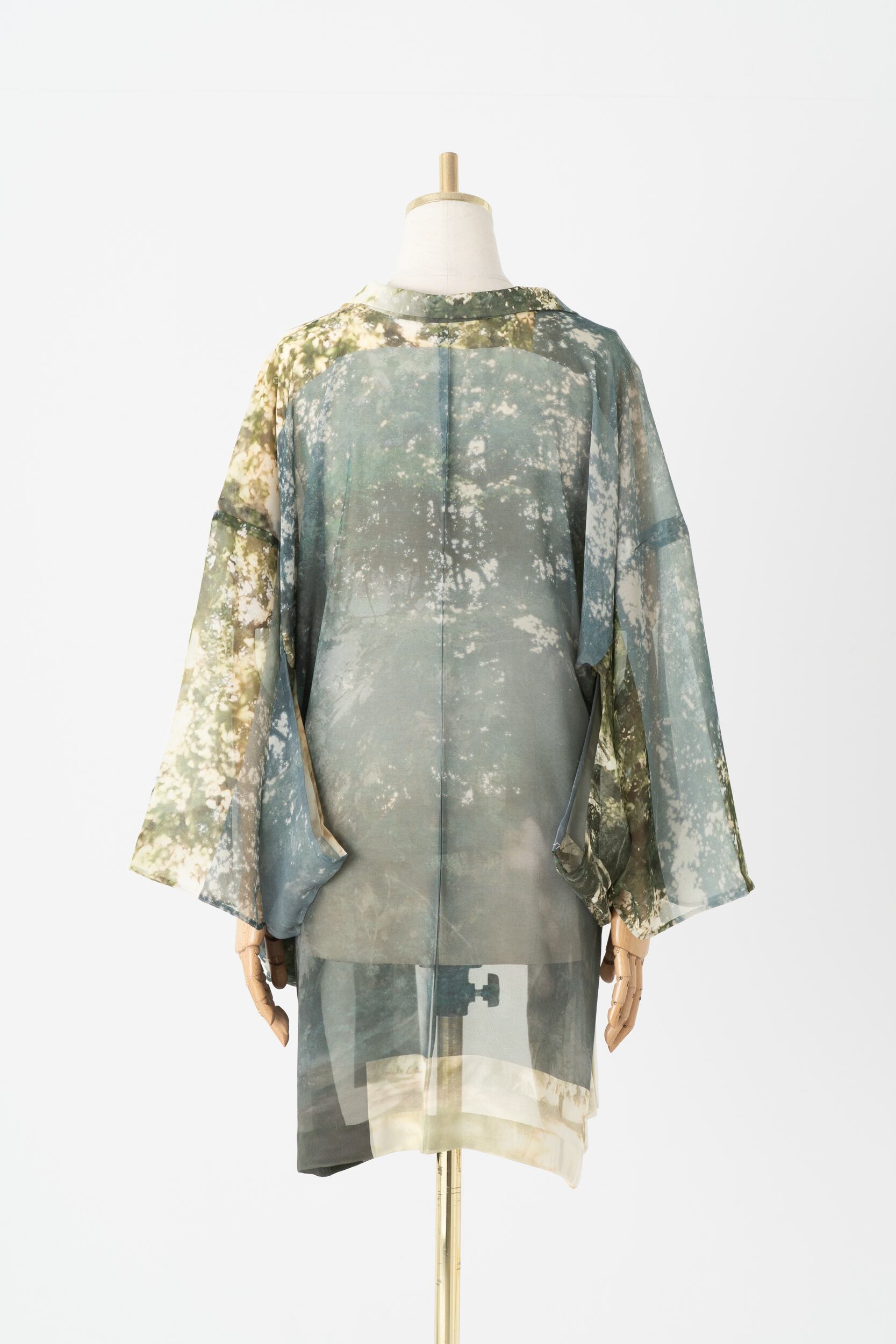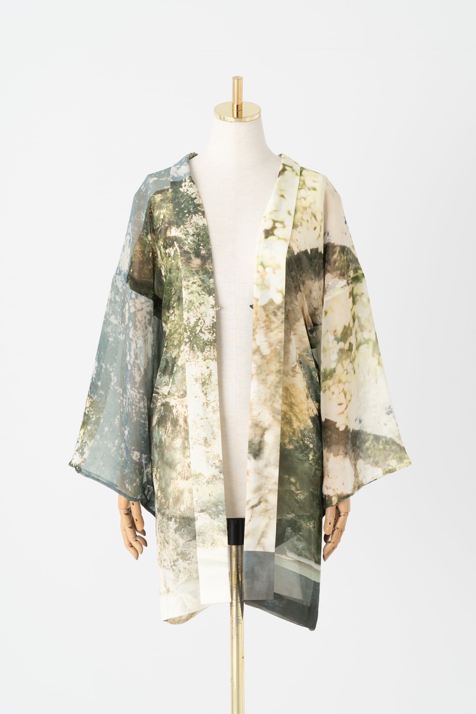 ARCHのフォトグラファーである小財美香子氏が、日常で何気なく撮りためてきた写真の中から、近くに有る穏やかさを思い返させてくれる写真を選び、羽織に仕立てました。生地には、その風景の中にいるような、風をまとう感覚を与えてくれる透け感のある素材を合わせています。着ているときの心地よさはもちろん、街中でもいつでも穏やかな空気をまとわせてくれる、趣のある一枚です。