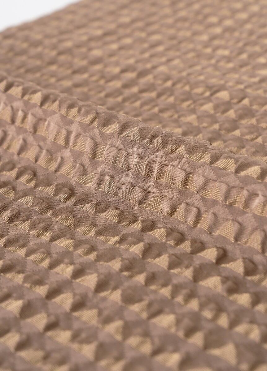 ふくれ織という表面に凹凸が出る織技術で、ふっくらとした帯揚げに仕上げています。帯上から少し覗かせることで、キラキラとした華やかな装いに。帯締めとトーンを合わせた、大人なスタイリングがおすすめです。存在感のあるデザインは、振袖やフォーマルな着物のコーディネートに最適です。