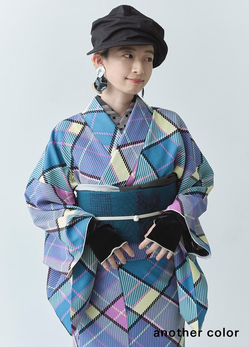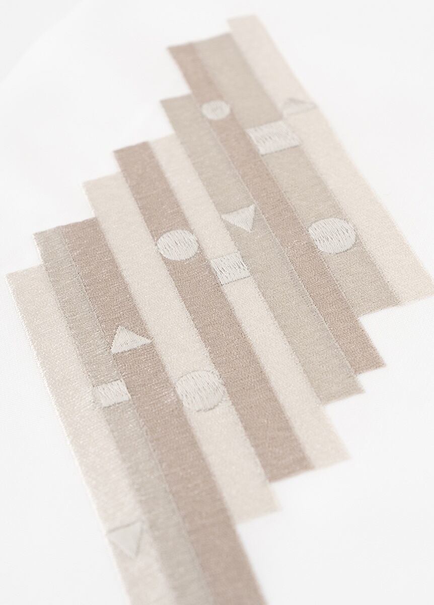 ななめストライプに四角や三角などの幾何学模様をちりばめたデザイン。たっぷりとした刺繍はシックな衿元を演出してくれます。