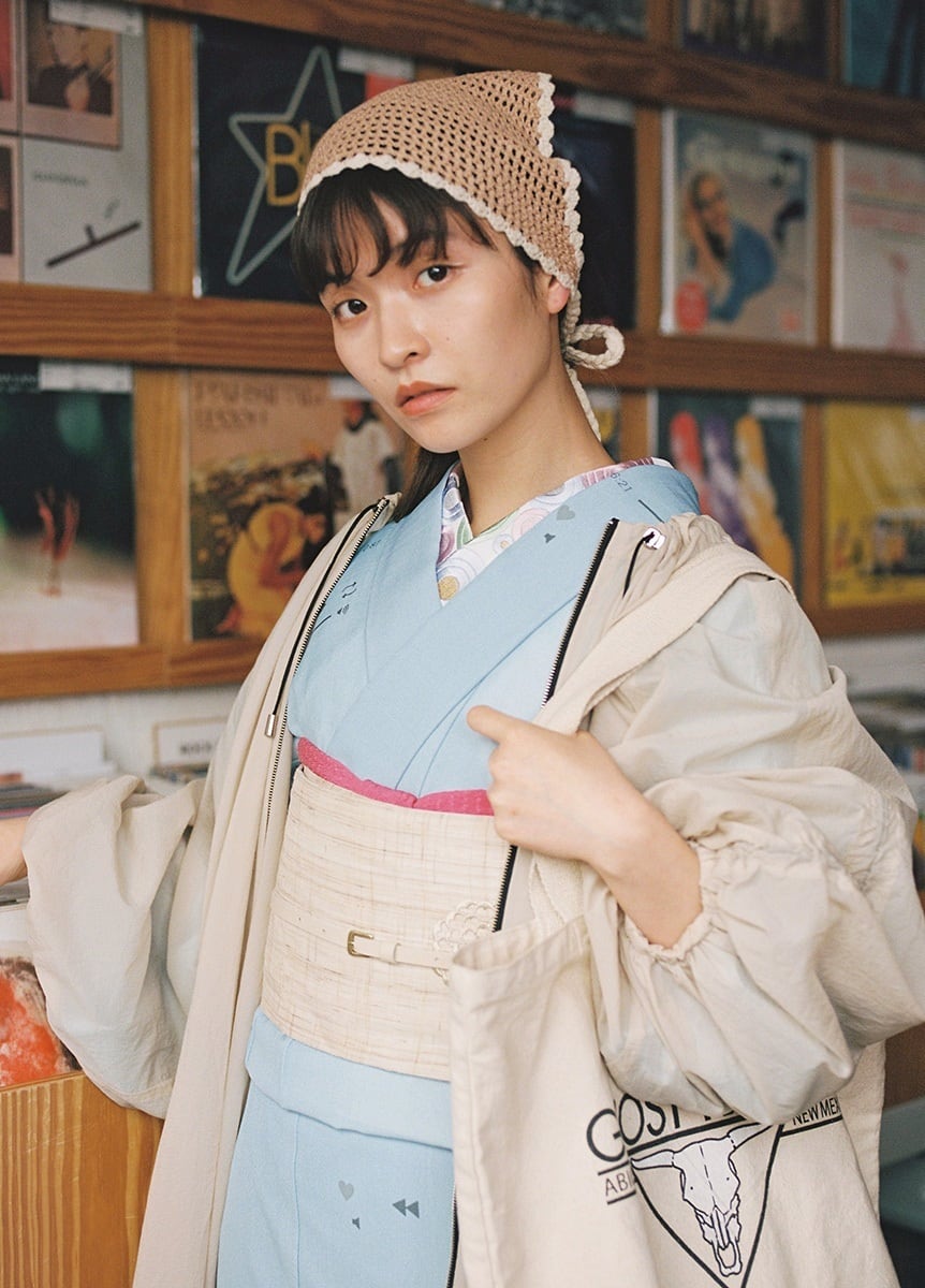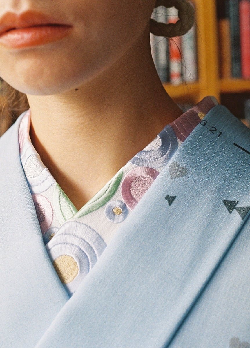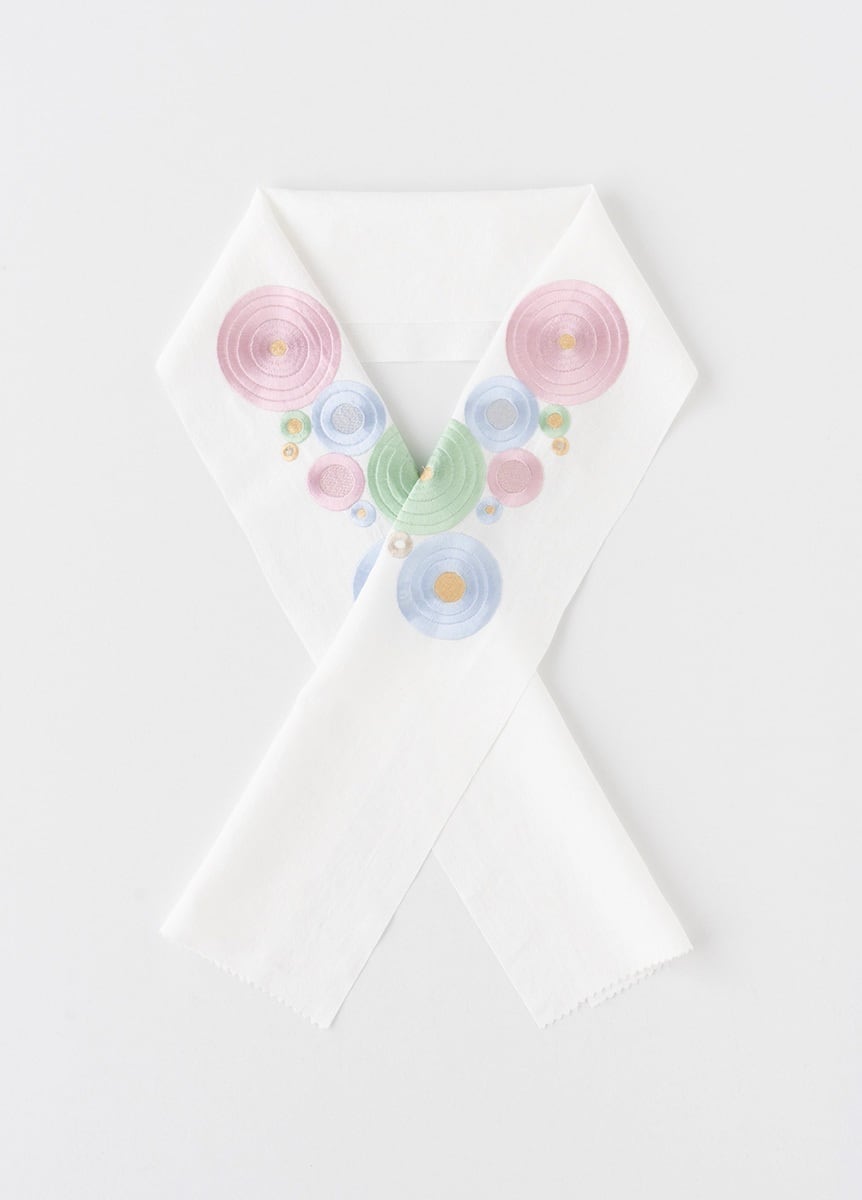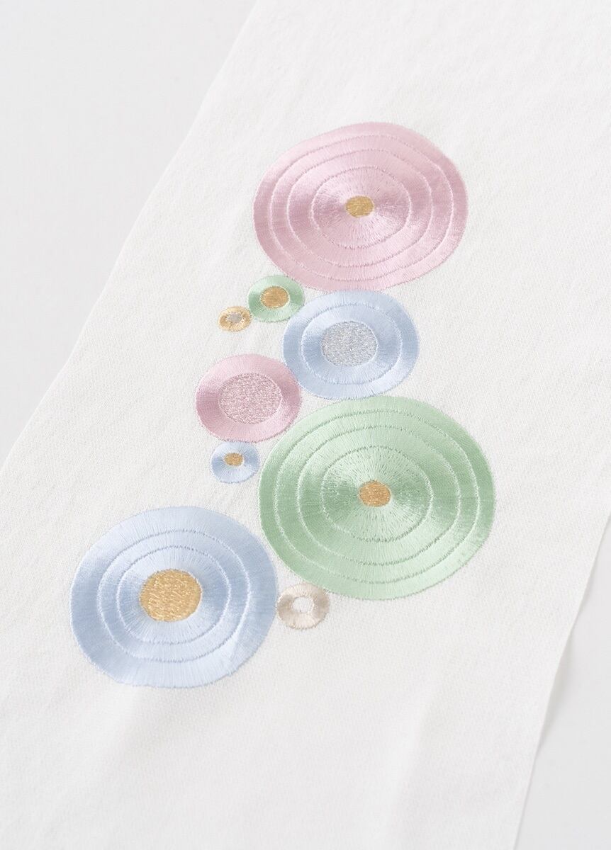 音波のような、レコードのような形をイメージしました。所々に金銀糸が入っています。パープル×イエロー×ブルーと今にも楽しい音楽が聞こえてきそうな配色です。