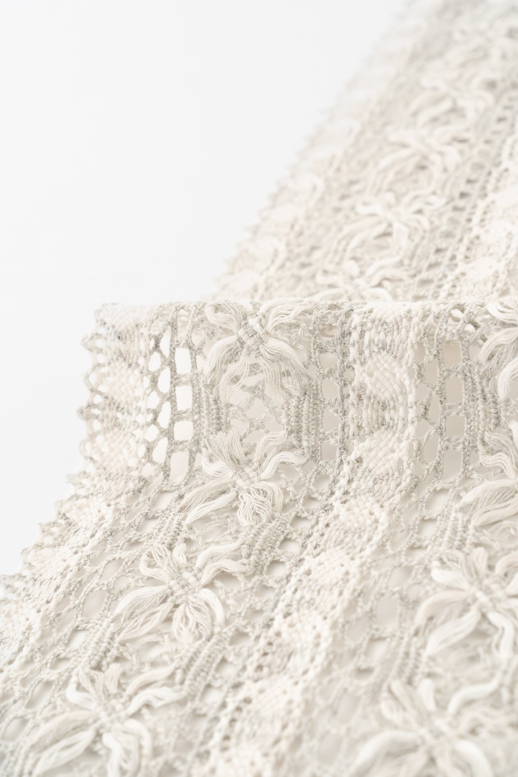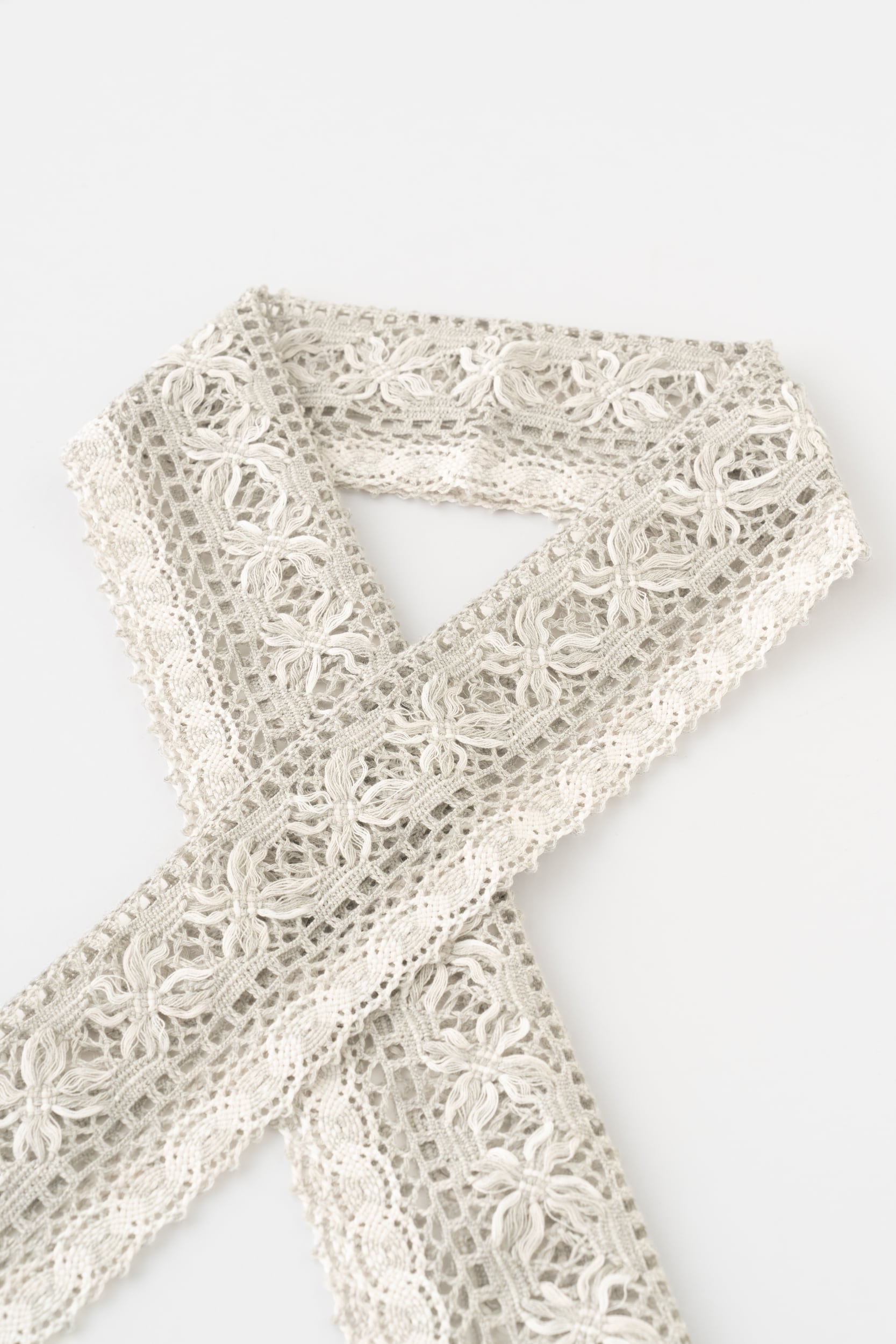 テープ状に編み上げるトーションレースを使用した半衿です。