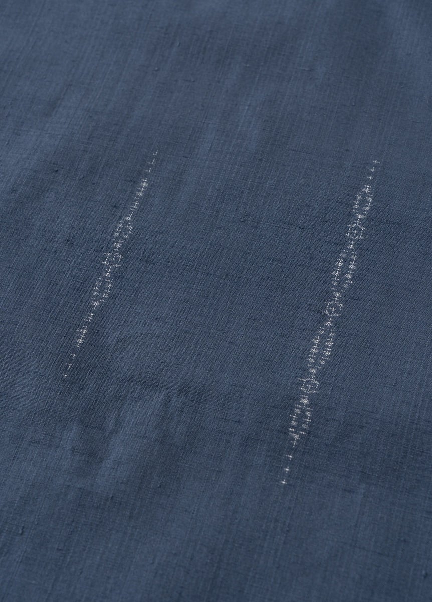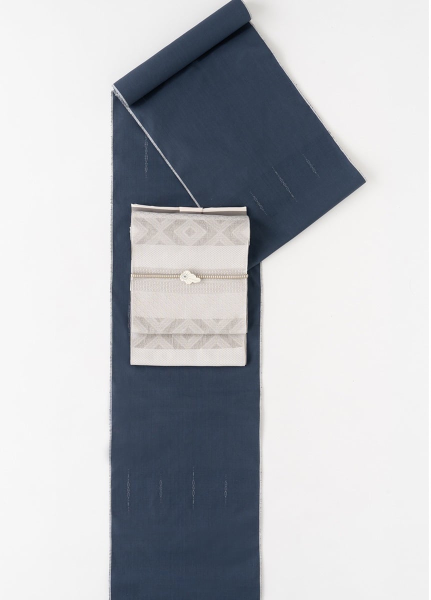 Diamond-shaped kikko kasuri forms a delicate necklace-like pattern, while the rays of light breaking through the clouds are represented with three different types of kasuri. The color is dyed in Dusk Blue, inspired by the hues of twilight.