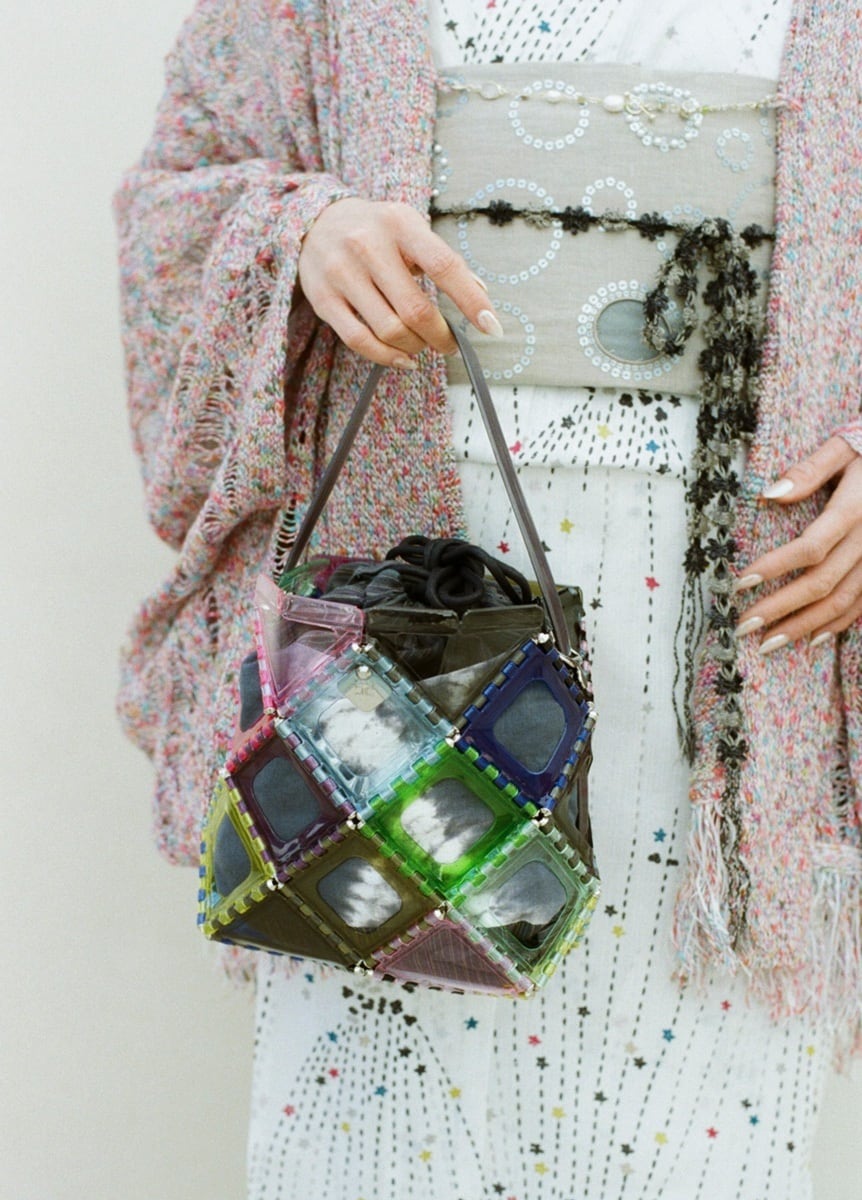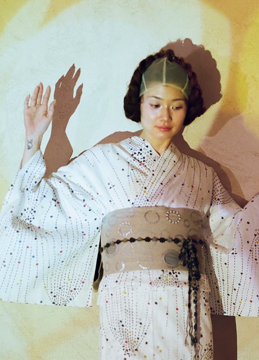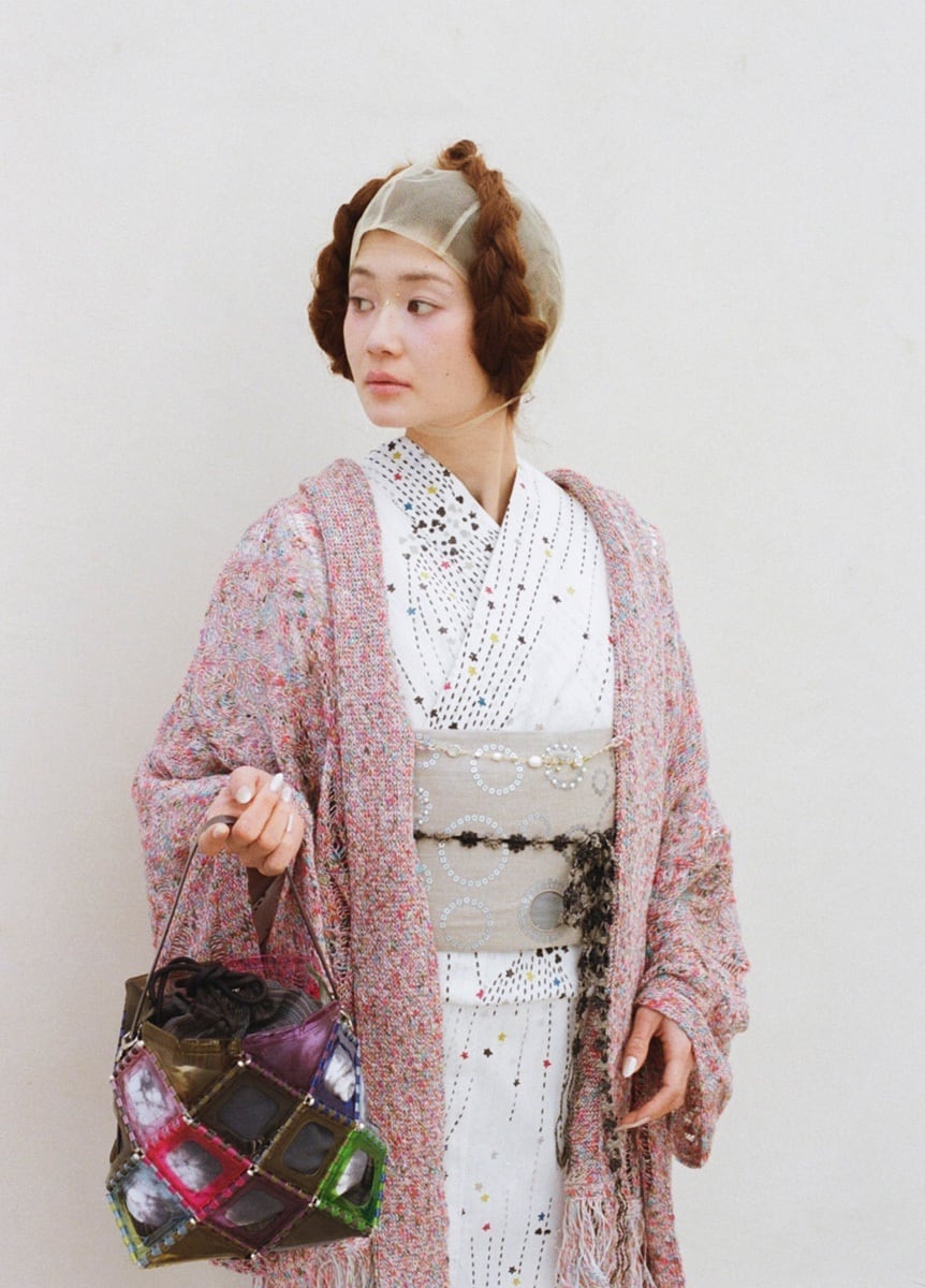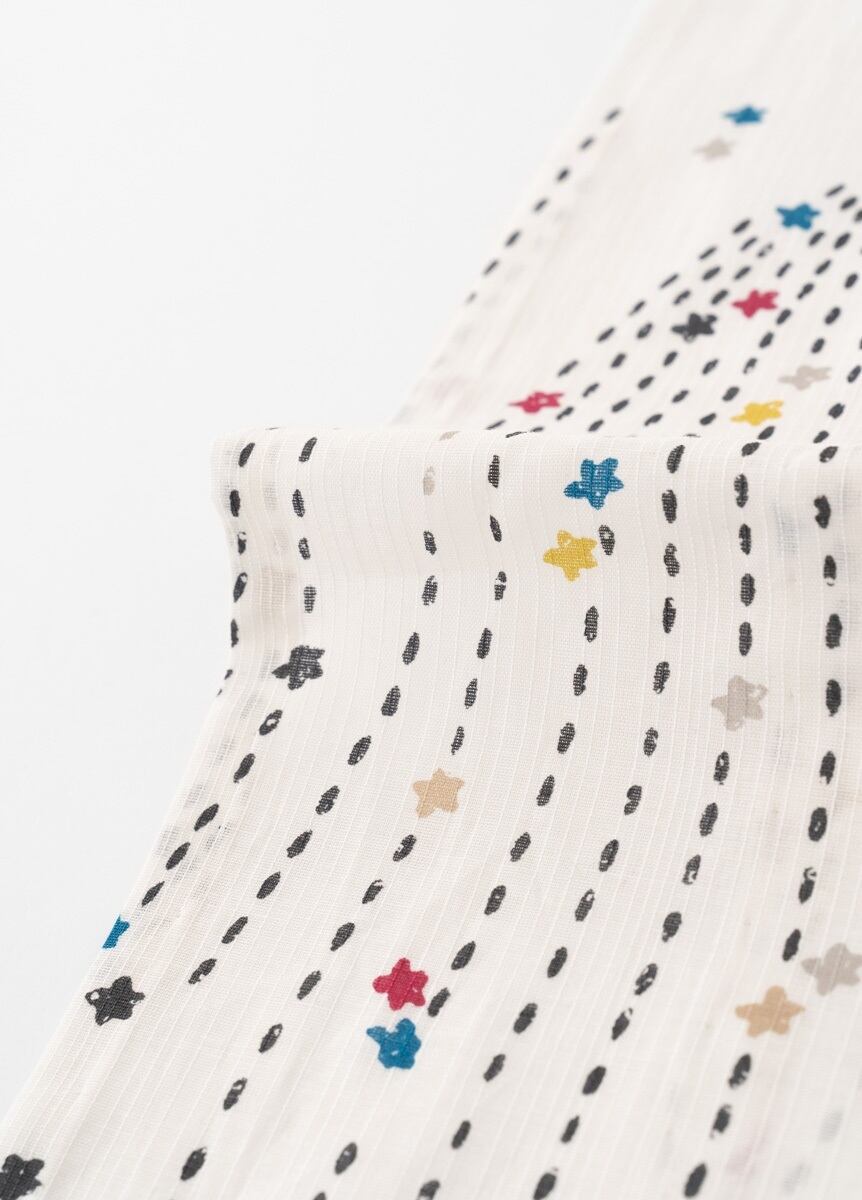 昔の型紙からデザインを選び再構成した、三原色で施されたローラースタンプのような柄は、夏らしい明るい配色で華やかな着姿を演出してくれます。型紙で施せる最小サイズのデザインで、線やモチーフをあえて掠れさせ、温かみを感じる雰囲気に。オフホワイトの地色は肌馴染みが良く、流れるラインが、スタイルを引き立てます。