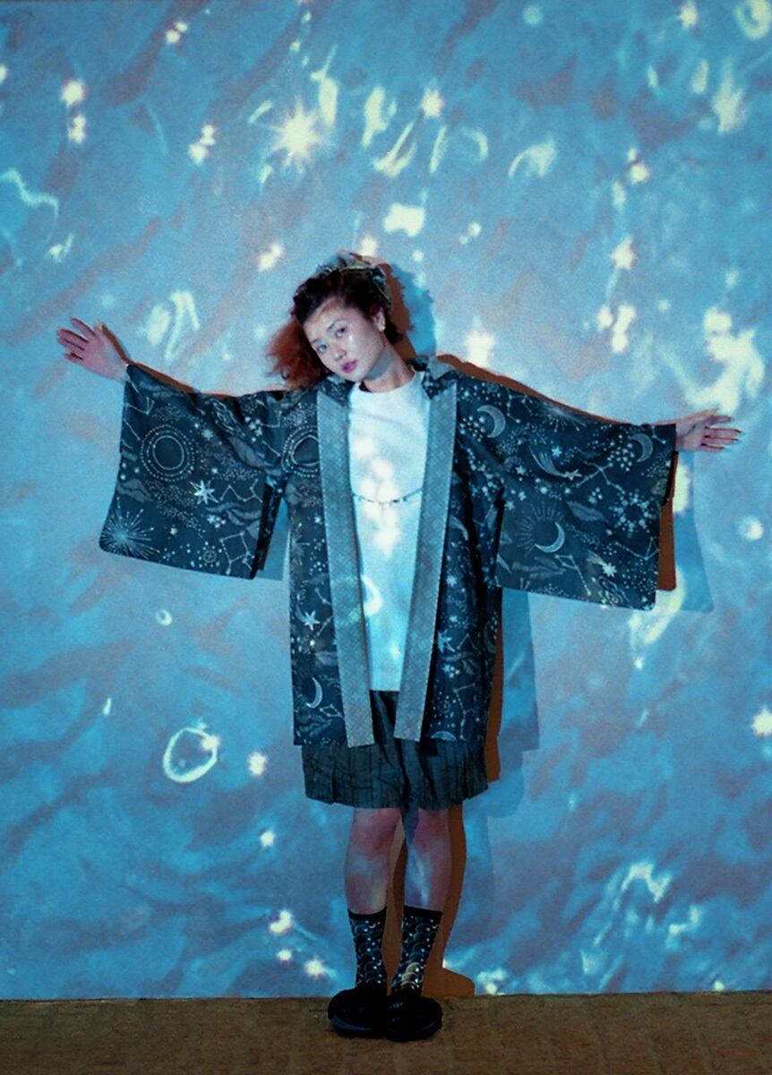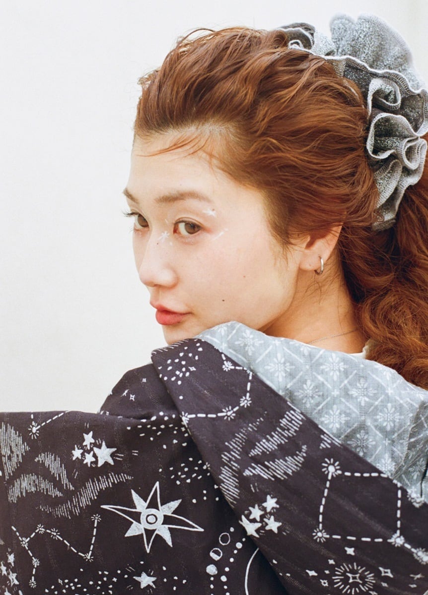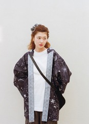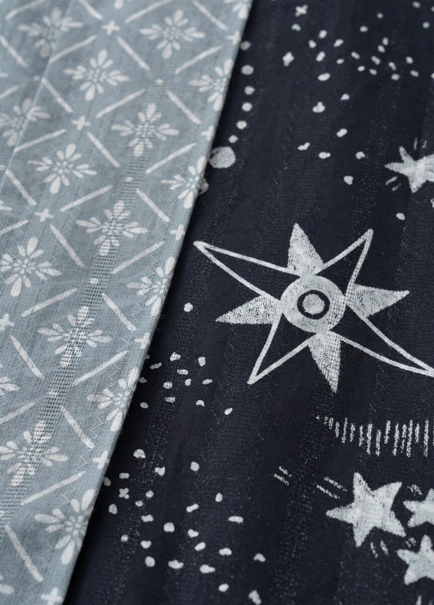 黒板に描いた天文図のような柄と、マジョリカタイルのような模様をゆかたらしいカラーで染めています。リバーシブルで両面染められた生地は表と裏の柄出しが自由に選べて、ARCHで大切にしている、着る方ひとりひとりのオリジナリティをプラスできるお仕立てを楽しんでいただけます。