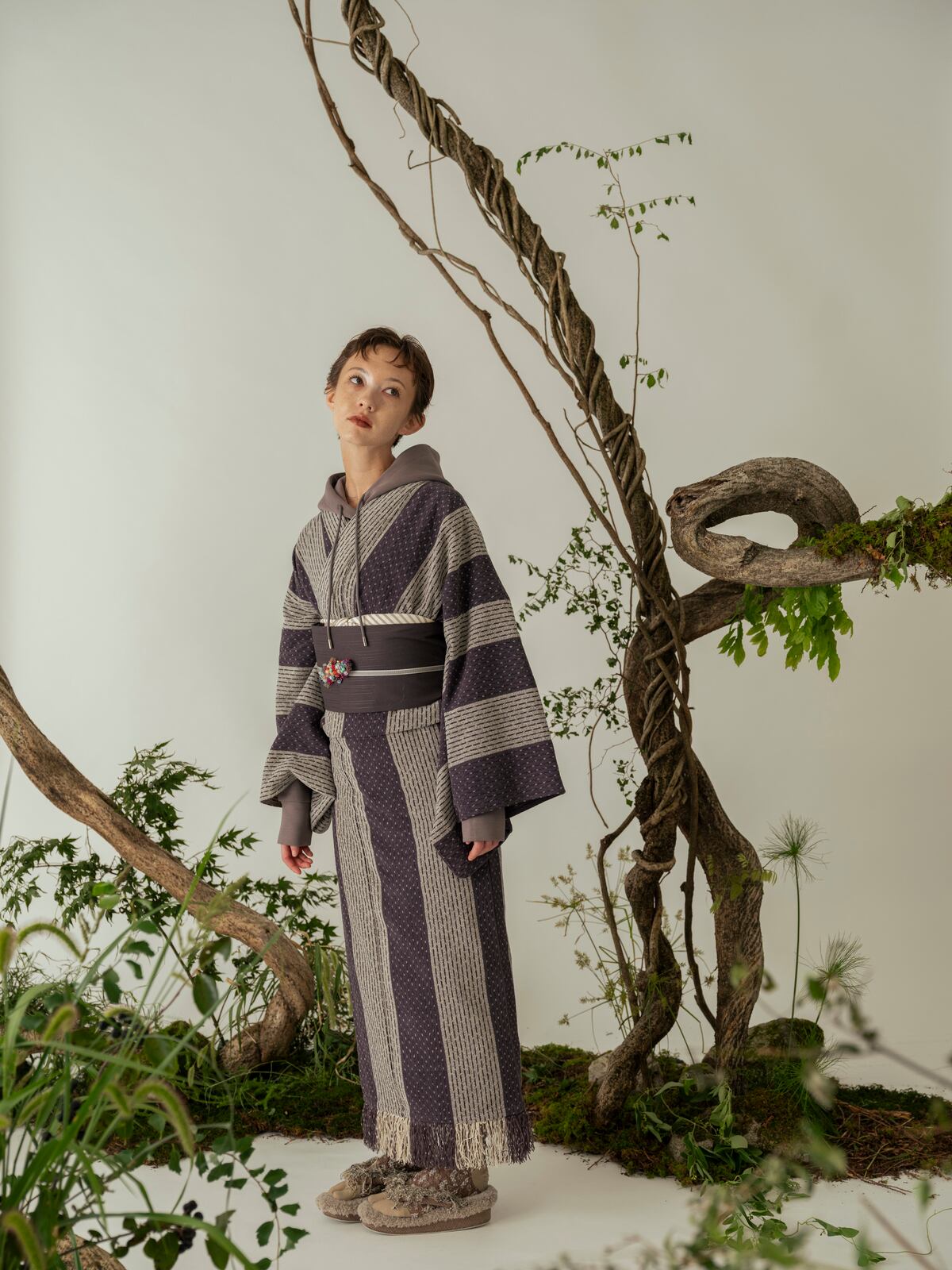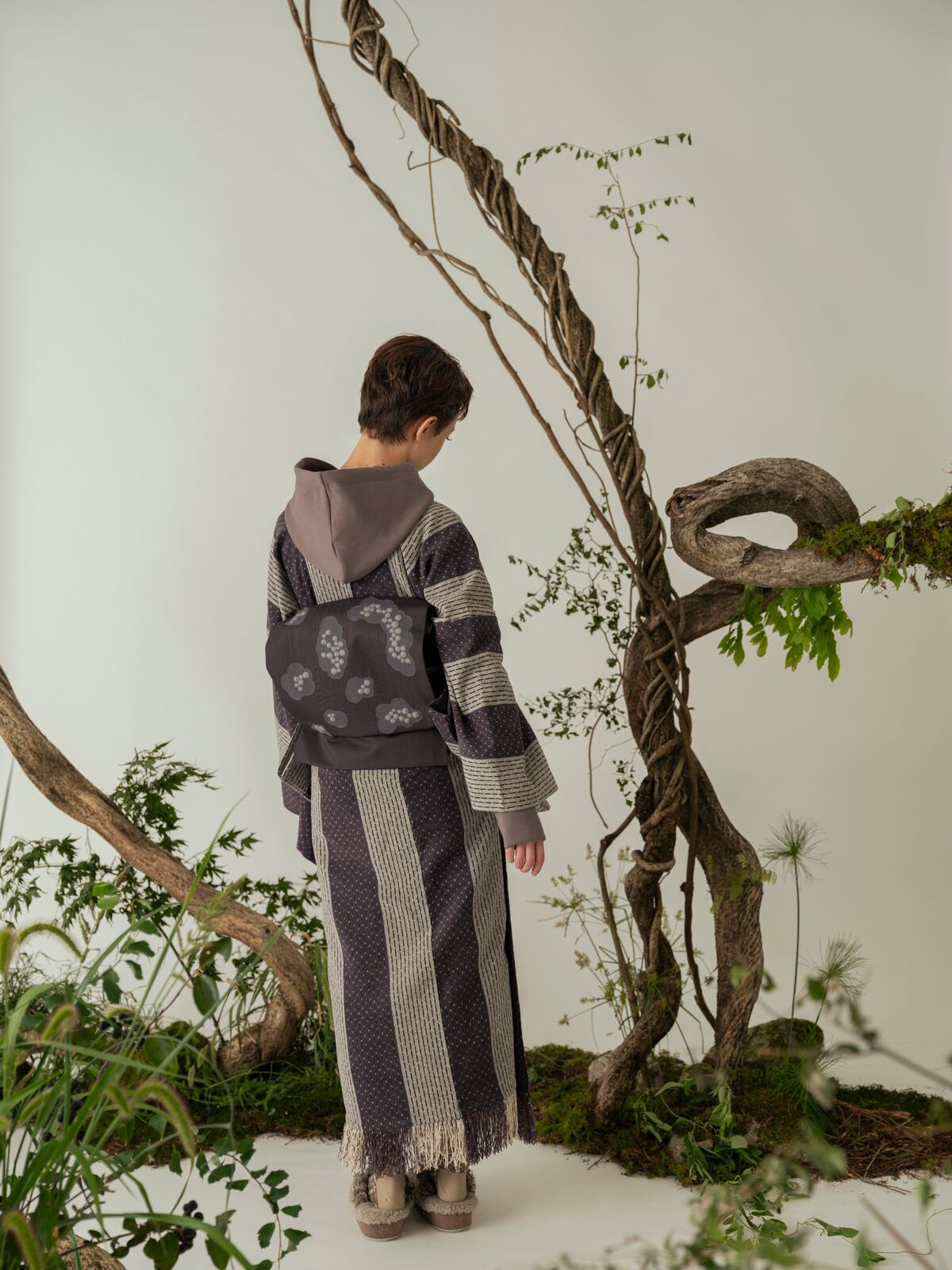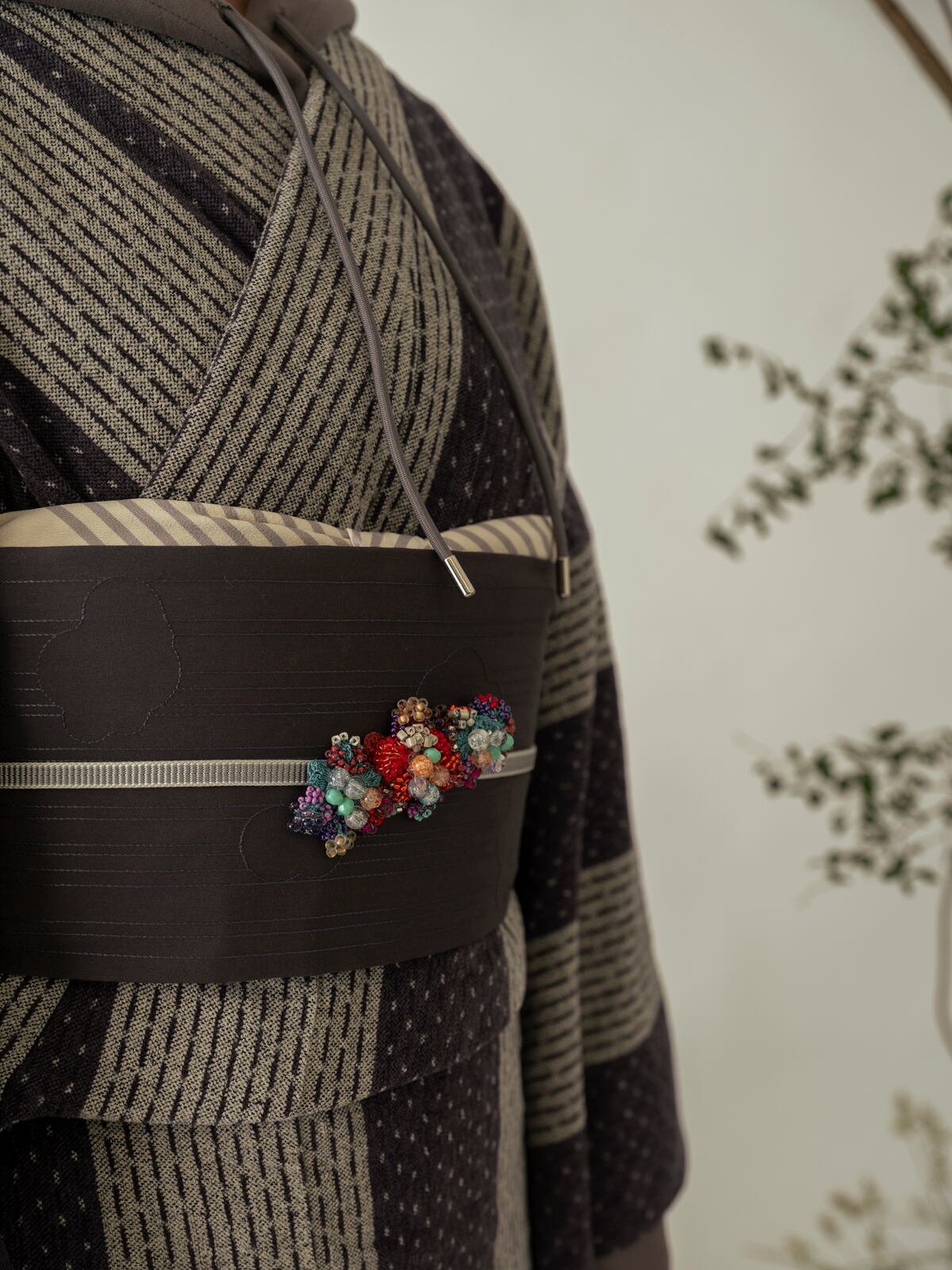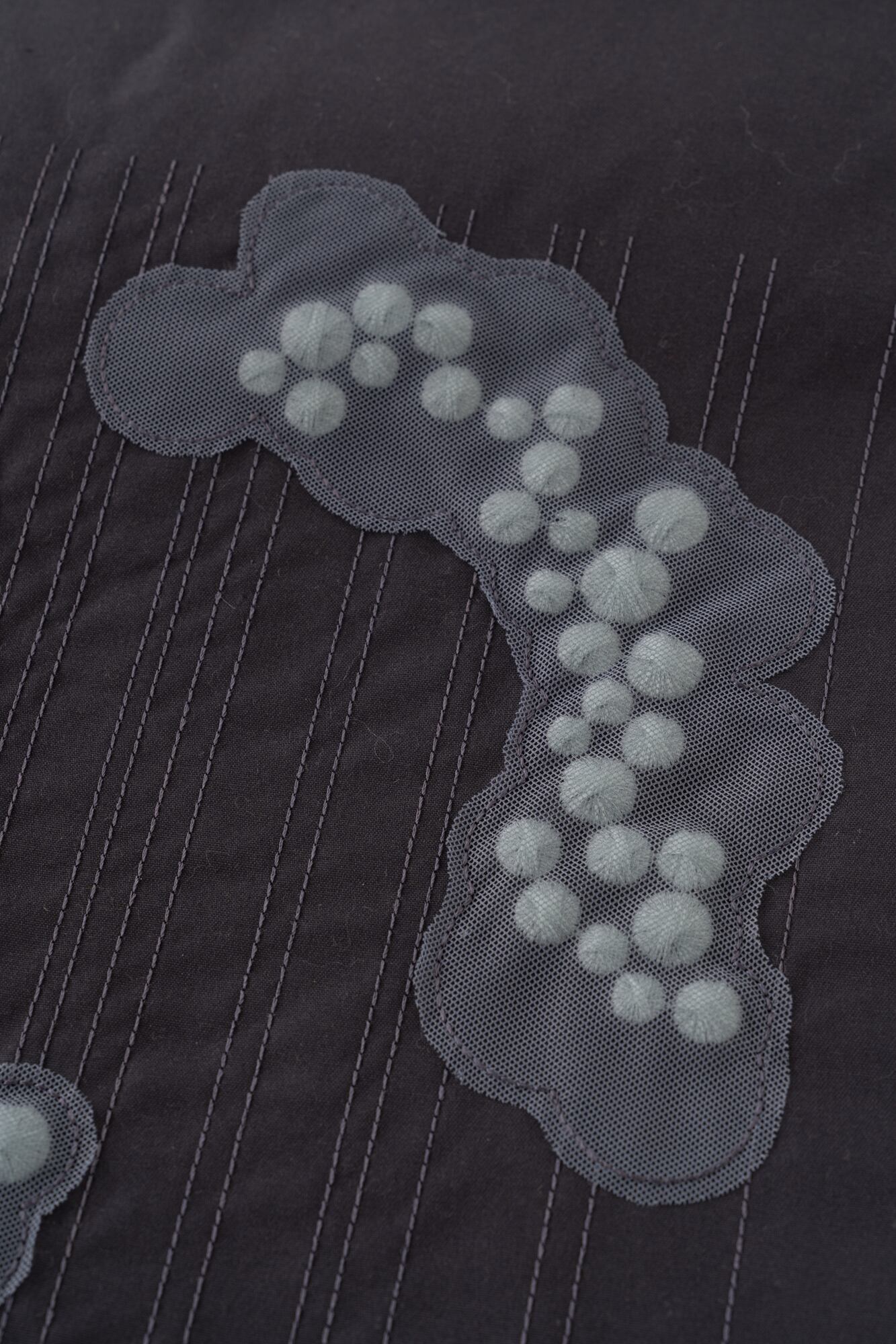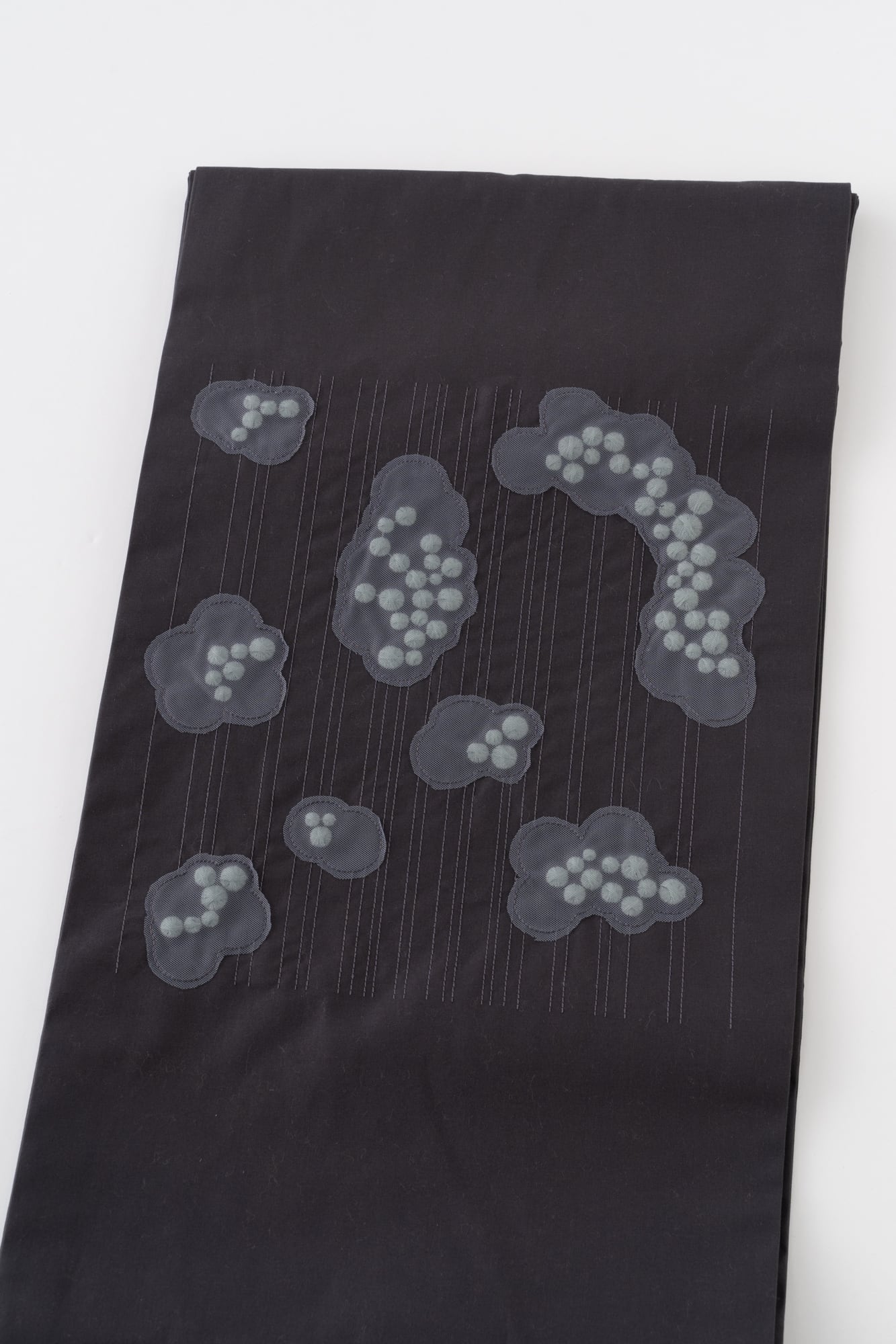 ぷっくりとしたつぶつぶの刺繍が、あいまいな雲の形のシフォン生地で覆われています。立体感のある抽象的なデザインは、以外にも様々な着物に合わせやすく、個性が光るスタイリングに。全体的に同系色でまとめられた刺繍たちは、ぱっと見るだけでは雲か分からない遊び心をお楽しみください。