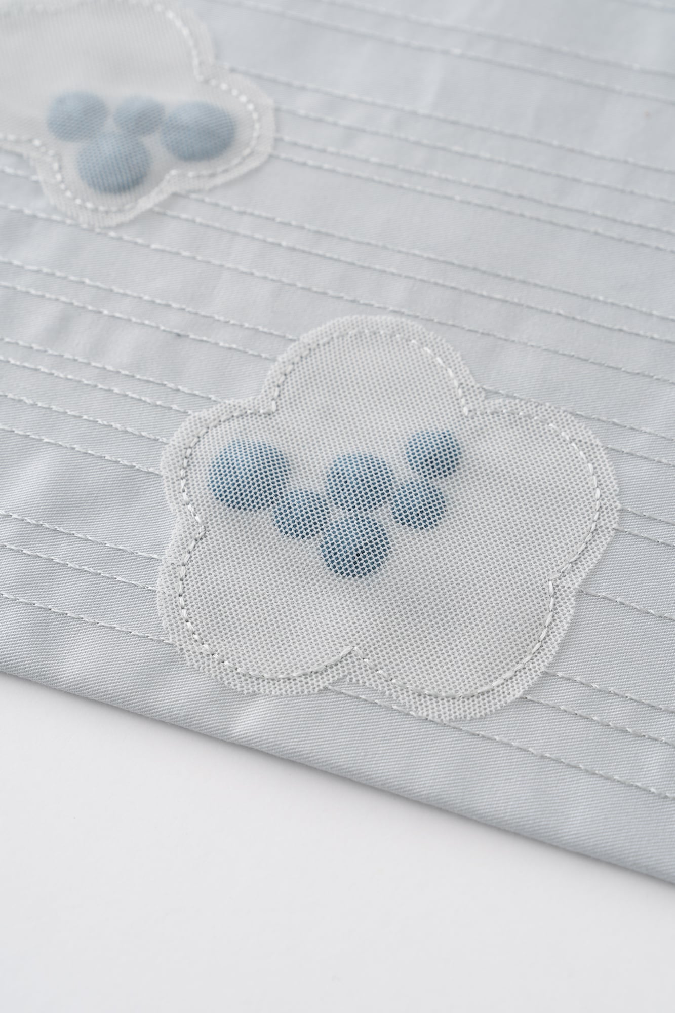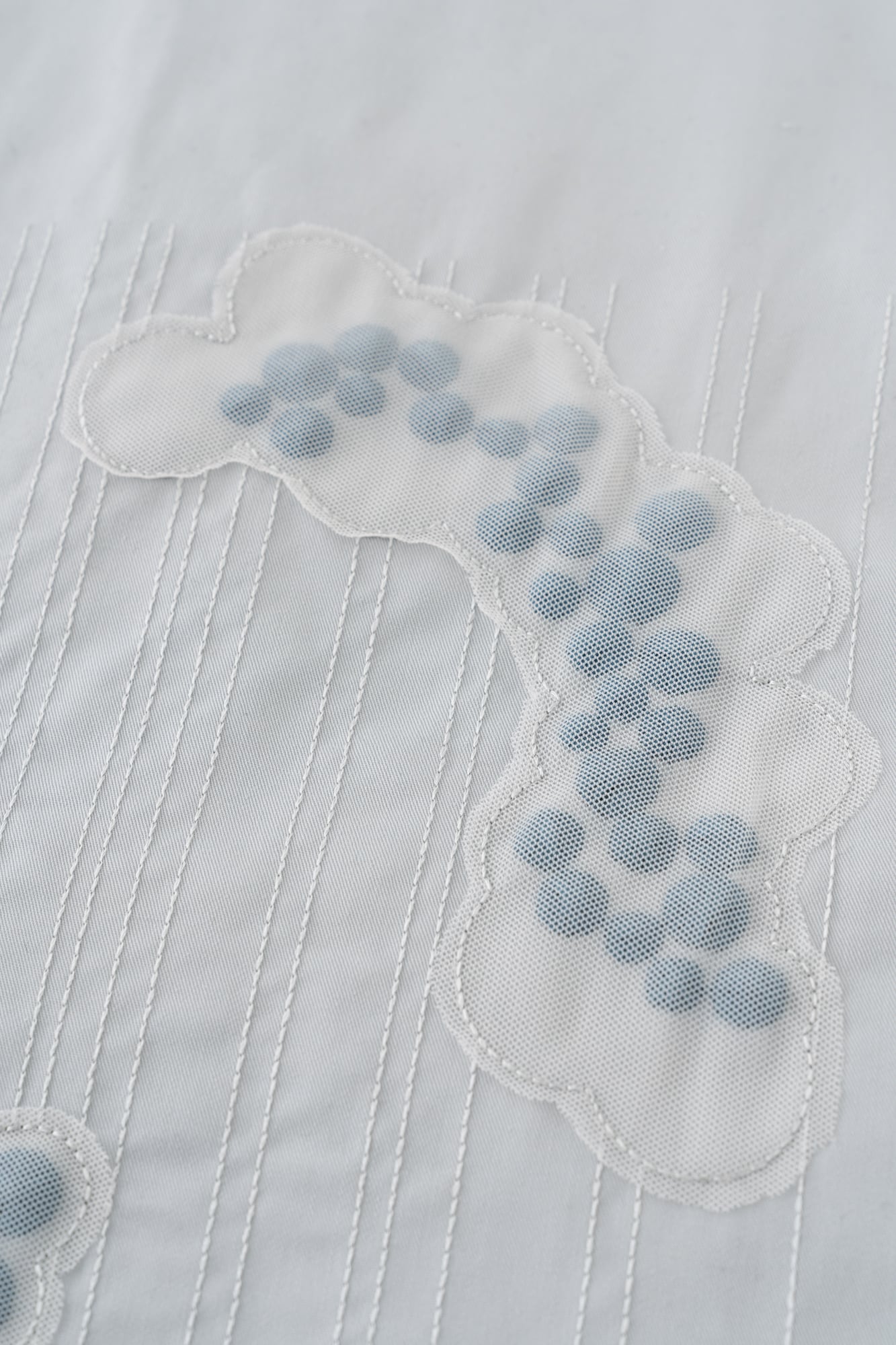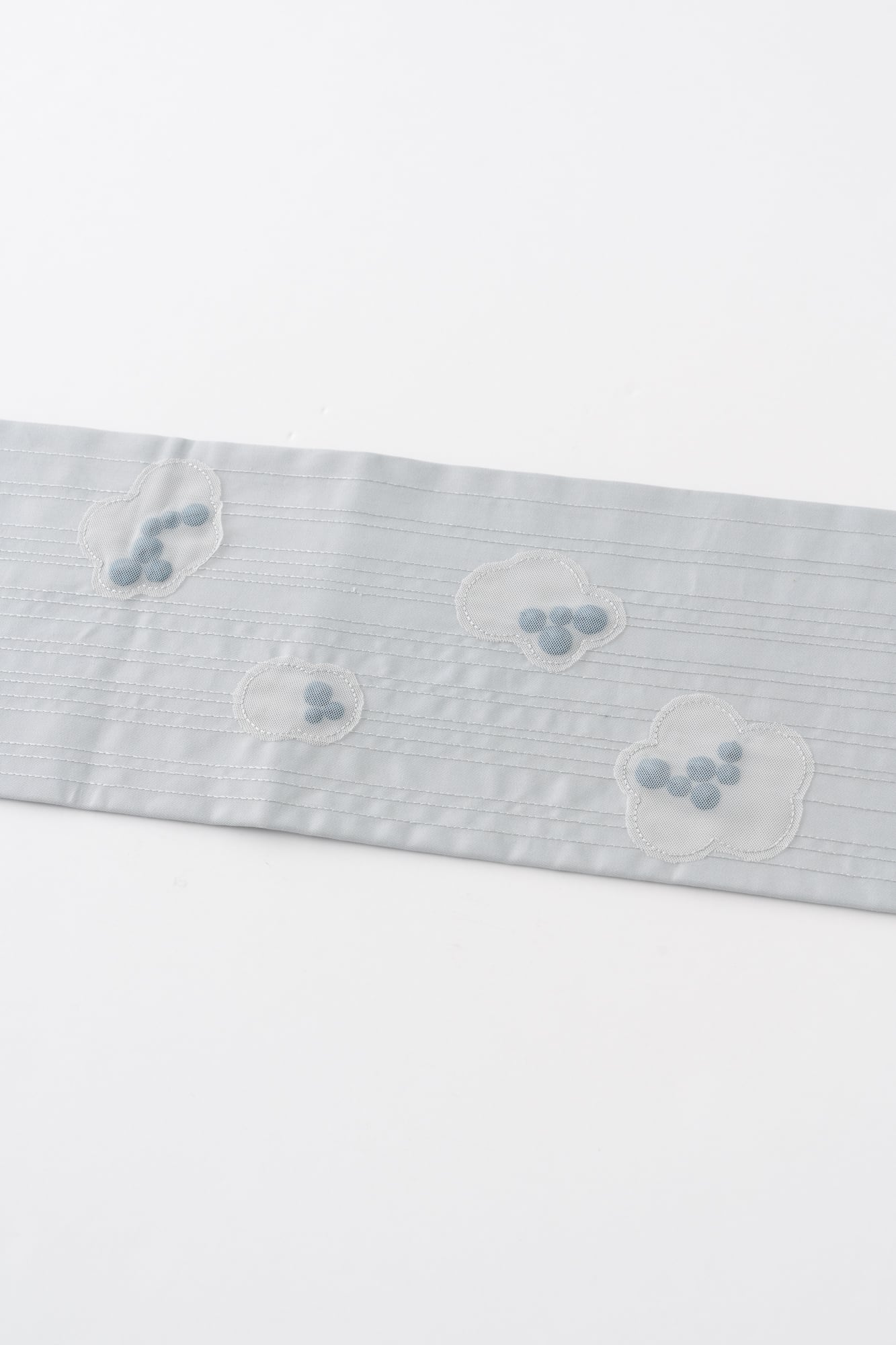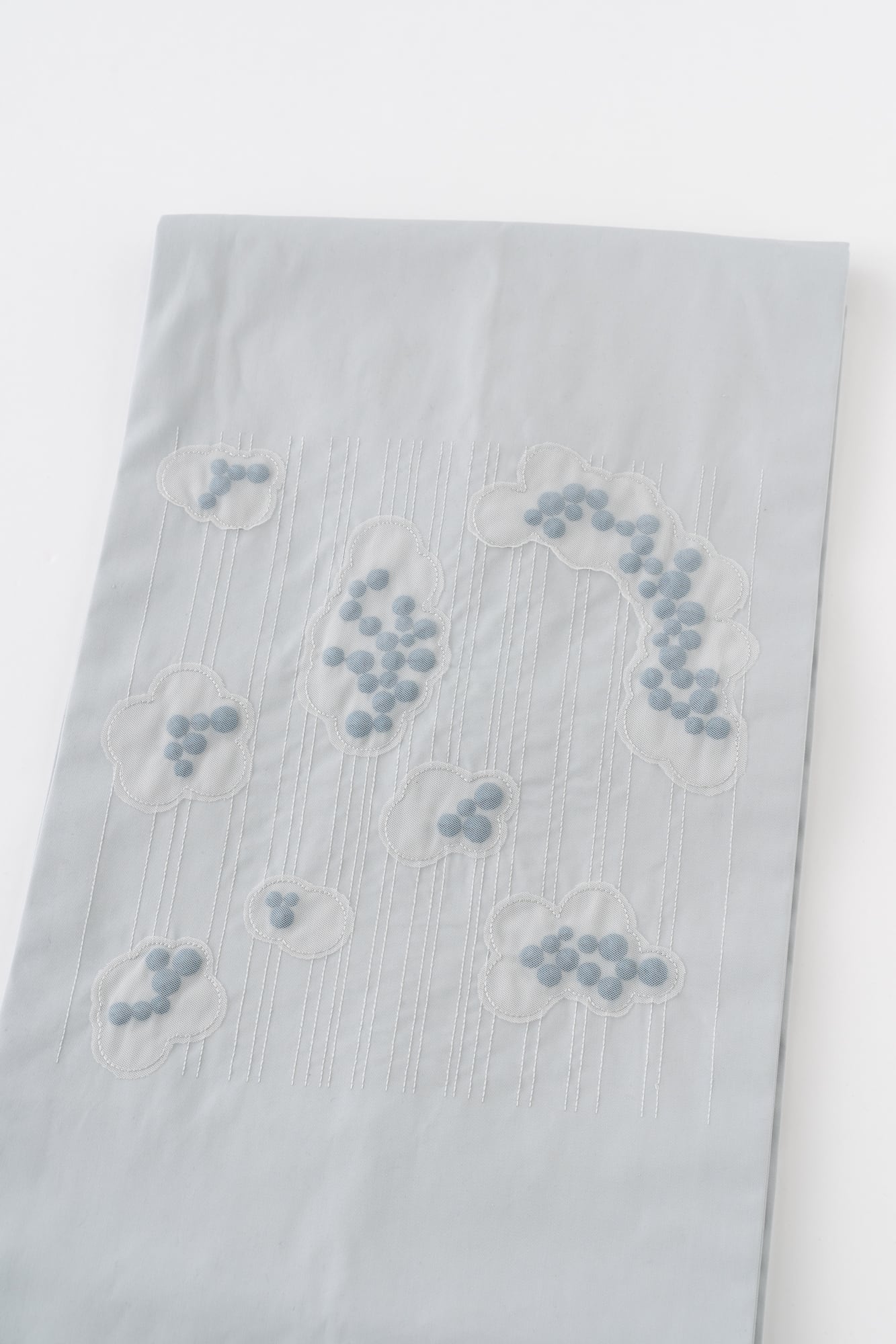 ぷっくりとしたつぶつぶの刺繍が、あいまいな雲の形のシフォン生地で覆われています。立体感のある抽象的なデザインは、以外にも様々な着物に合わせやすく、個性が光るスタイリングに。全体的に同系色でまとめられた刺繍たちは、ぱっと見るだけでは雲か分からない遊び心をお楽しみください。