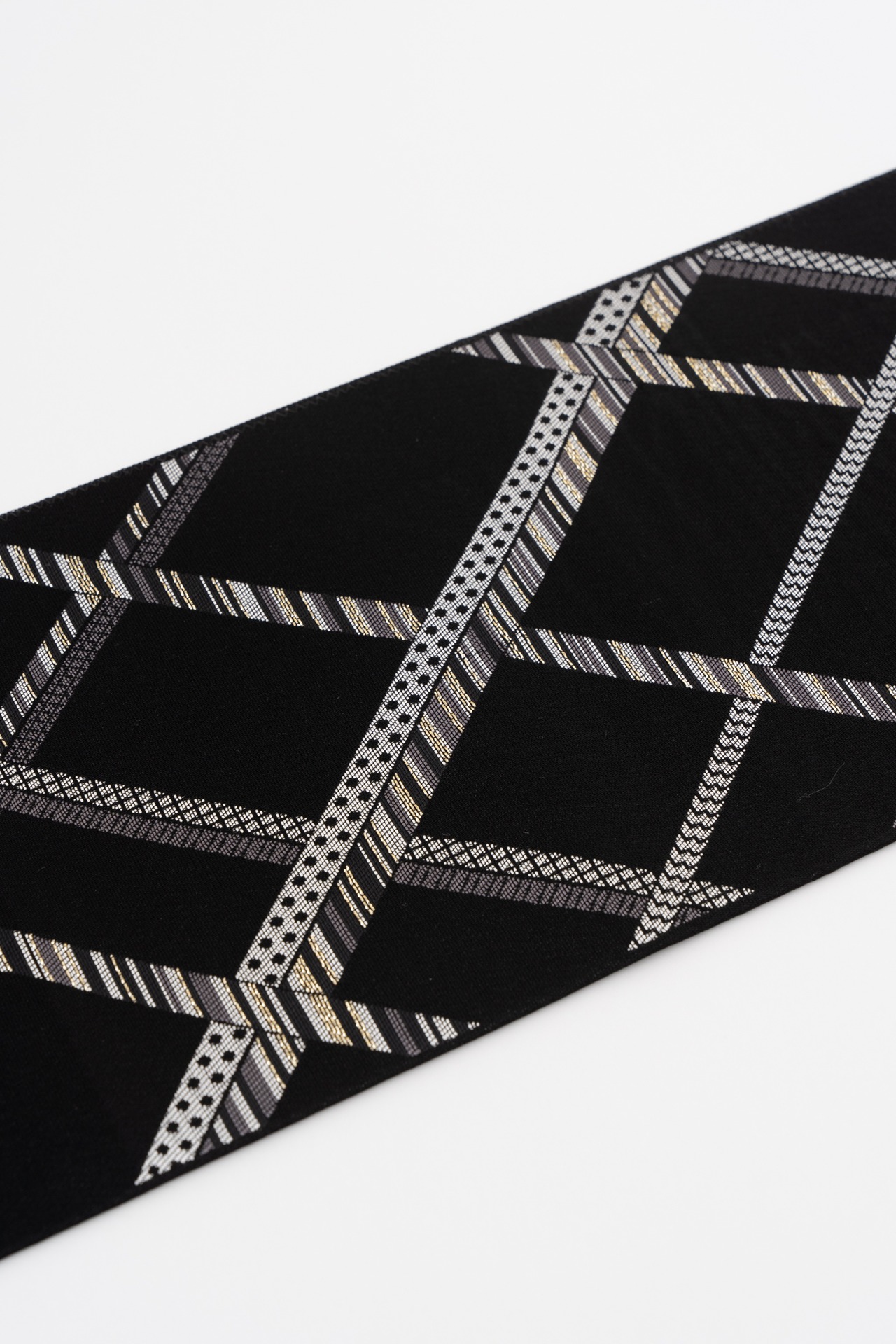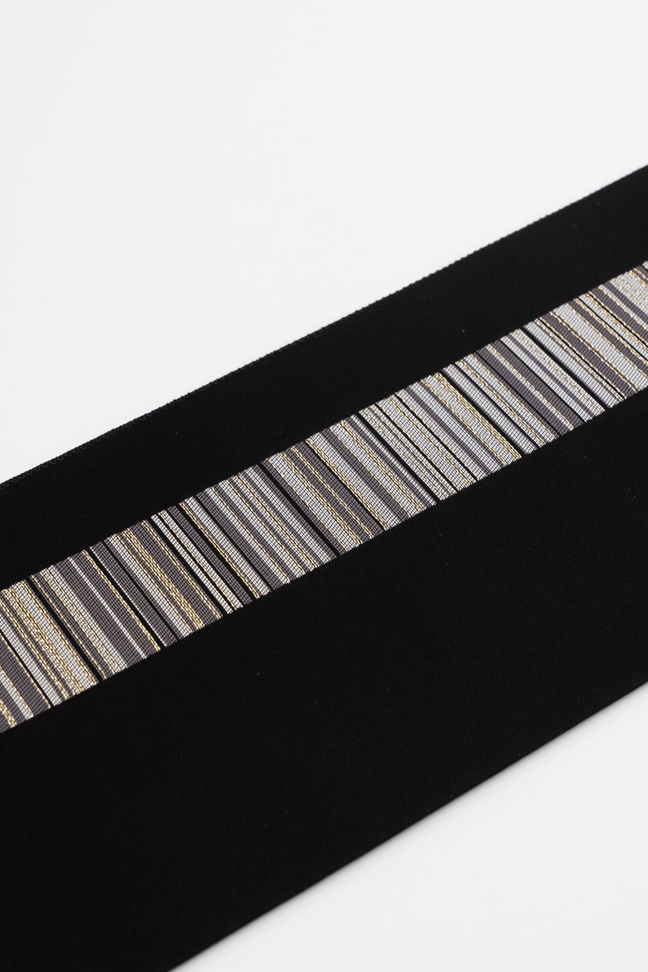 マスキングテープでプレゼントBOXをデコレーションしたようなワクワクするデザイン。様々なマスキングテープがランダムにミックスされた面と、すっきりと一本ラインがひかれた面、両方お使い頂けるリバーシブルタイプ。ラインの繊細さは博多織ならではの細かい技術を活かし、地の部分は柄を引き立たせるよう目の細かな無地に仕上げました。モノトーンの半幅帯はどんな着物にも合わせやすい万能帯です。