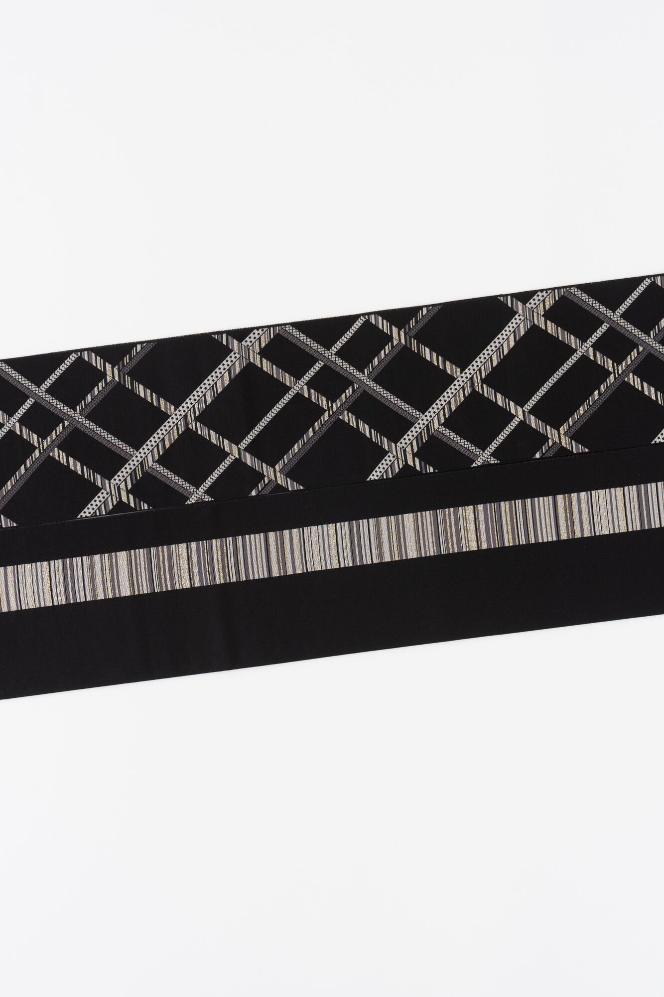 It features an exciting design reminiscent of a gift box decorated with masking tape. This reversible obi allows you to wear both sides: one side features a random mix of various masking tapes, while the other has a clean, single line. The delicate lines showcase the intricate craftsmanship unique to Hakata-ori, and the background is finished in a fine-weave solid color to highlight the pattern. This monochrome half-width obi is a versatile piece that pairs easily with any kimono.