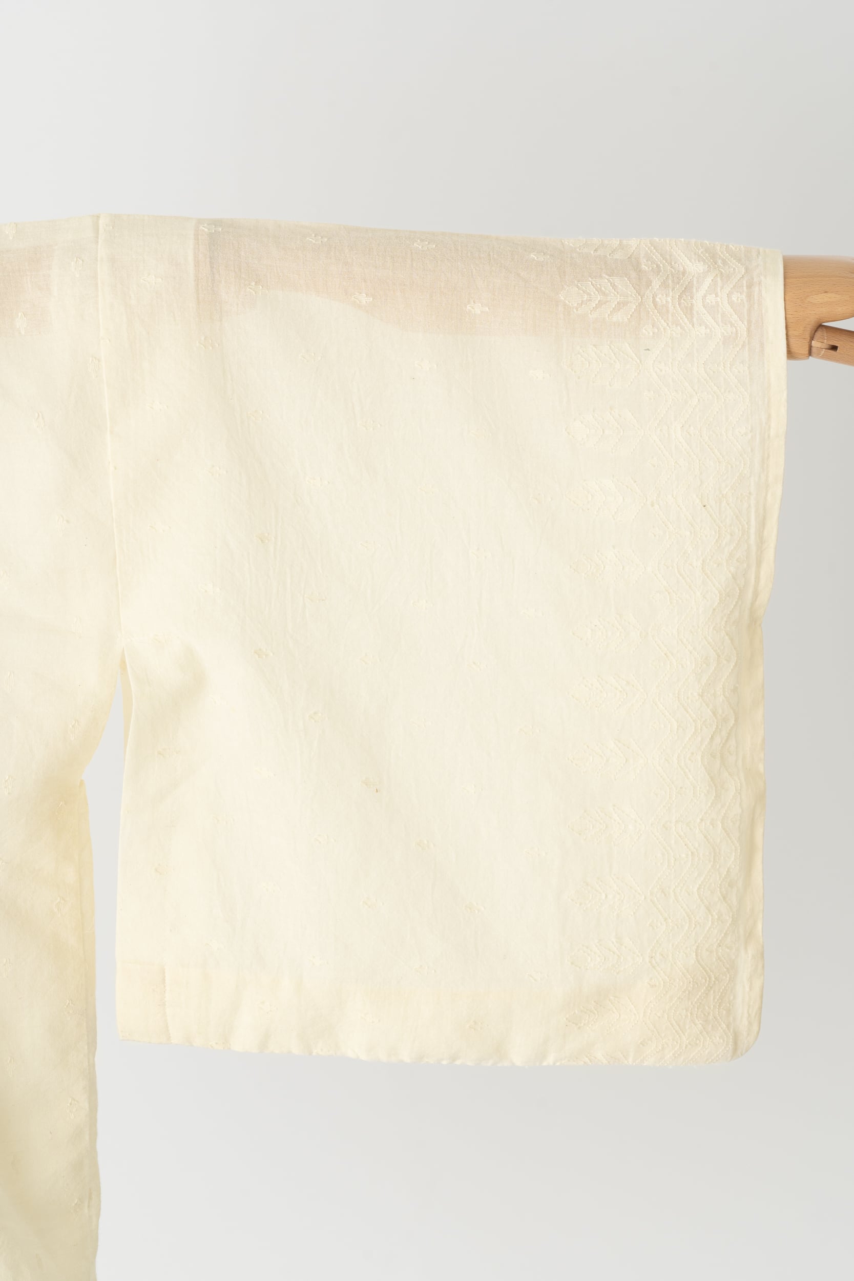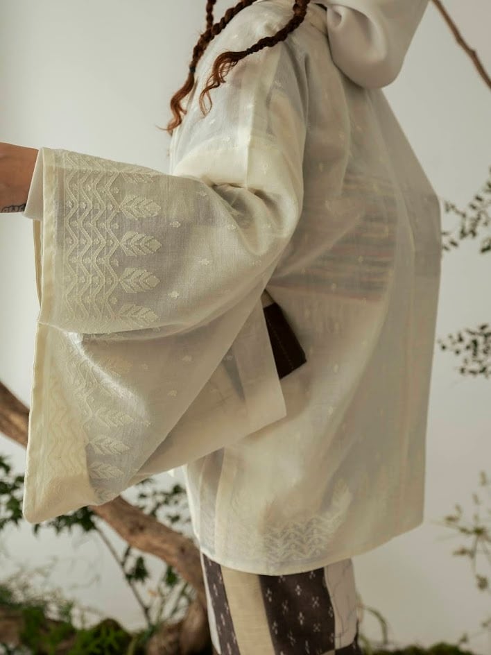 A haori made from Jamdani, an extremely delicate handwoven textile that has been passed down for over 300 years in the Bengal region of India.