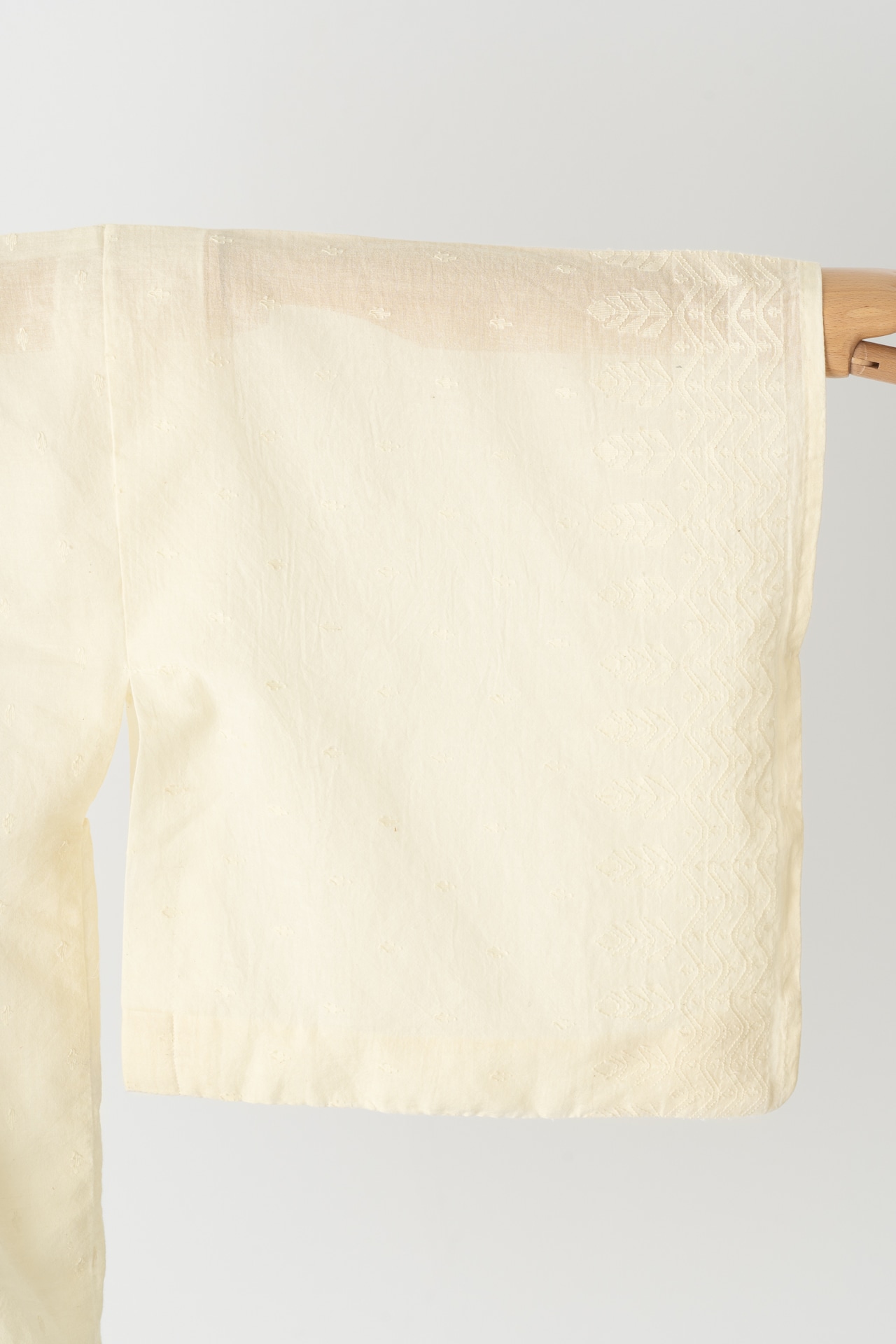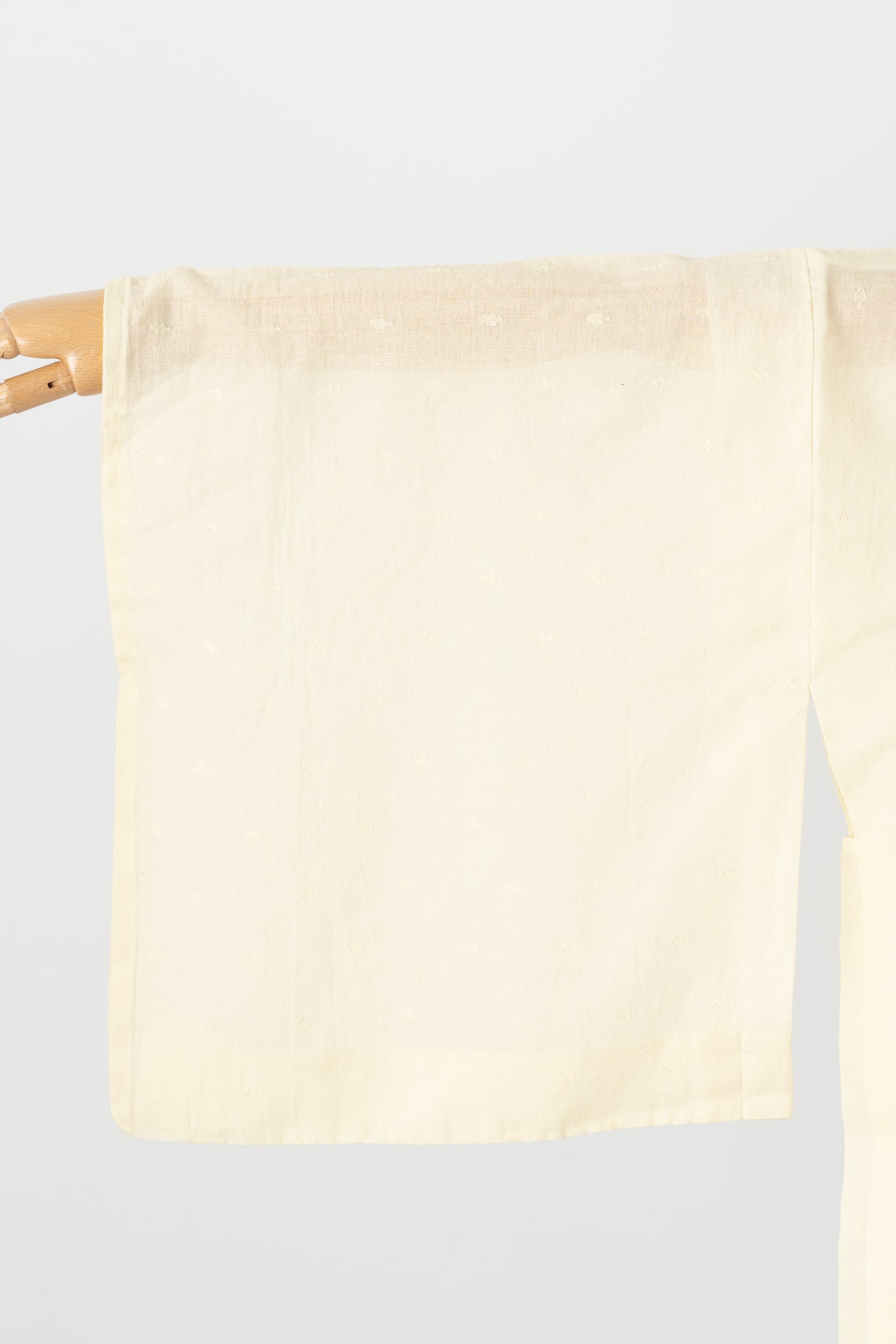 The fabric has a subtle transparency, and the pattern threads appear to float one by one, as if they were hand-embroidered. The simple color palette blends naturally with the skin, making it easy to coordinate for everyday wear throughout the seasons. Jamdani weaving is also known for motifs inspired by nature, such as flowers, leaves, birds, and animals.