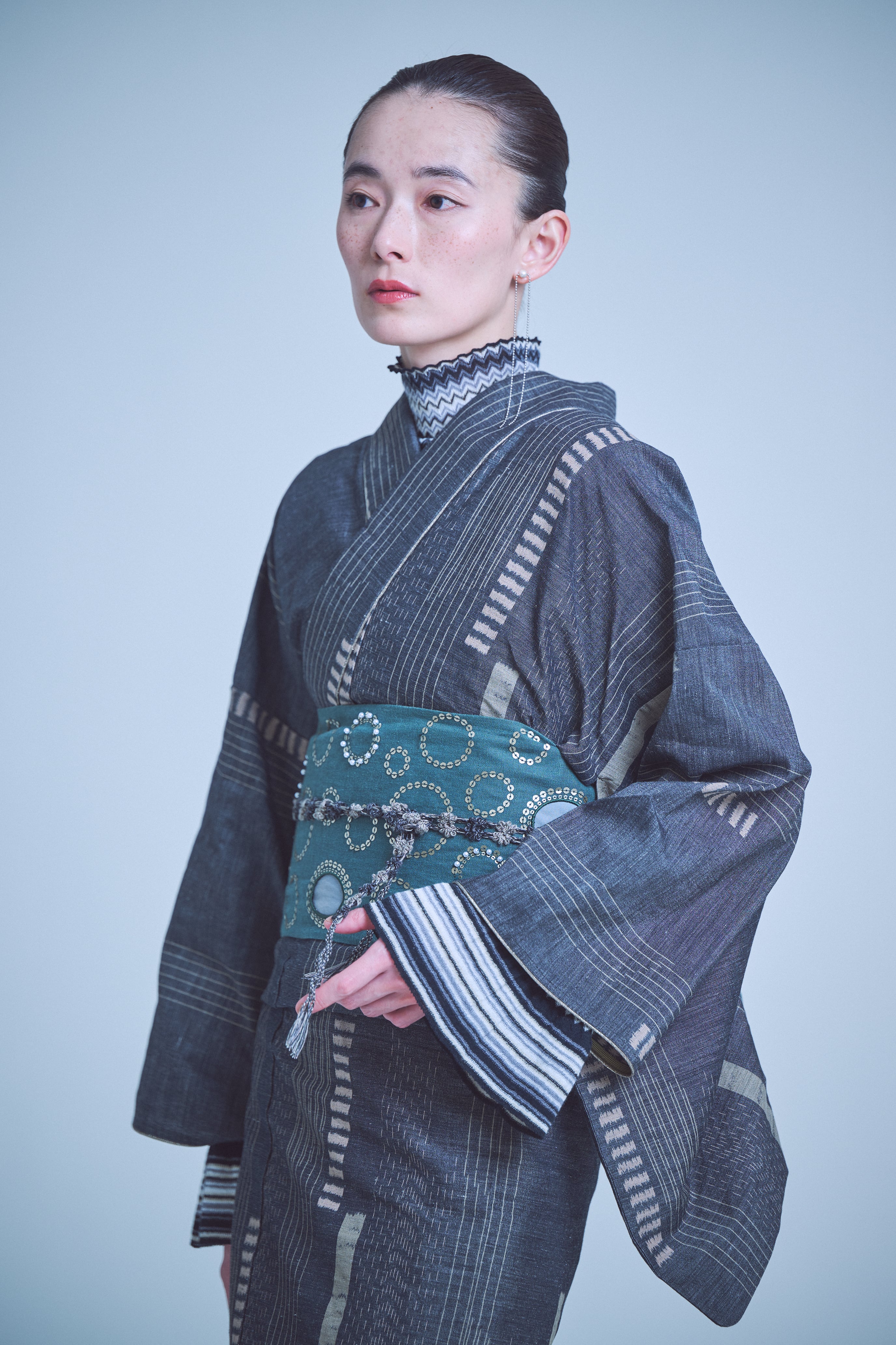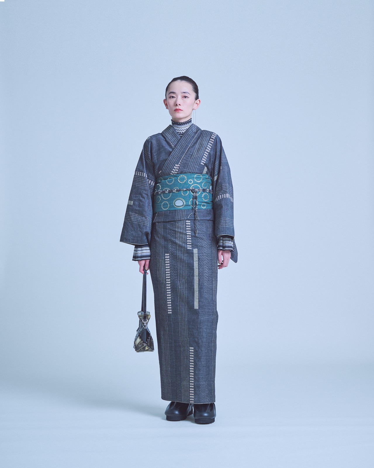 The calm color palette makes it easy to style in many ways — from a casual look with a hanhaba obi and a high-neck inner layer, to a more distinctive style paired with an apron, all brought together with a chic finish.