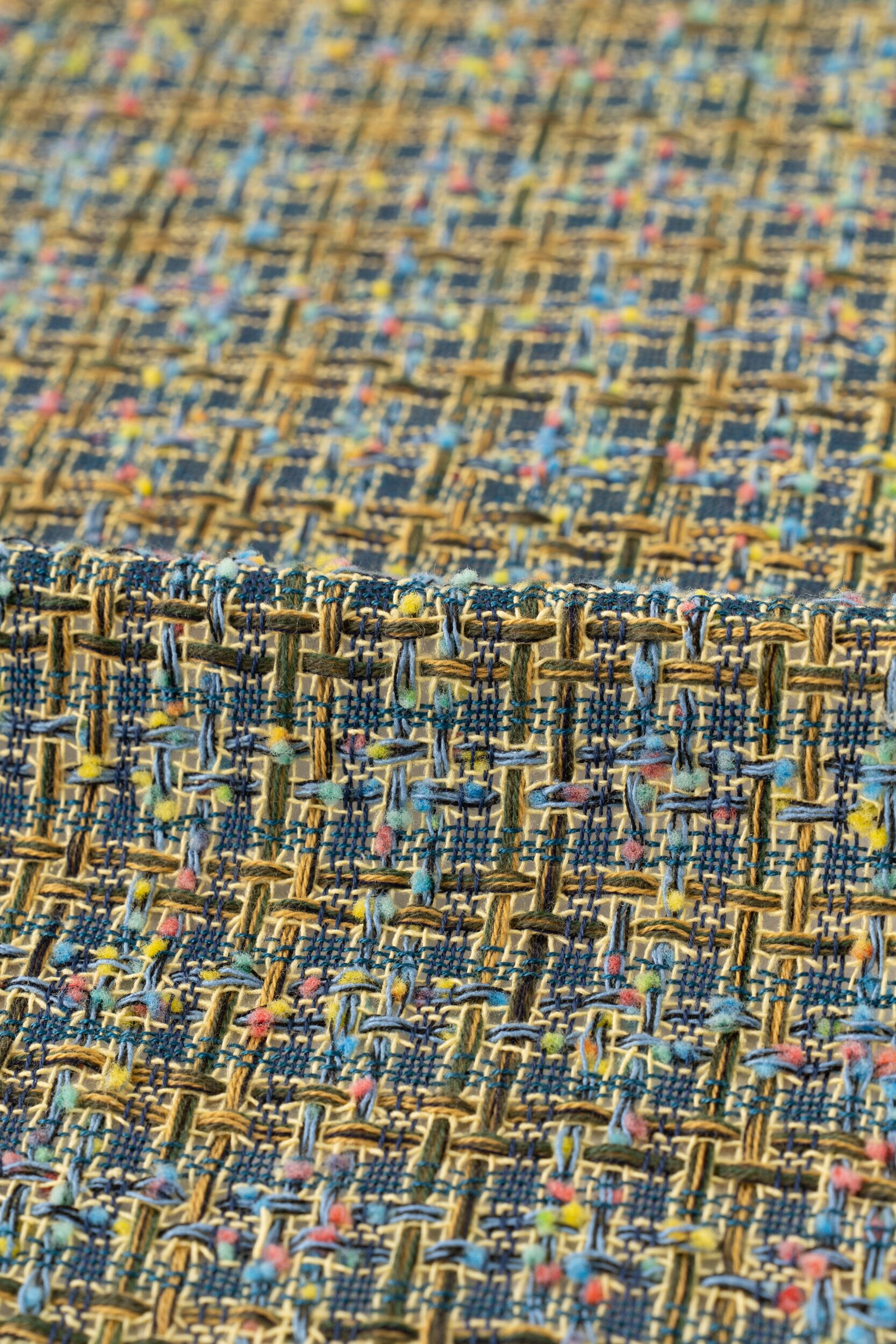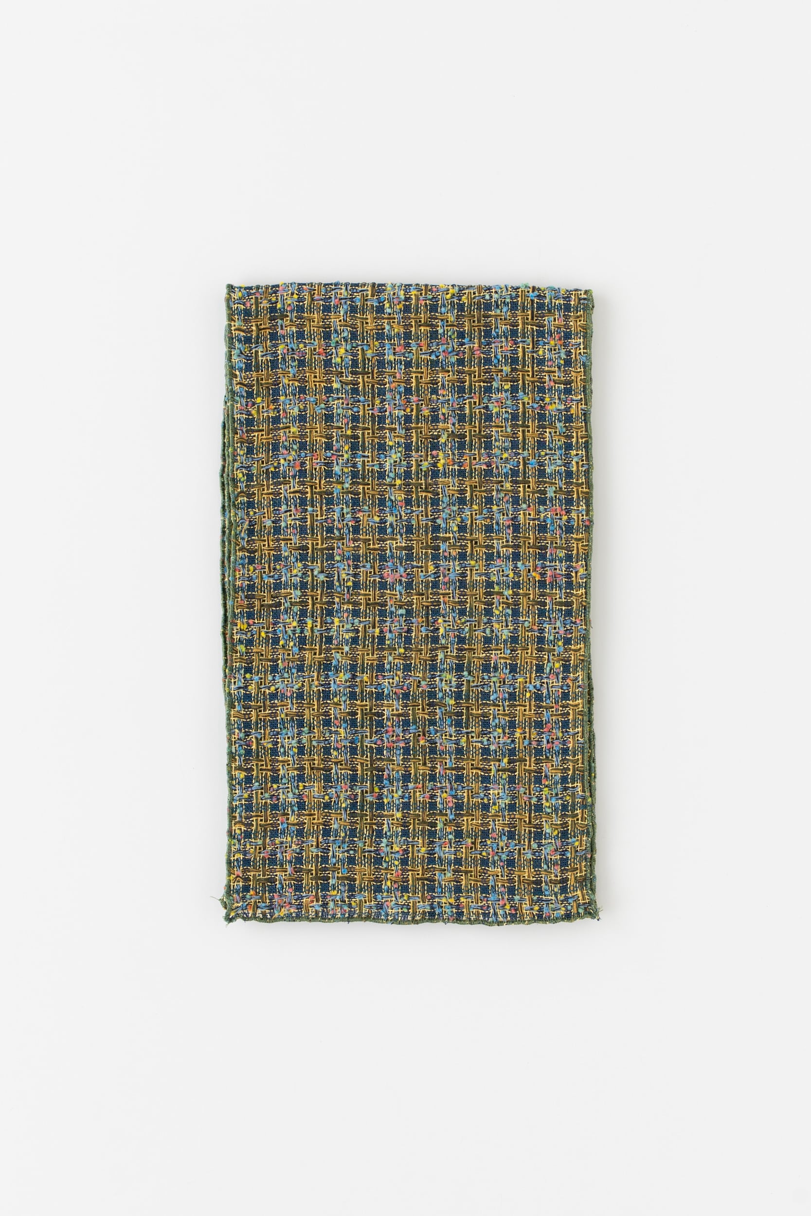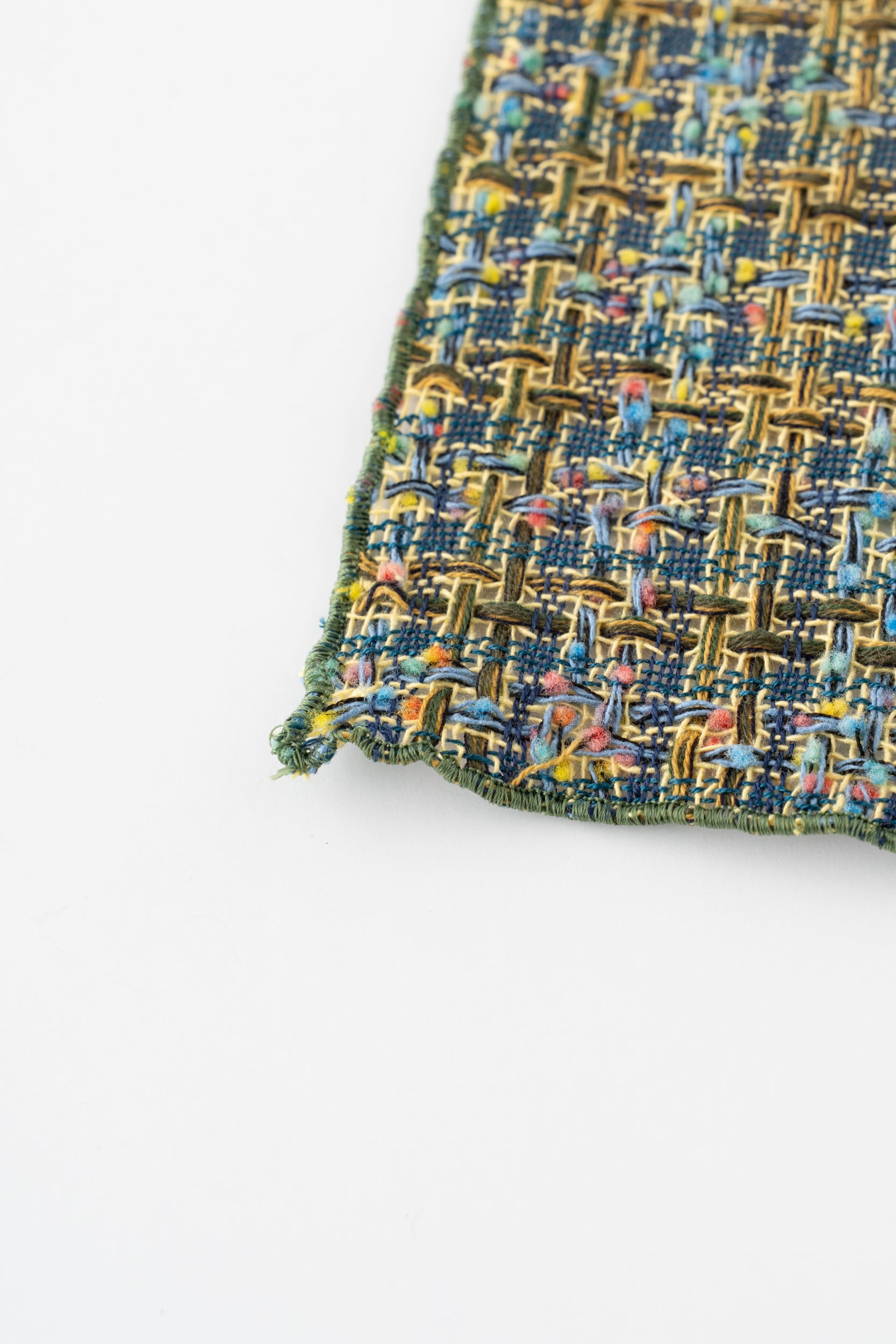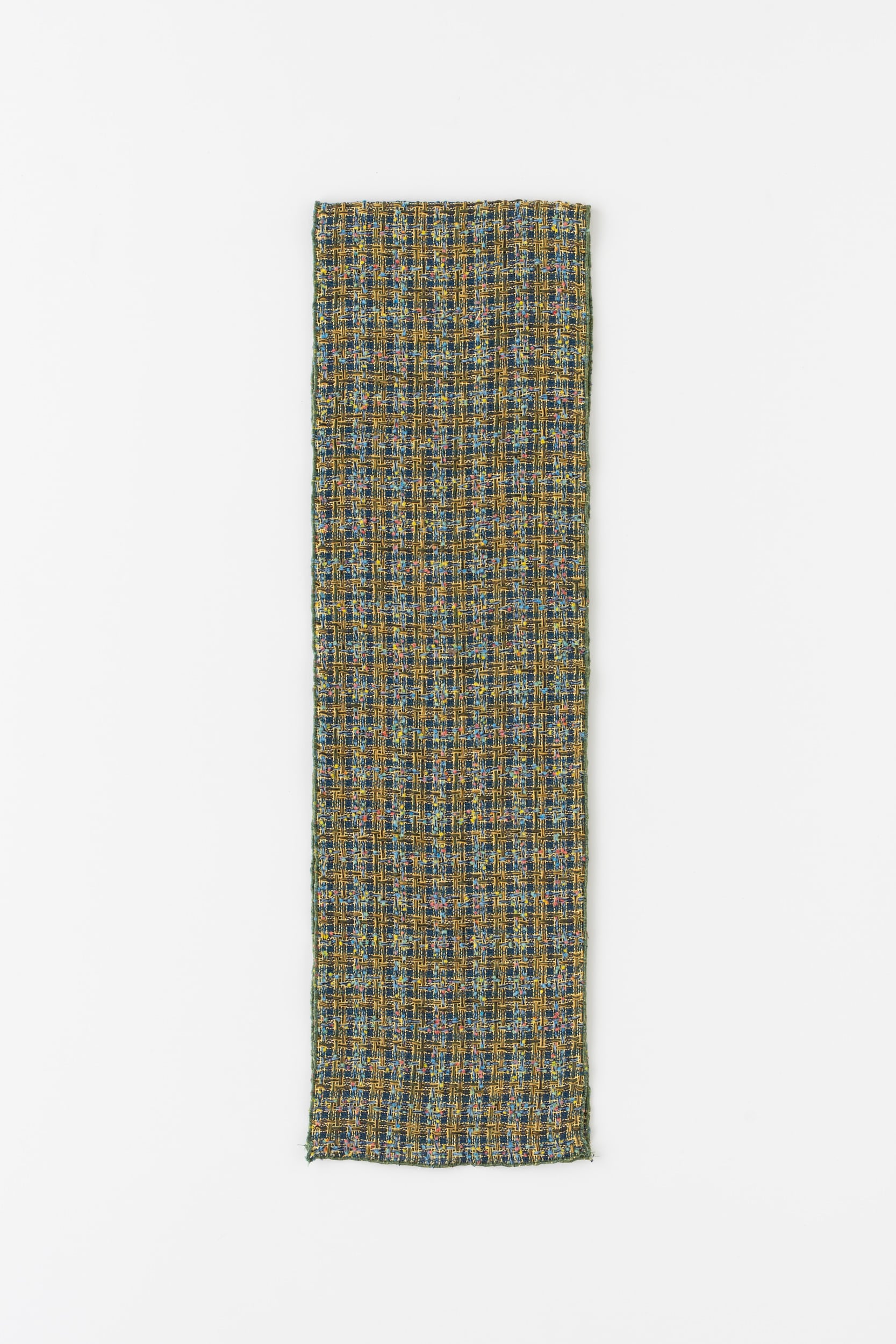 残糸は長さがバラバラなため、経糸に使用することは非常に難しいですが、長さが足りない経糸を、まるで手編みのように一本ずつ手で織り込んで仕上げることで実現することができました。