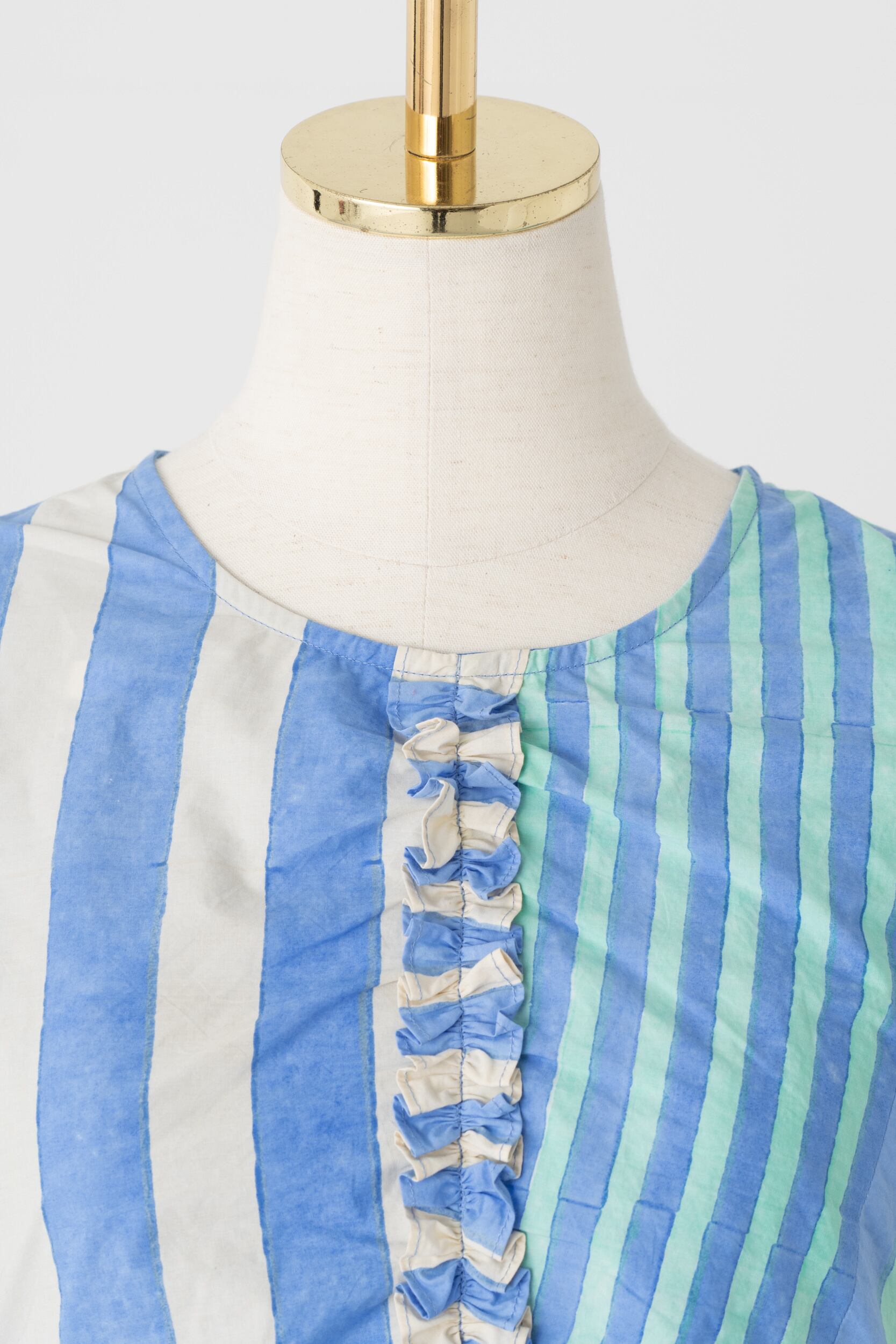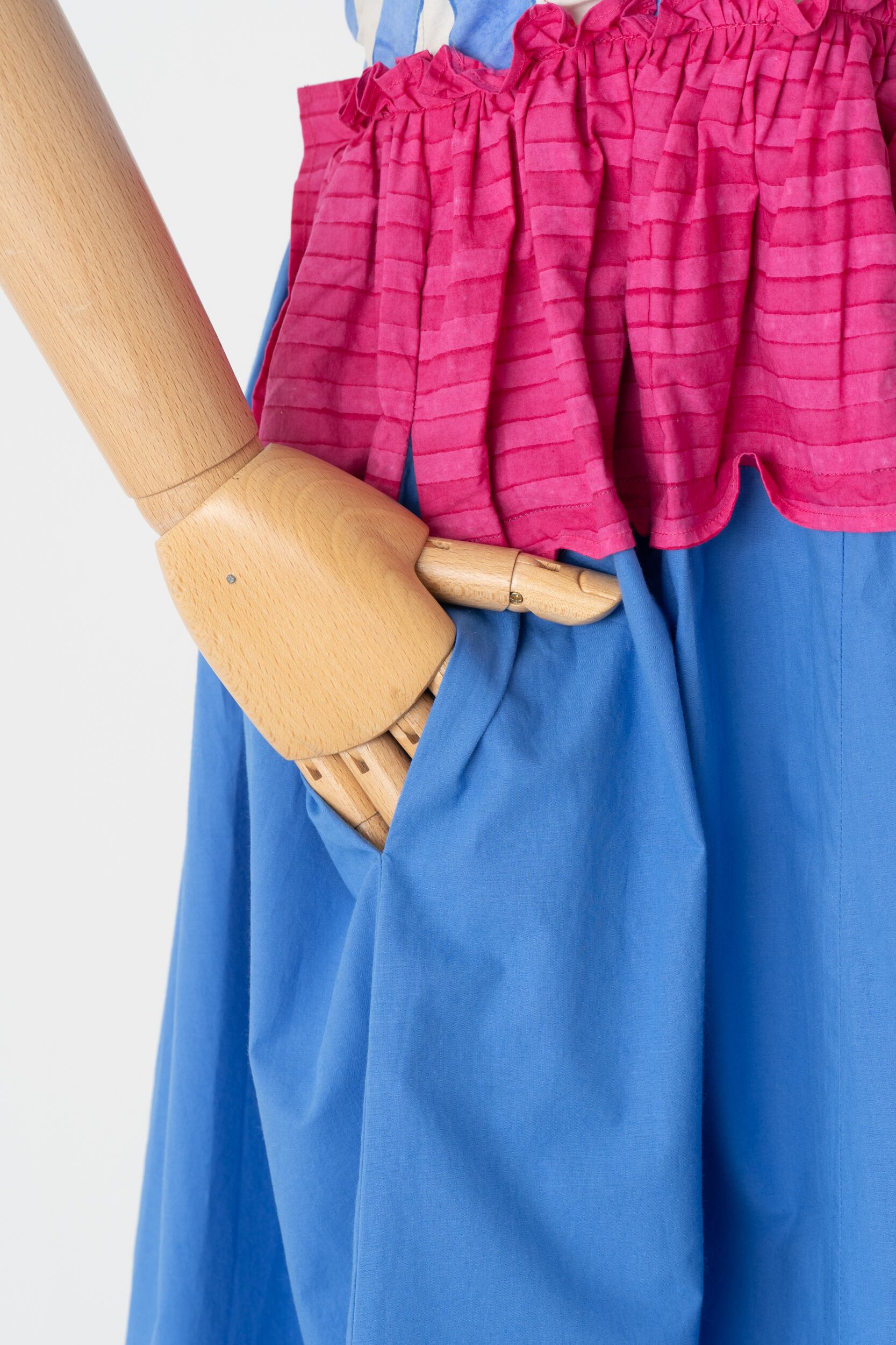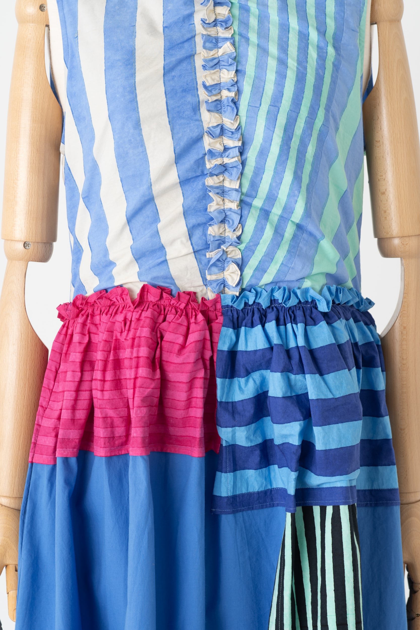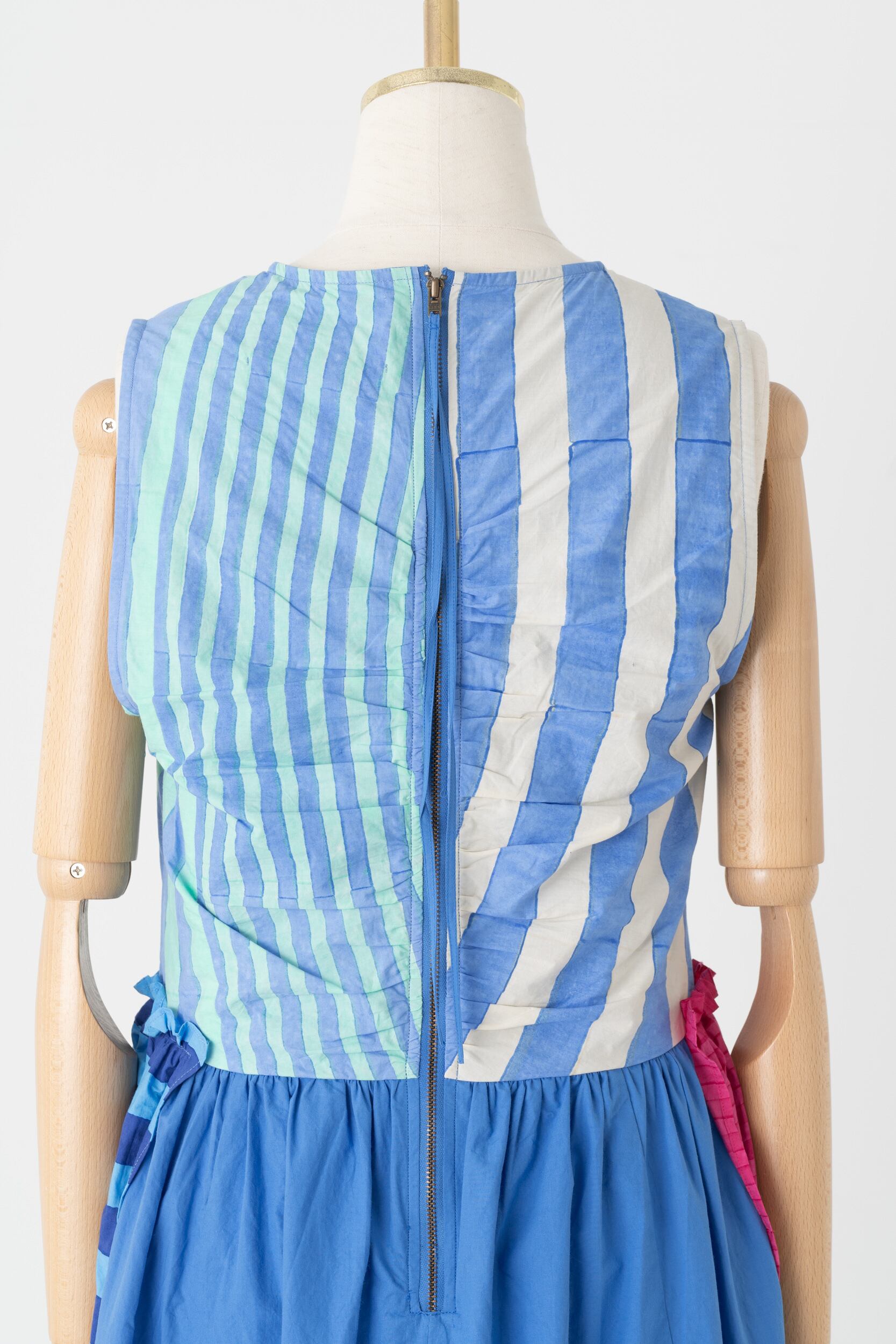上部のプリーツとギャザーから、カラフルなストライプのパッチワークで飾られた流れるようなスカートへ、ボリューム感のある美しいシルエットになっています。