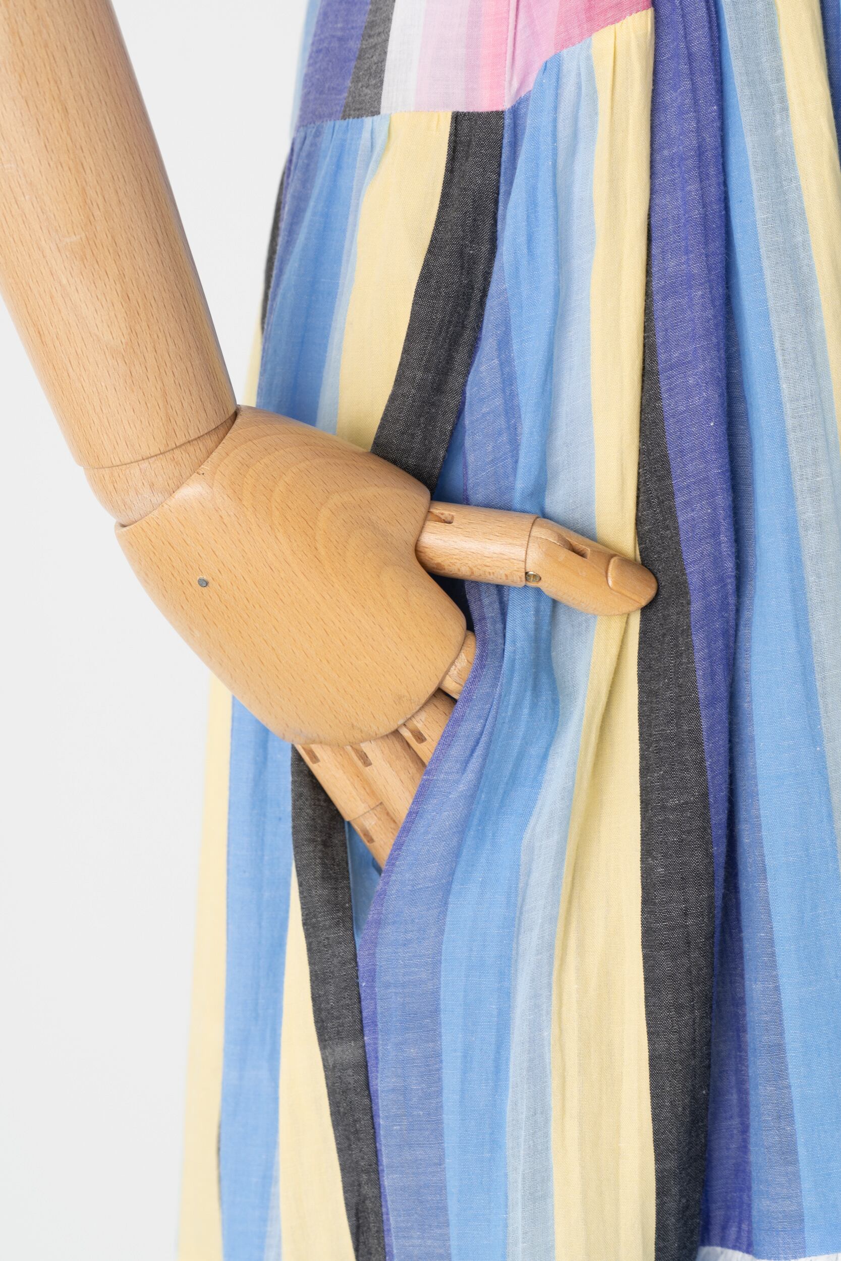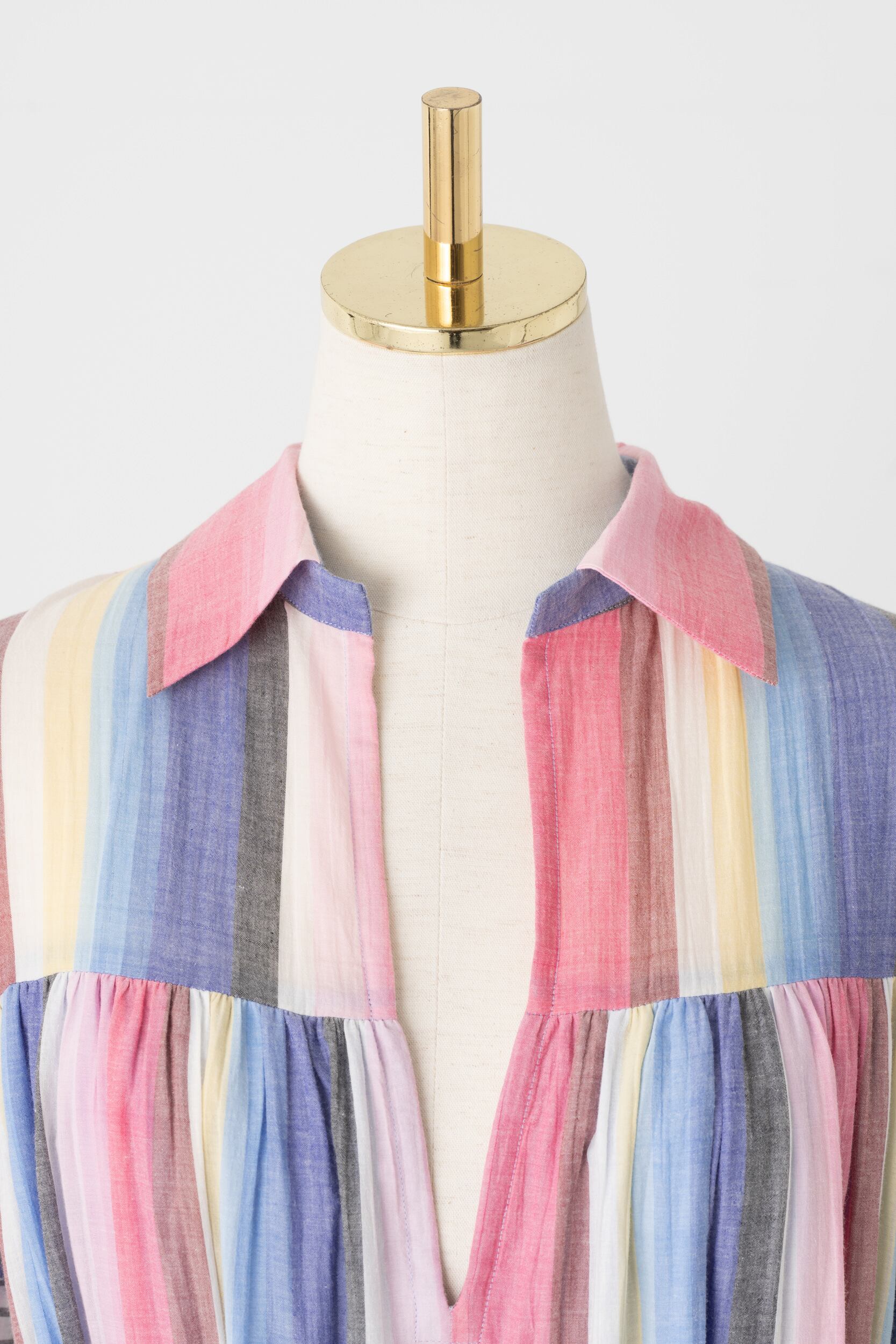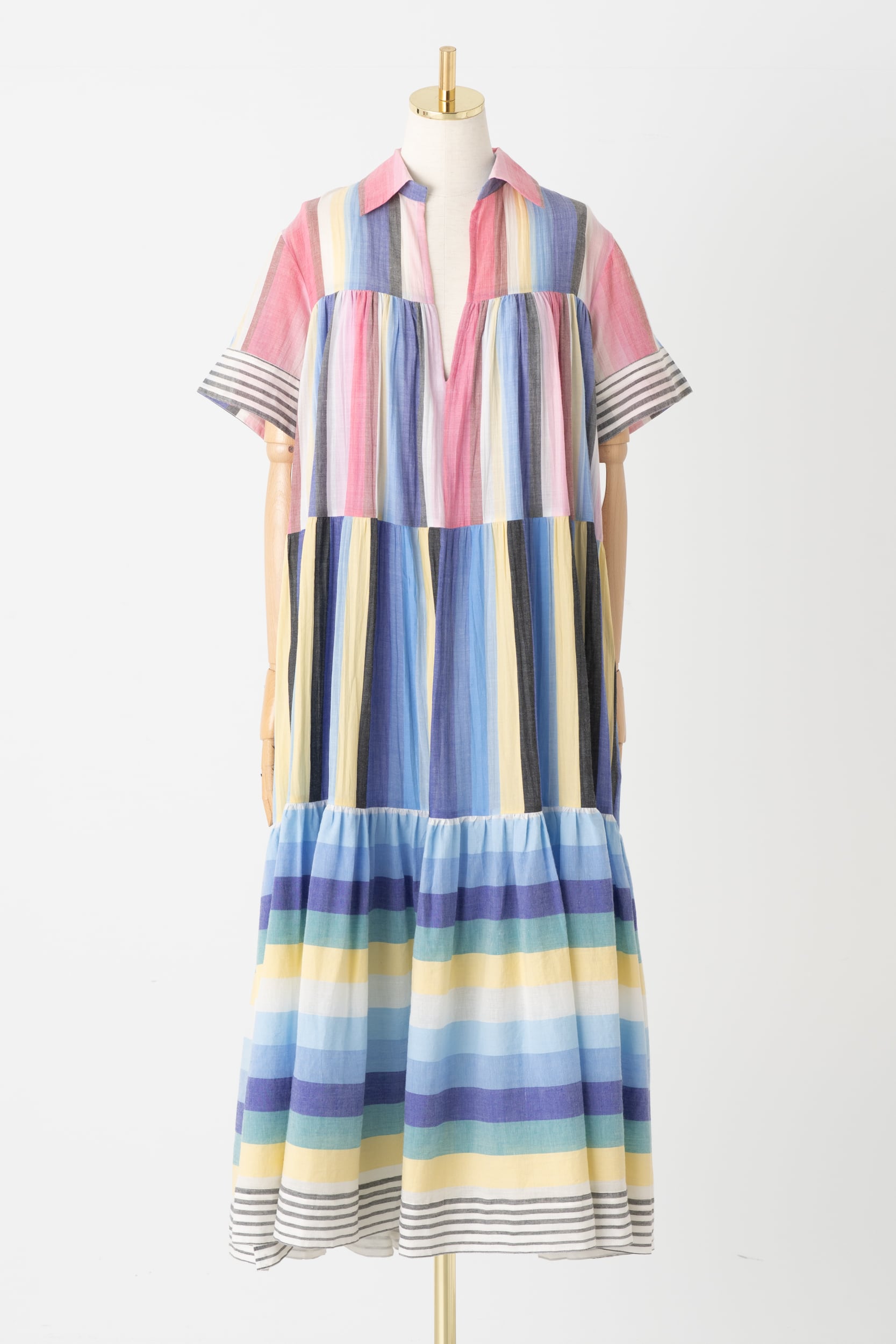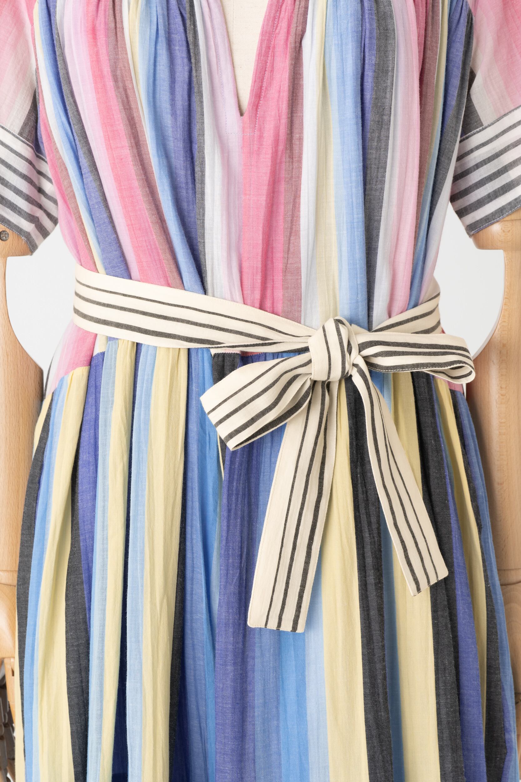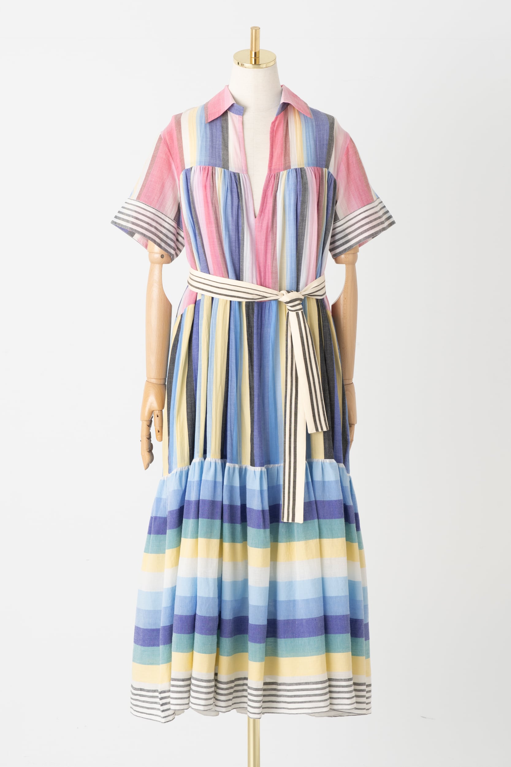 軽やかなインド綿を使用し、ストライプを遊び心がたっぷり詰め込まれた一着をセレクトしました。ウエストにベルトを締めるとシルエットが引き締まり、洗練された印象にしてくれます。インド綿ならではの夏にうれしい涼やかな肌触りと、明るい配色でお届けいたします。