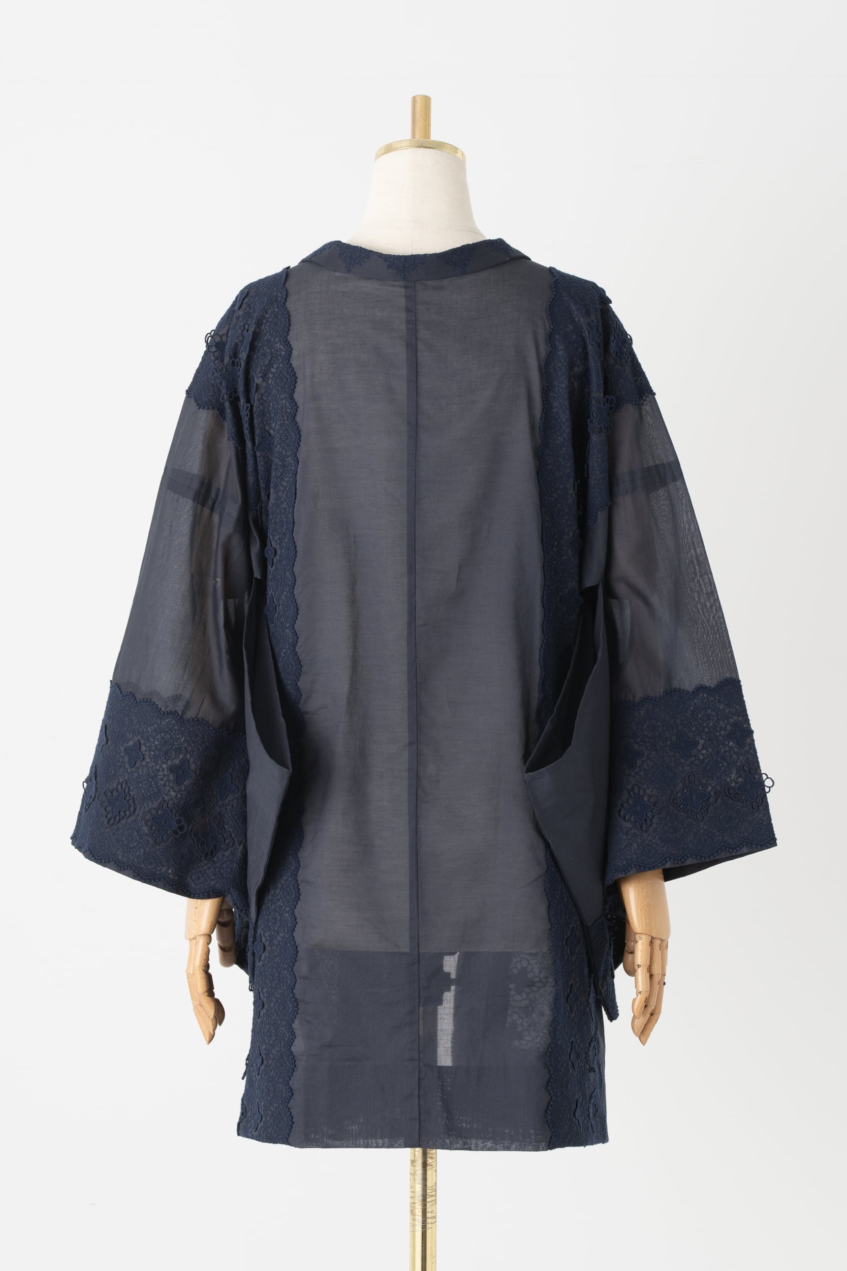 ブラウスなどにも用いられる細い糸で織られた上質な生地は、ほんのり透け感があり、浮かび上がる刺繍の存在感を引き立てます。さりげない柄の表情が、いつもとは少し違うときめきを添えてくれる羽織です。