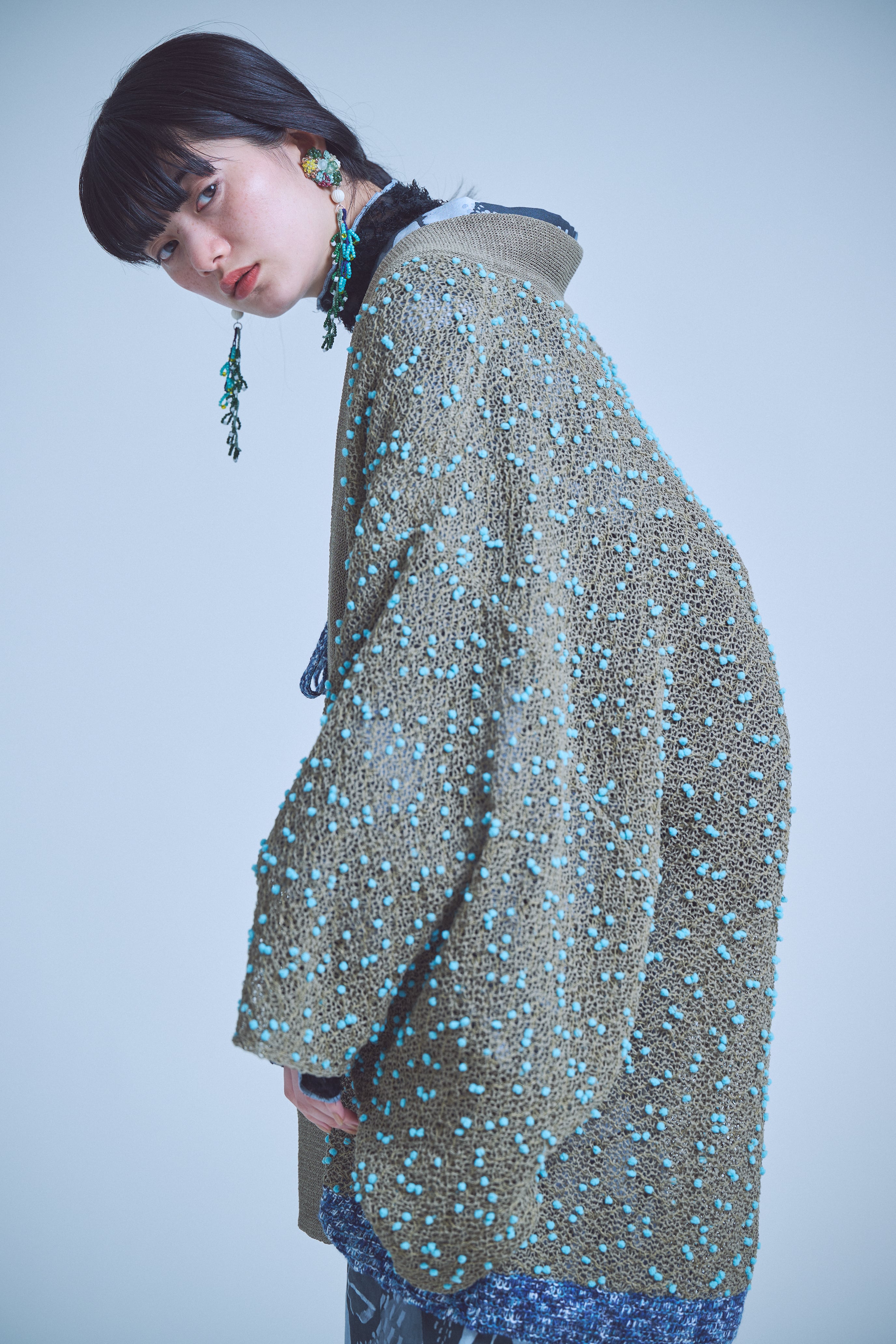 編み目を大きくとり透け感を活かすことで、編み込まれたポンポンが浮かぶように見える、不思議な仕上がりを実現しました。